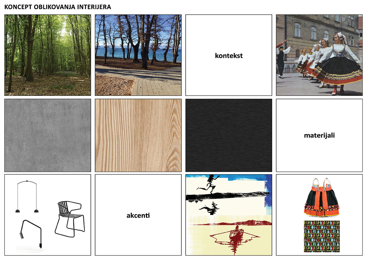 Interijer je rješavan multidiscilinarno te su uključeni produkt dizajneri i ilustrator kako bi se ostvario potpuniji i specifičniji rezultat. Koncept interijerskog rješenja usmjeren je ka postizanju gotovo spartanskog uređenja, koje otvorenošću i dinamikom prostora povezuje interijer i eksterijer. Kao nadogradnja na elementarni pristup oblikovanju interijera unose se akcenti u vidu ilustracija Danijela Žeželja te tepiha s koloritom i grafizmom krčkih nošnji.