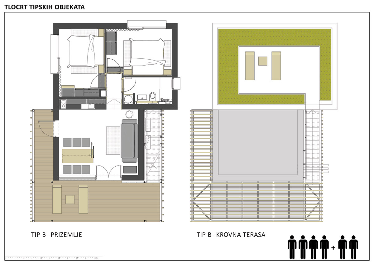 Razdvajanje osnovnih funkcionalnih cjelina (boravak-spavanje) manifestira se oblikovanjem dvaju volumena suprotnog karaktera. Prizemni tipovi formiraju se smicanjem volumena u horizontalnom, a katnice u vertikalnom smjeru.