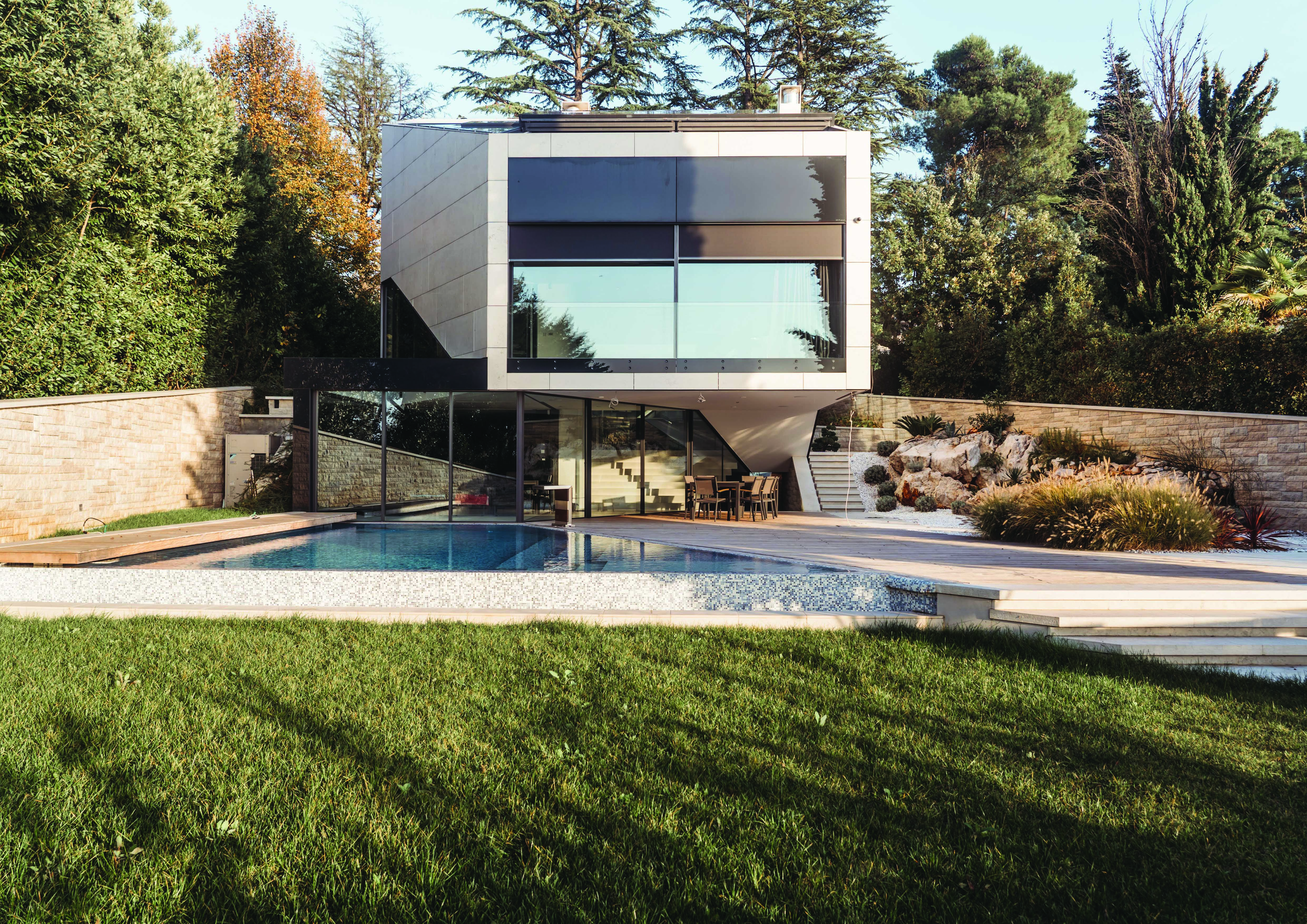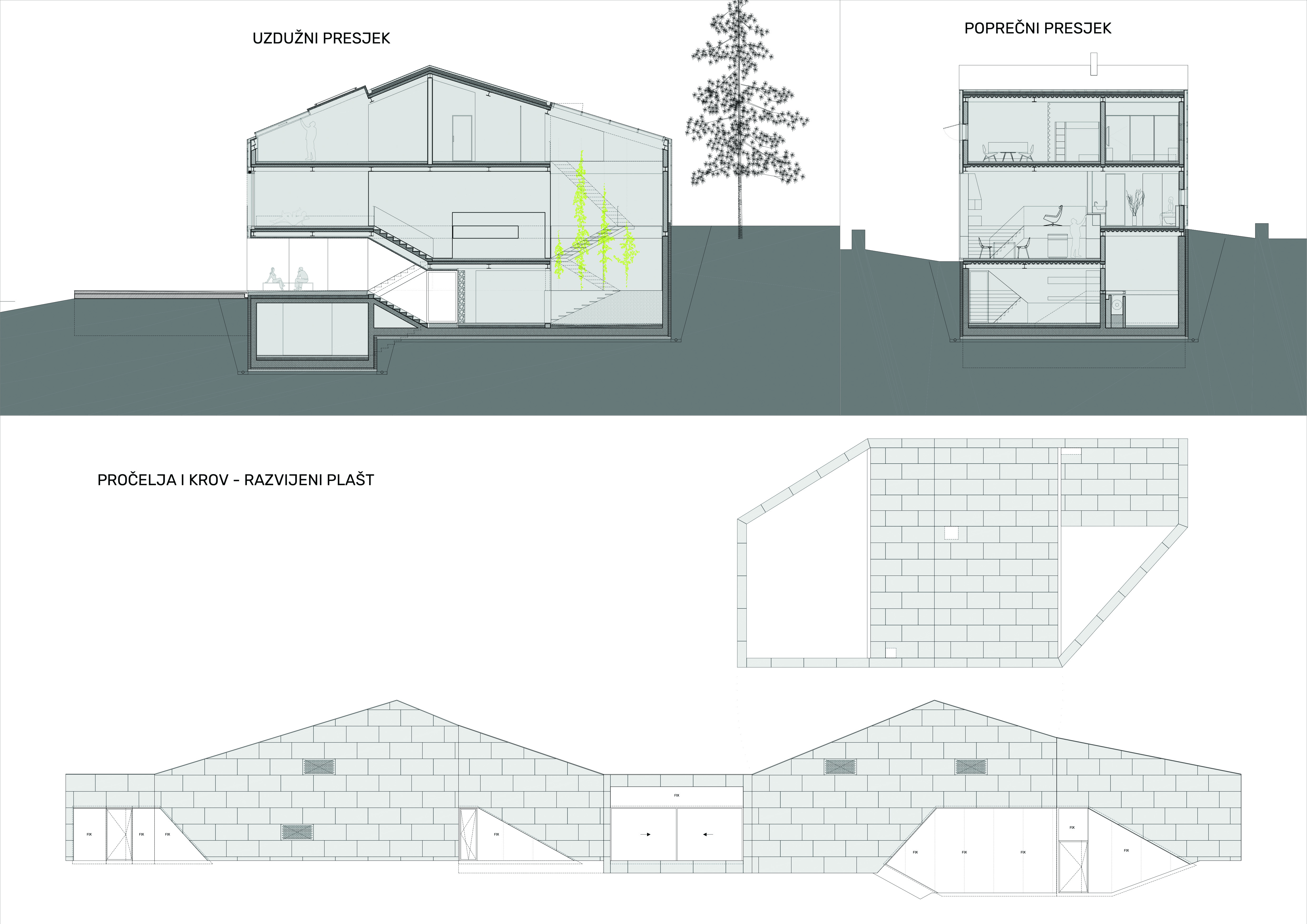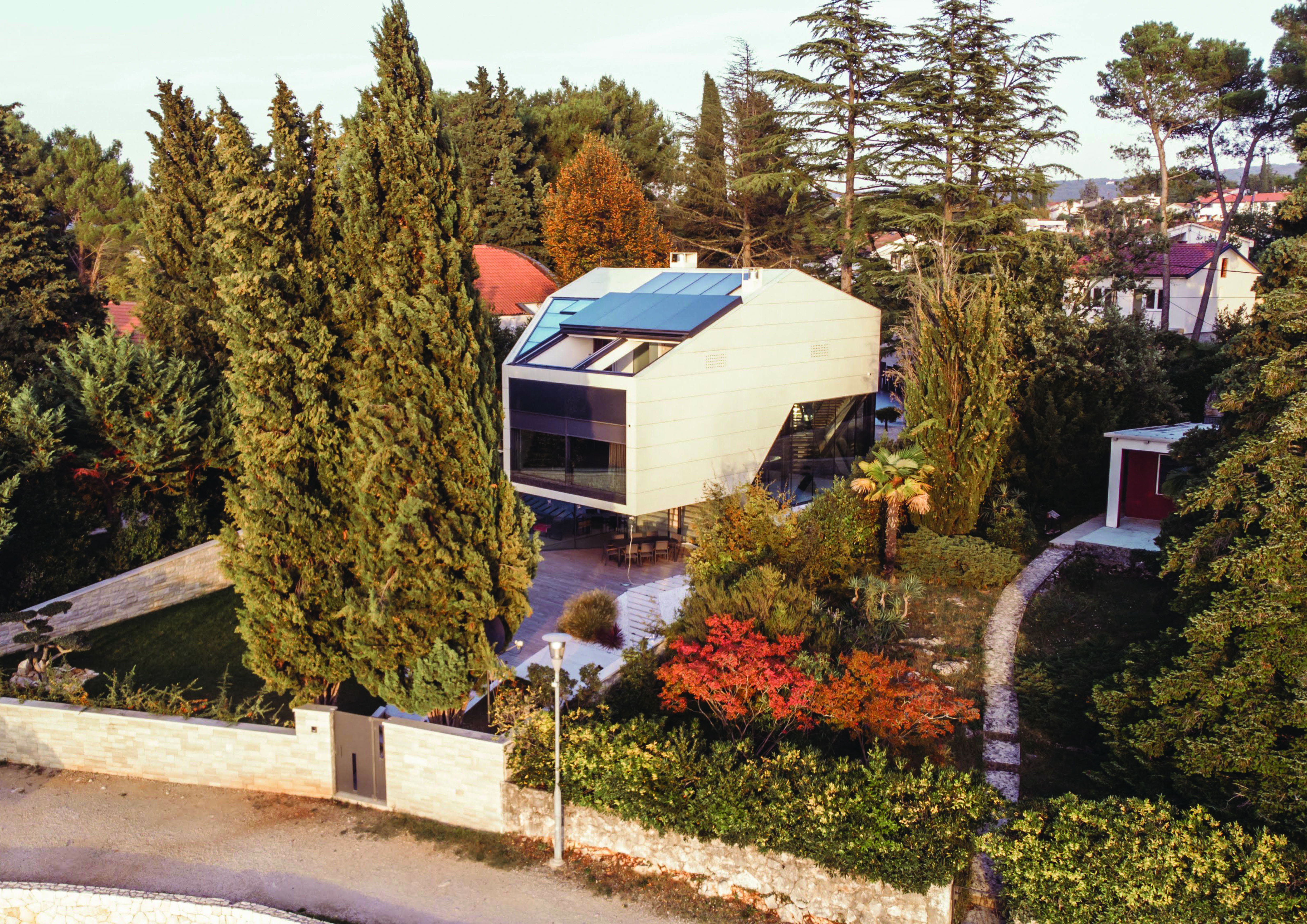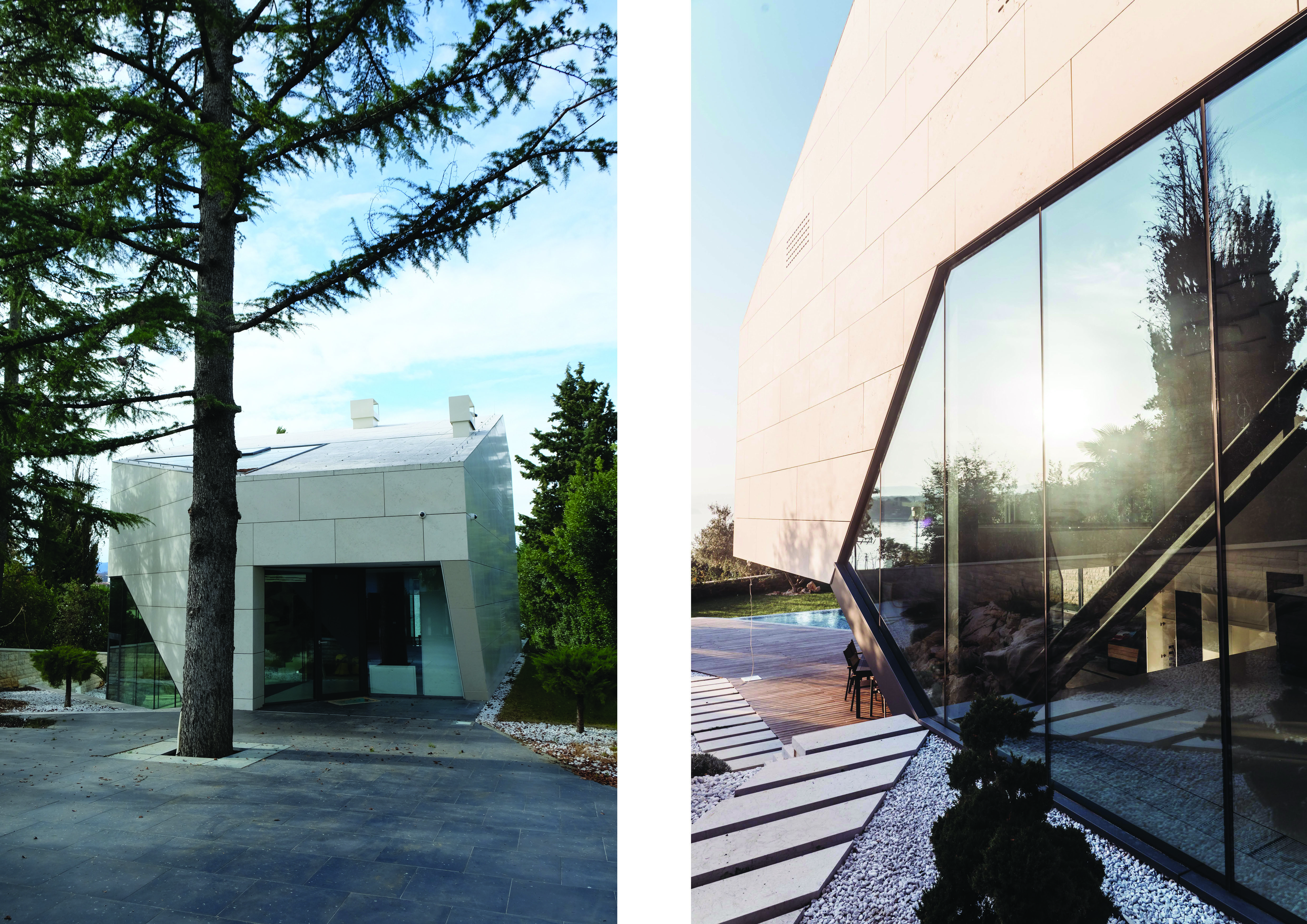 Vila P koncipirana je kao cjeloviti životni prostor s nizom međusobno povezanih polunivoa putem kojih se različite funkcije stanovanja nadovezuju i isprepliću. Osnovna dispozicija sadržaja produkt je konceptualnih elemenata: tečne i isprepletene cirkulacije, ostvarivanja kvalitetnih vizura i praćenja topografije terena, te neposrednog povezivanja vanjskog i unutarnjeg prostora. Kontinuirana kružna veza omogućava slobodnu cirkulaciju i pristup različitim funkcionalnim grupama. Funkcionalna shema i odnosi prostorija omogućavaju nekoliko osnovnih načina korištenja – privatni: intimni (za dvoje), poluprivatni (djeca, unuci ili bliski prijatelji), i javni (druženja ili proslave i sl.). Lomovi volumena posljedica su uklapanja u odredbe koje definiraju najveću dopuštenu izgrađenost i udaljenosti od rubova građevinske čestice. Ovisno o točki gledanja te smjeru kretanja unutar kuće i po okolnom terenu, lomovi volumena u funkcionalnom smislu otvaraju vizure, oblikuju dijelove okoliša (popločene ili travnate) namijenjene različitim oblicima korištenja ili različitom hortikulturalnom tretmanu. Radi poštivanja propisanih visina izgradnje i programskih postavki formiran je dvostrešni krov sa sljemenom okomitim na uzdužnu os parcele, što dosljedno prati dinamično razlomljeno oblikovanje i međusobno nadovezivanje različitih nivoa unutar kuće. Tretman pročelja proizlazi iz orijentacije, funkcije i tokova kretanja unutar kuće i prema van, te se formiraju fronte ostakljenih i punih, kamenom obloženih dijelova. Nosivu konstrukciju zgrade čine podzemni obodni armiranobetonski zidovi te čelična rešetkasta nosiva konstrukcija nadzemno s ispunom. Sve međukatne konstrukcije, kao i konstrukcija krova su dio osnovnog čeličnog nosivog sustava sa spregnutim AB-pločama u profiliranom limu.