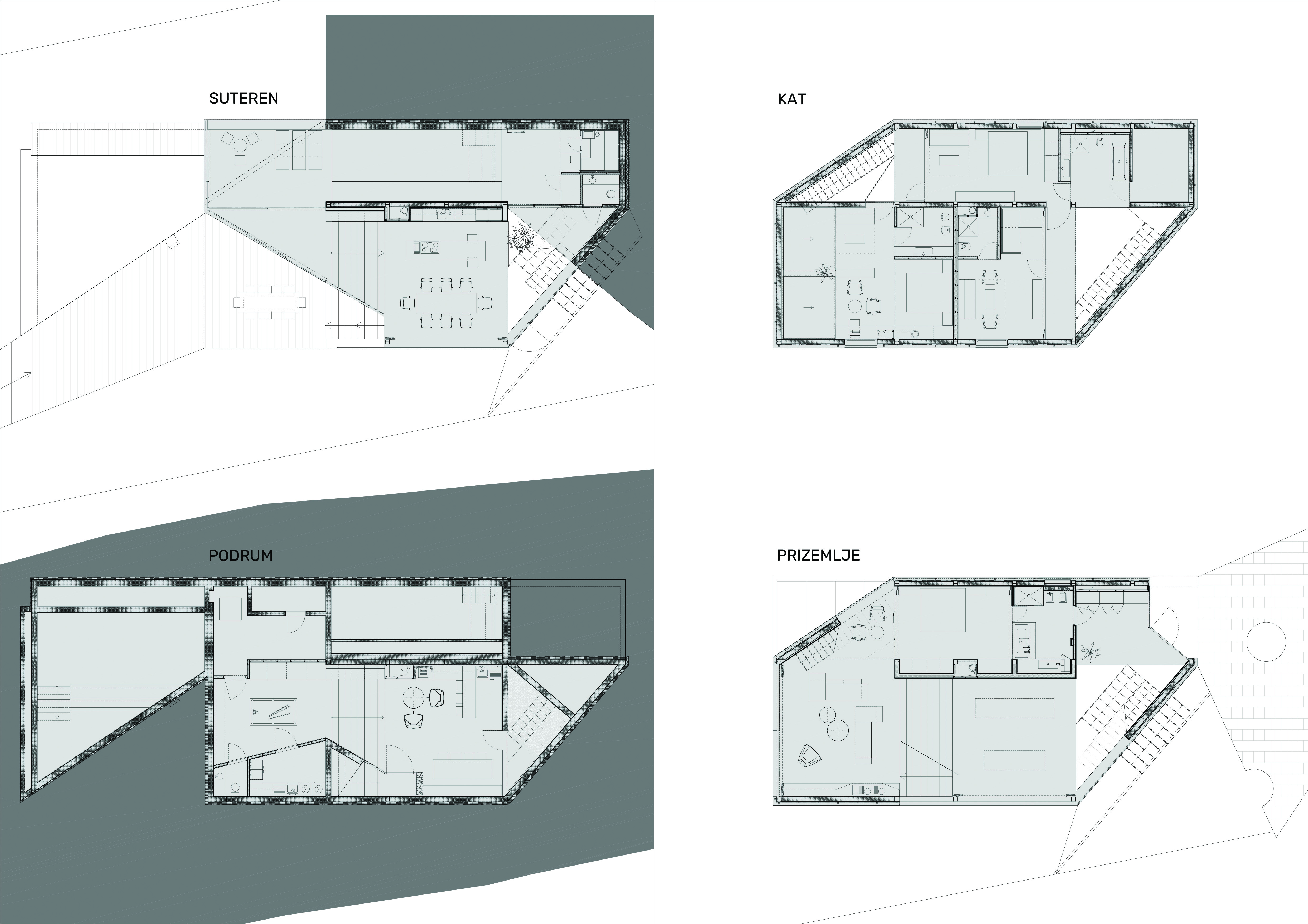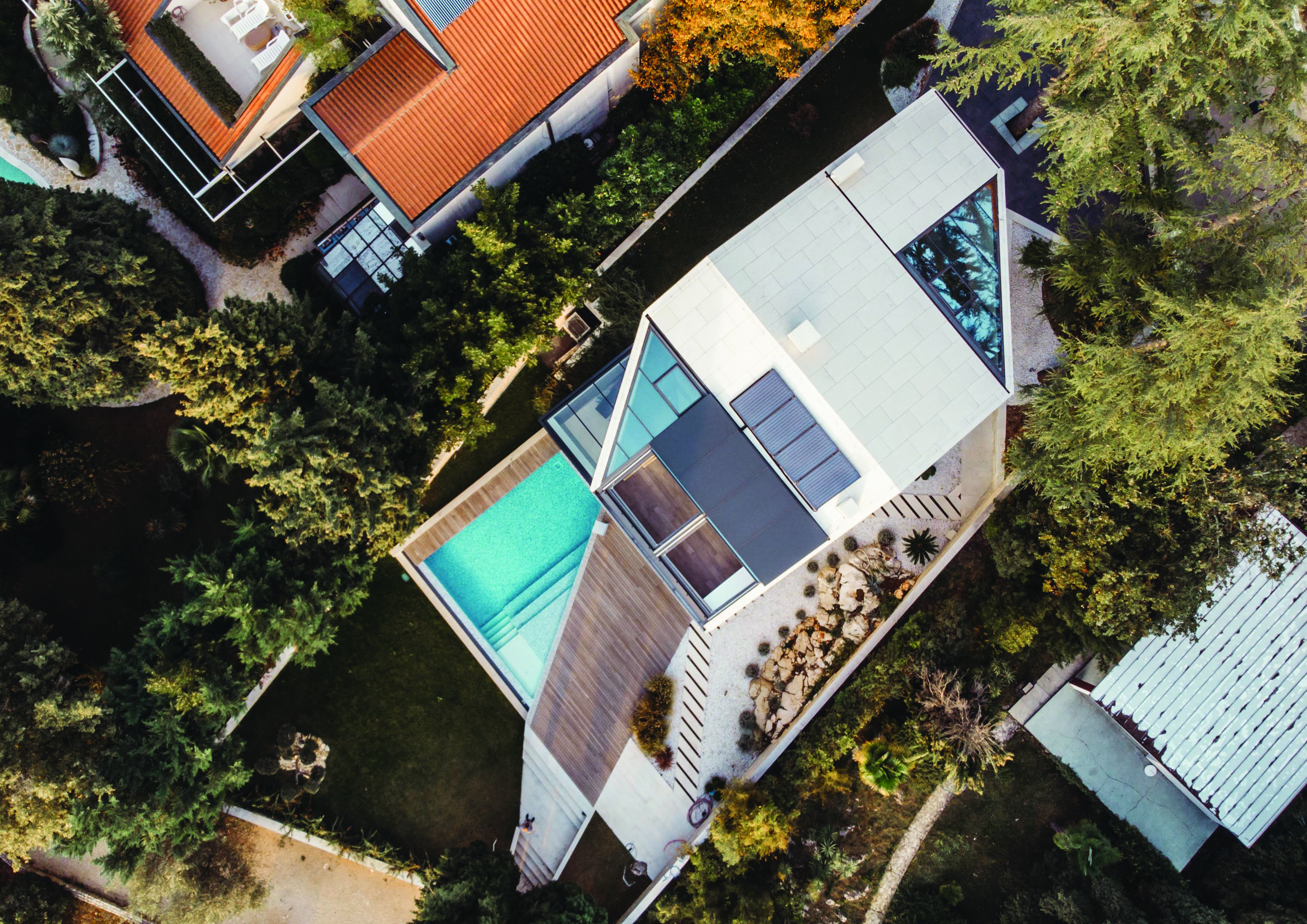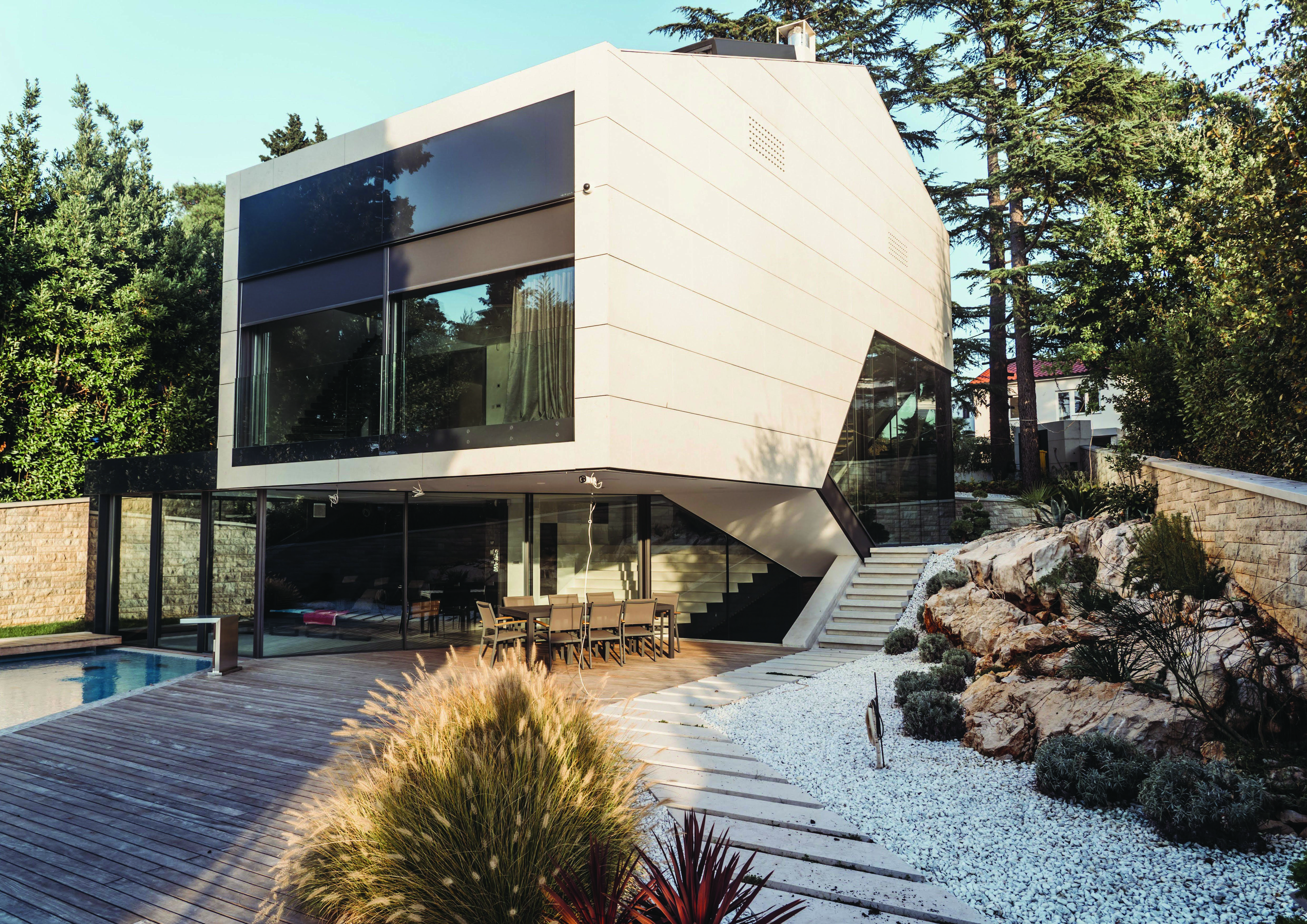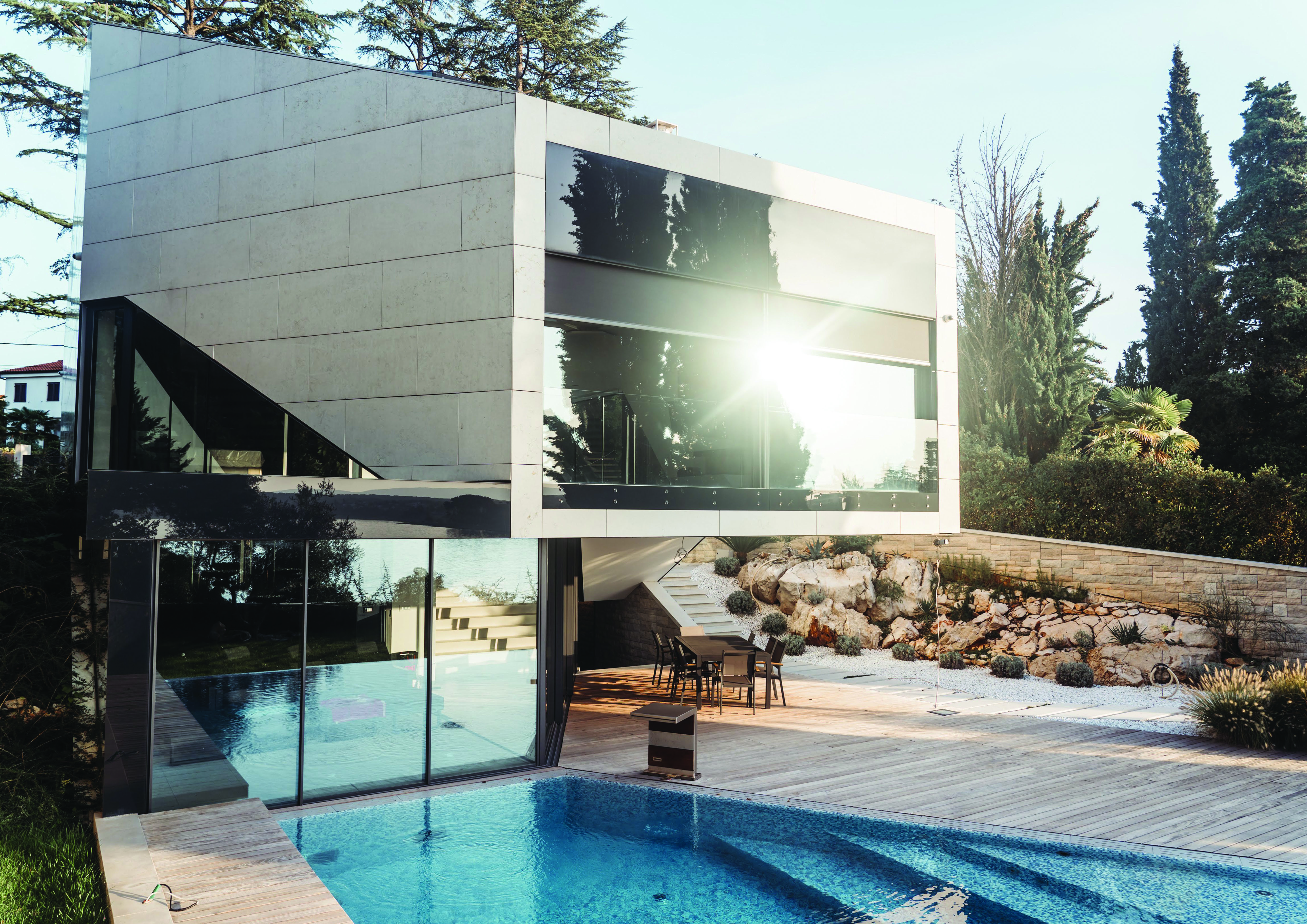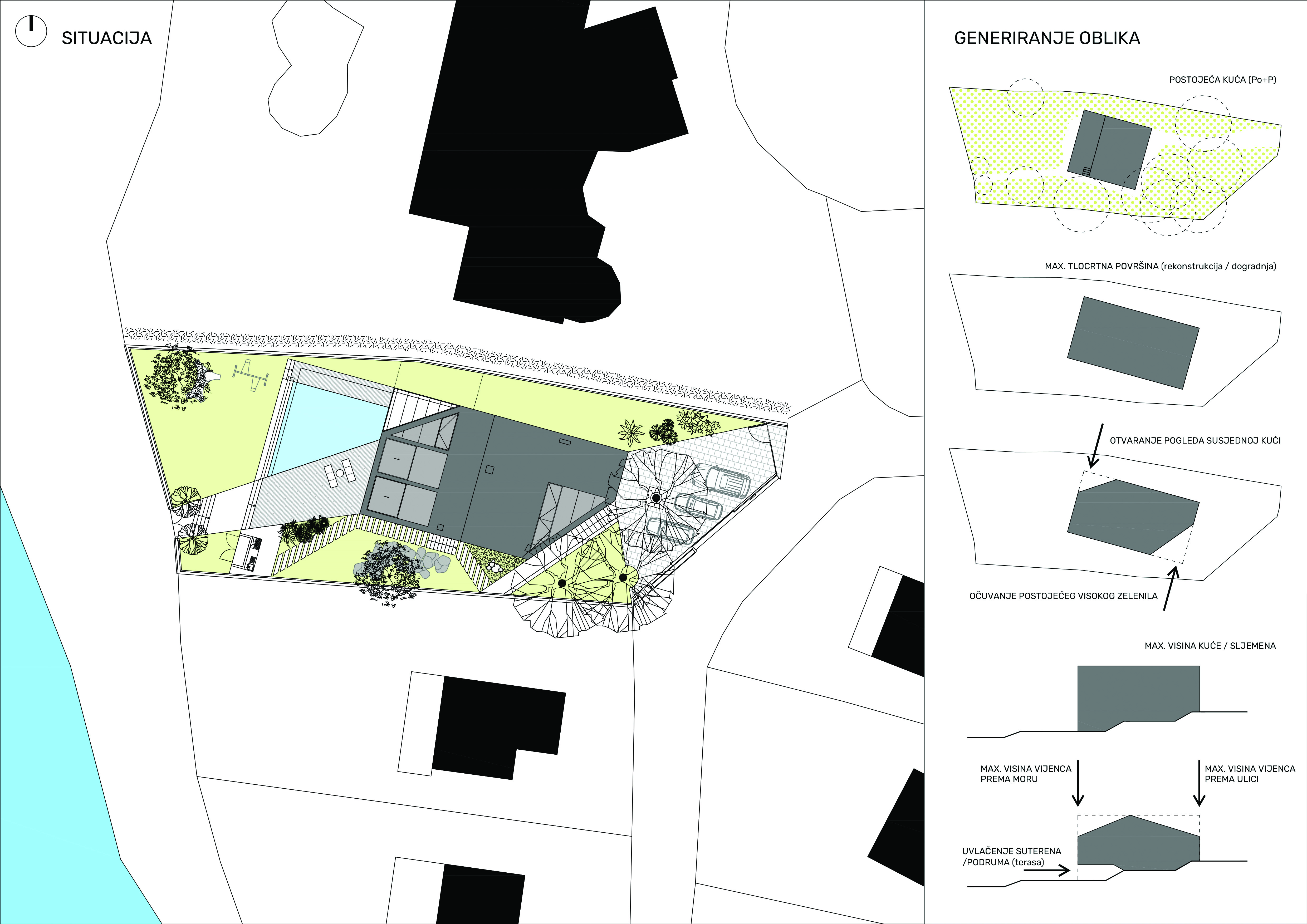 Vila P koncipirana je kao cjeloviti životni prostor s nizom međusobno povezanih polunivoa putem kojih se različite funkcije stanovanja nadovezuju i isprepliću. Osnovna dispozicija sadržaja produkt je konceptualnih elemenata: tečne i isprepletene cirkulacije, ostvarivanja kvalitetnih vizura i praćenja topografije terena, te neposrednog povezivanja vanjskog i unutarnjeg prostora. Kontinuirana kružna veza omogućava slobodnu cirkulaciju i pristup različitim funkcionalnim grupama. Funkcionalna shema i odnosi prostorija omogućavaju nekoliko osnovnih načina korištenja – privatni: intimni (za dvoje), poluprivatni (djeca, unuci ili bliski prijatelji), i javni (druženja ili proslave i sl.). Lomovi volumena posljedica su uklapanja u odredbe koje definiraju najveću dopuštenu izgrađenost i udaljenosti od rubova građevinske čestice. Ovisno o točki gledanja te smjeru kretanja unutar kuće i po okolnom terenu, lomovi volumena u funkcionalnom smislu otvaraju vizure, oblikuju dijelove okoliša (popločene ili travnate) namijenjene različitim oblicima korištenja ili različitom hortikulturalnom tretmanu. Radi poštivanja propisanih visina izgradnje i programskih postavki formiran je dvostrešni krov sa sljemenom okomitim na uzdužnu os parcele, što dosljedno prati dinamično razlomljeno oblikovanje i međusobno nadovezivanje različitih nivoa unutar kuće. Tretman pročelja proizlazi iz orijentacije, funkcije i tokova kretanja unutar kuće i prema van, te se formiraju fronte ostakljenih i punih, kamenom obloženih dijelova. Nosivu konstrukciju zgrade čine podzemni obodni armiranobetonski zidovi te čelična rešetkasta nosiva konstrukcija nadzemno s ispunom. Sve međukatne konstrukcije, kao i konstrukcija krova su dio osnovnog čeličnog nosivog sustava sa spregnutim AB-pločama u profiliranom limu.