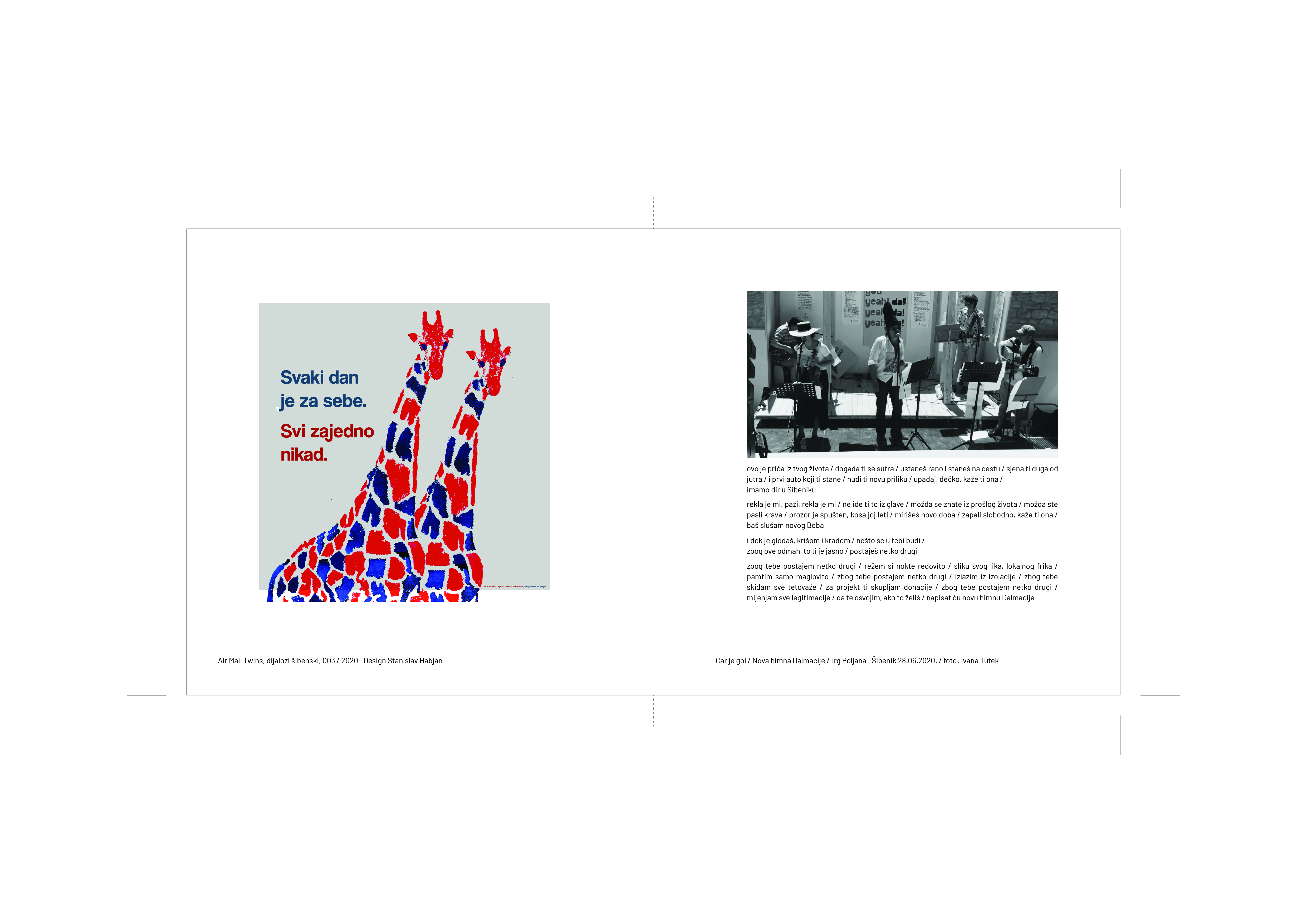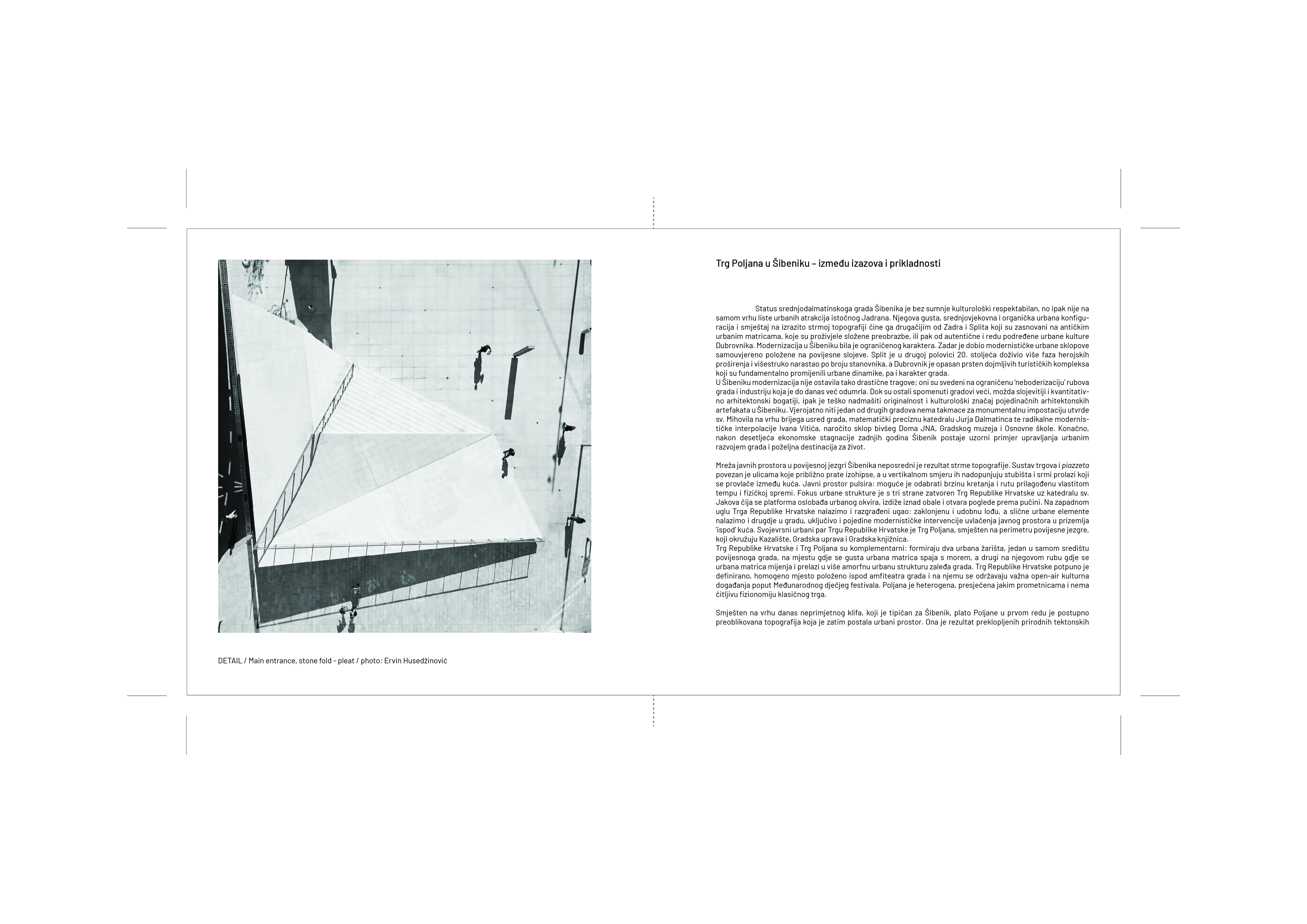 Arhitektonski projekt Trg Poljana u Šibeniku predstavljen je kao proces u svim fazama razvoja kroz prikaz brojnih umjetničkih i tehničkih suradnji ostvarenih tijekom projektiranja i izvedbe te naknadnih performansi urbanog prostora: od koncepta /dijagrami/ i razrade projektne dokumentacije /nacrti/, izvedbe /procesni transparentni kolaži/, tehničke suradnje /ACO – urban box element/, prikaza realizacije /fotografije/, dizajnerskih suradnji /Numen ForUse - nadstrešnica/, dogradnji urbanog identiteta /grafički dizajn i literatura: Air mail twins; She newsletter; She 2 izložbe/, umjetničkih performansa i poezije /Car je gol/… prisutno je brisanje granica između različitih domena umjetnosti - između arhitekture i literature, dizajna, vizualnih umjetnosti, poezije i performansa.