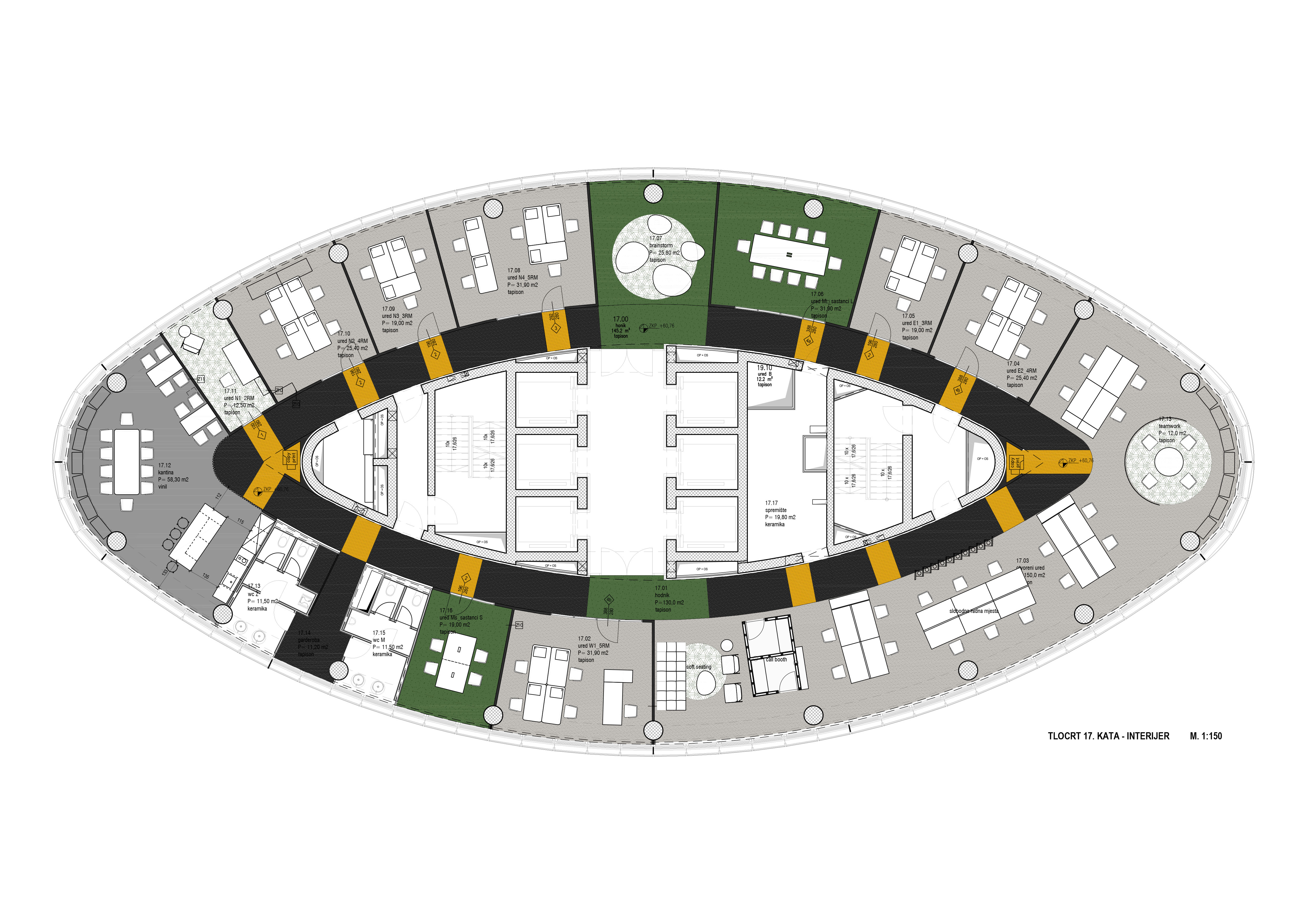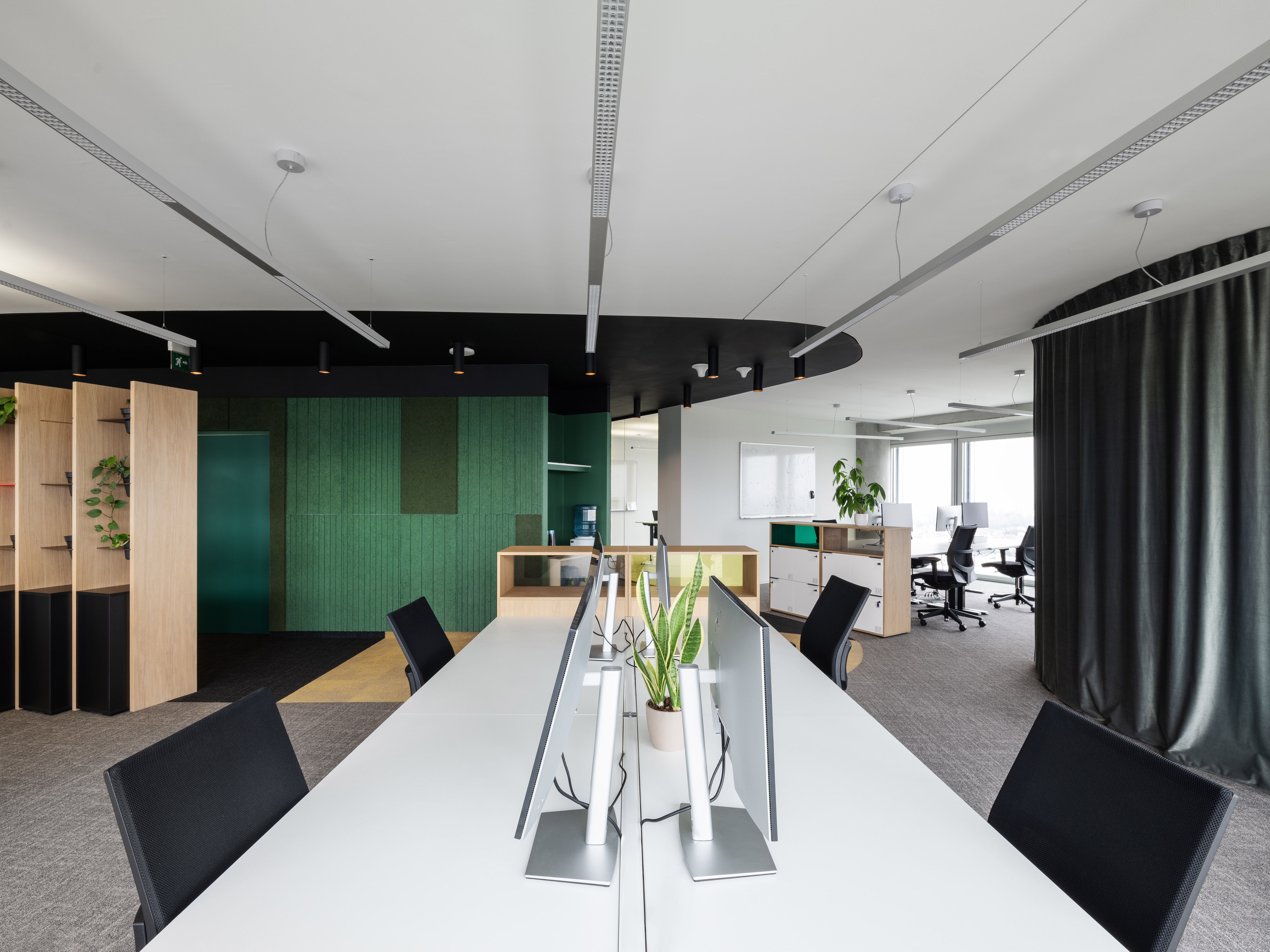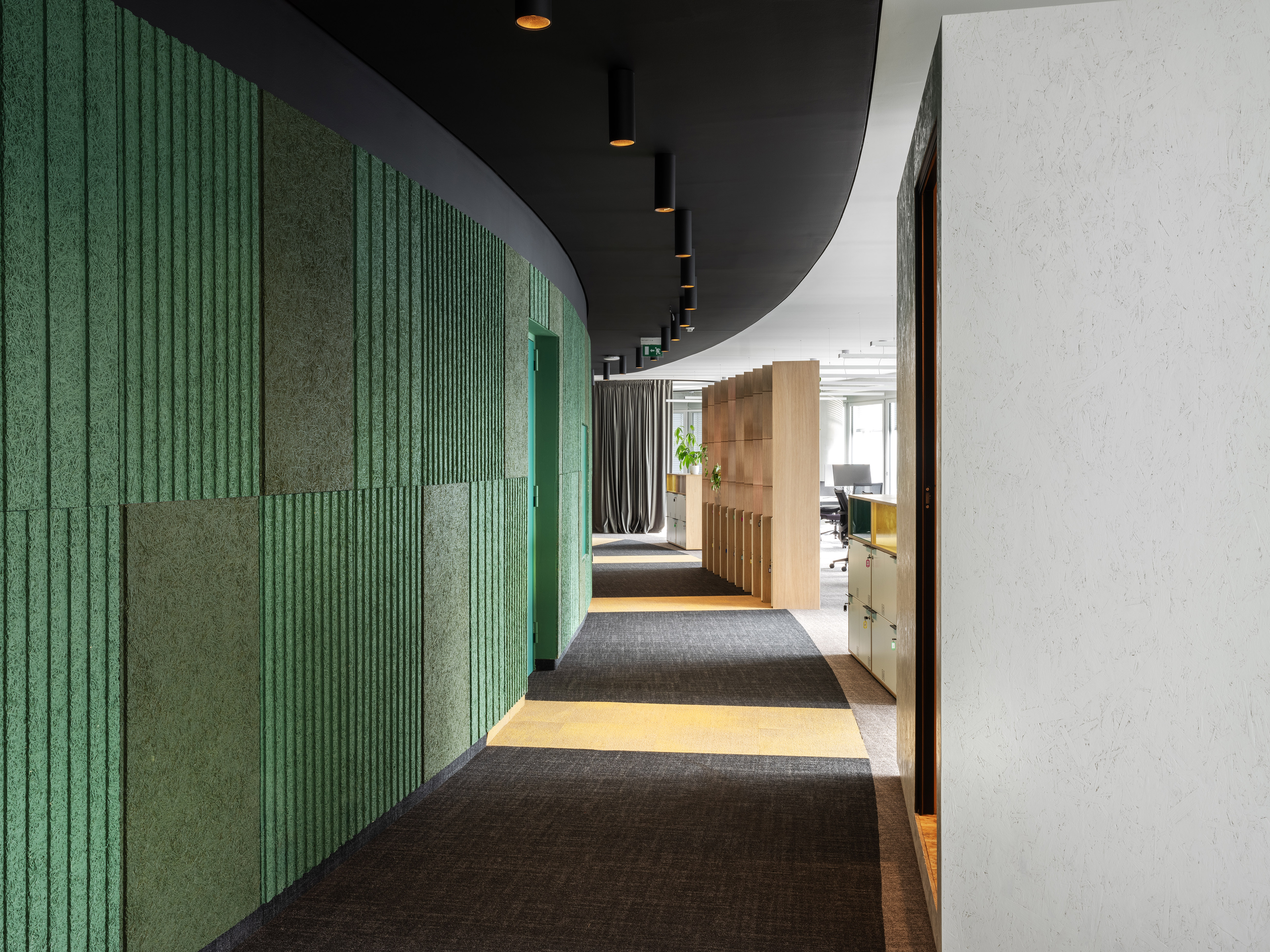 Zakrivljena elipsa jezgre nebodera, u zoni open-office obložena je akustičnim pločama u zelenkastim nijansama.