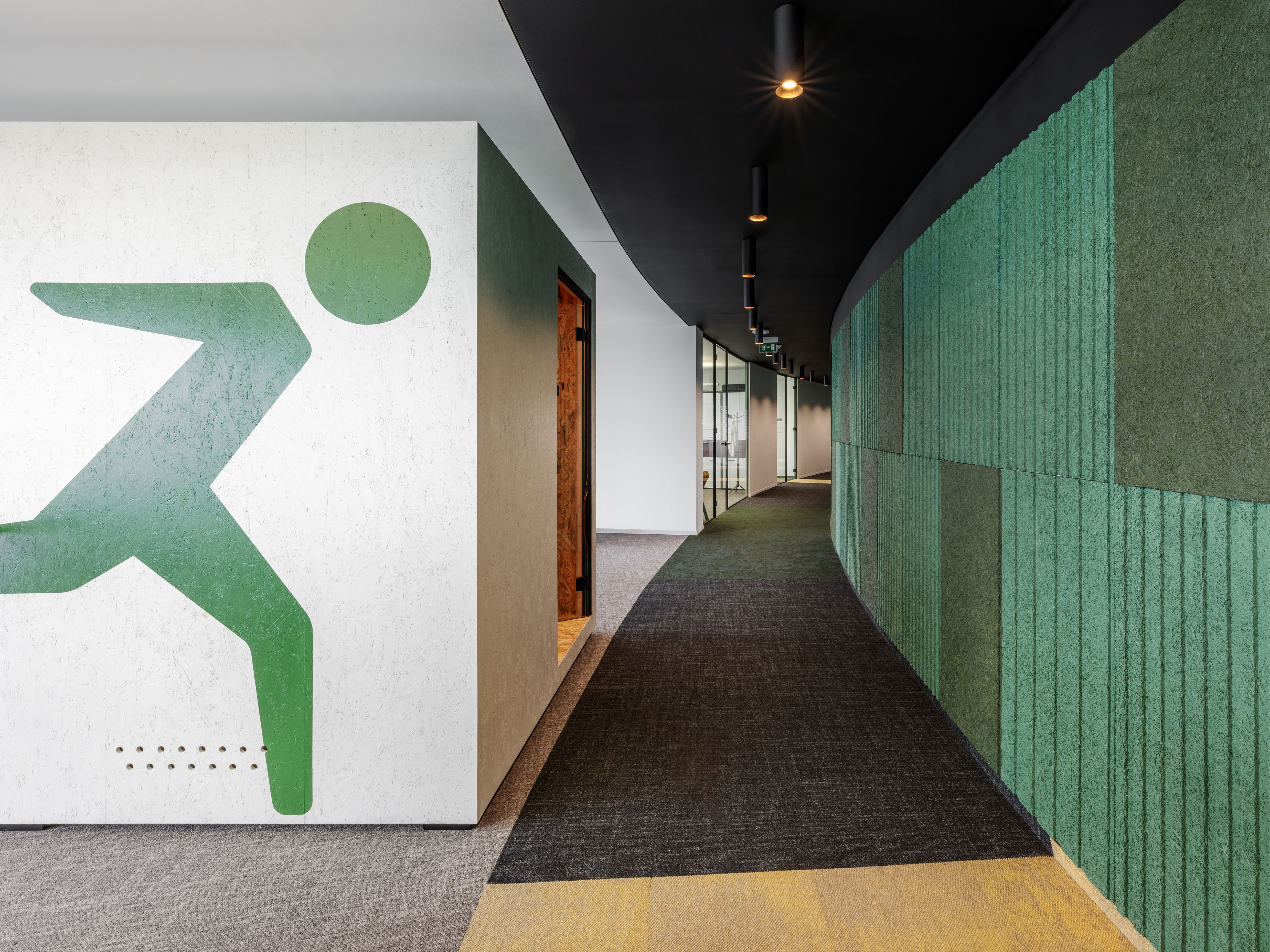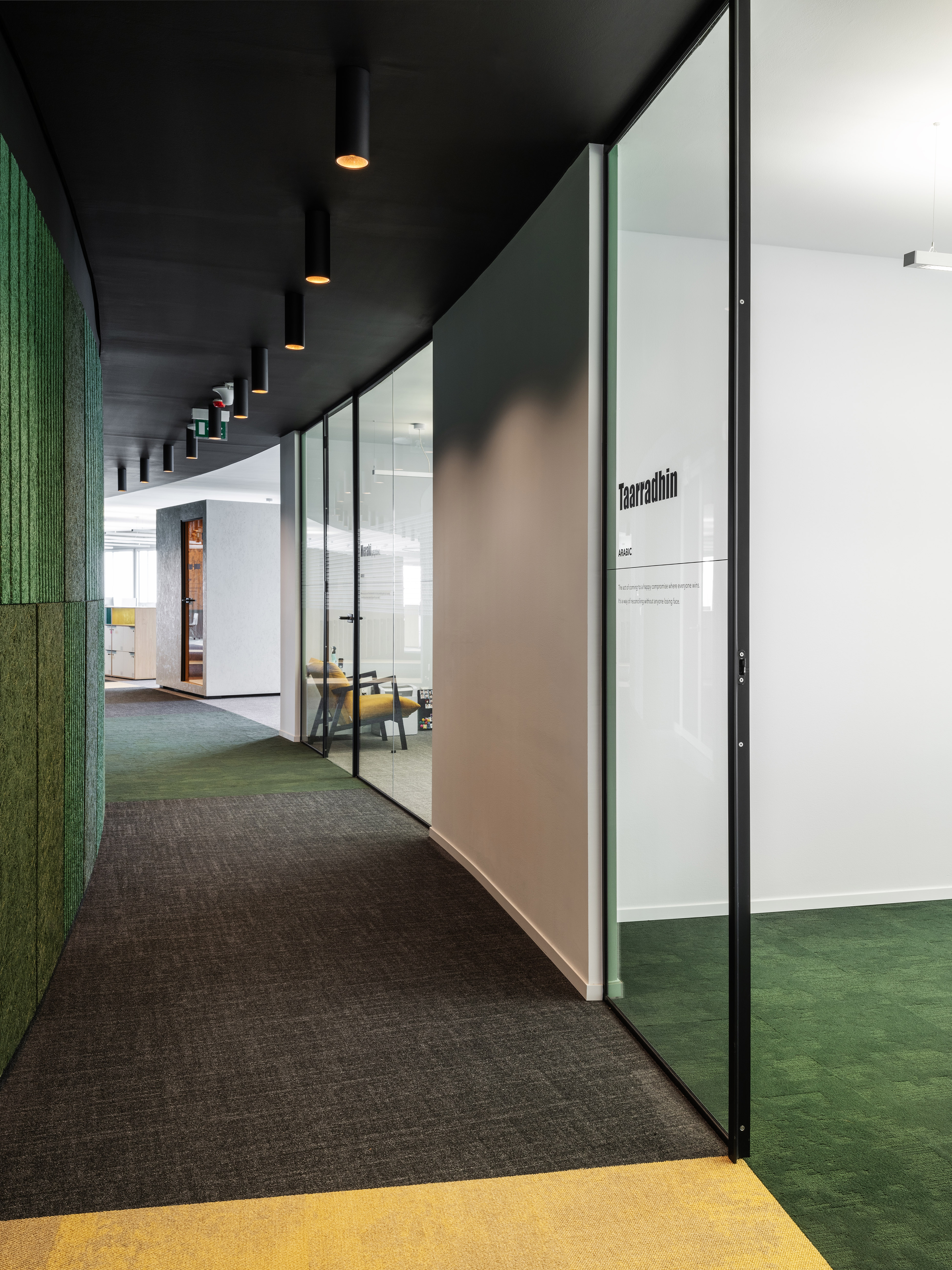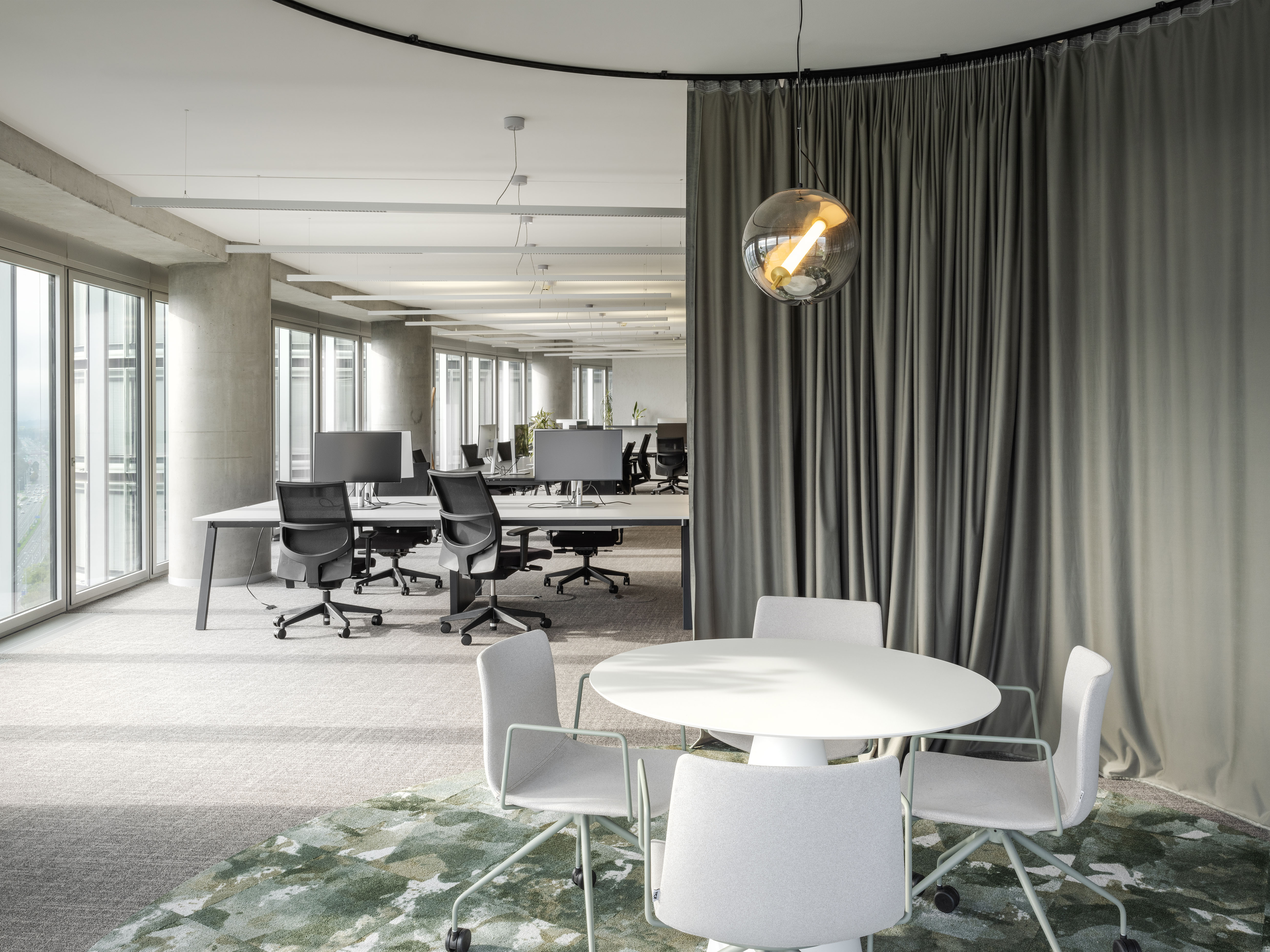 Zakrivljena elipsa jezgre nebodera, u zoni open-office obložena je akustičnim pločama u zelenkastim nijansama.