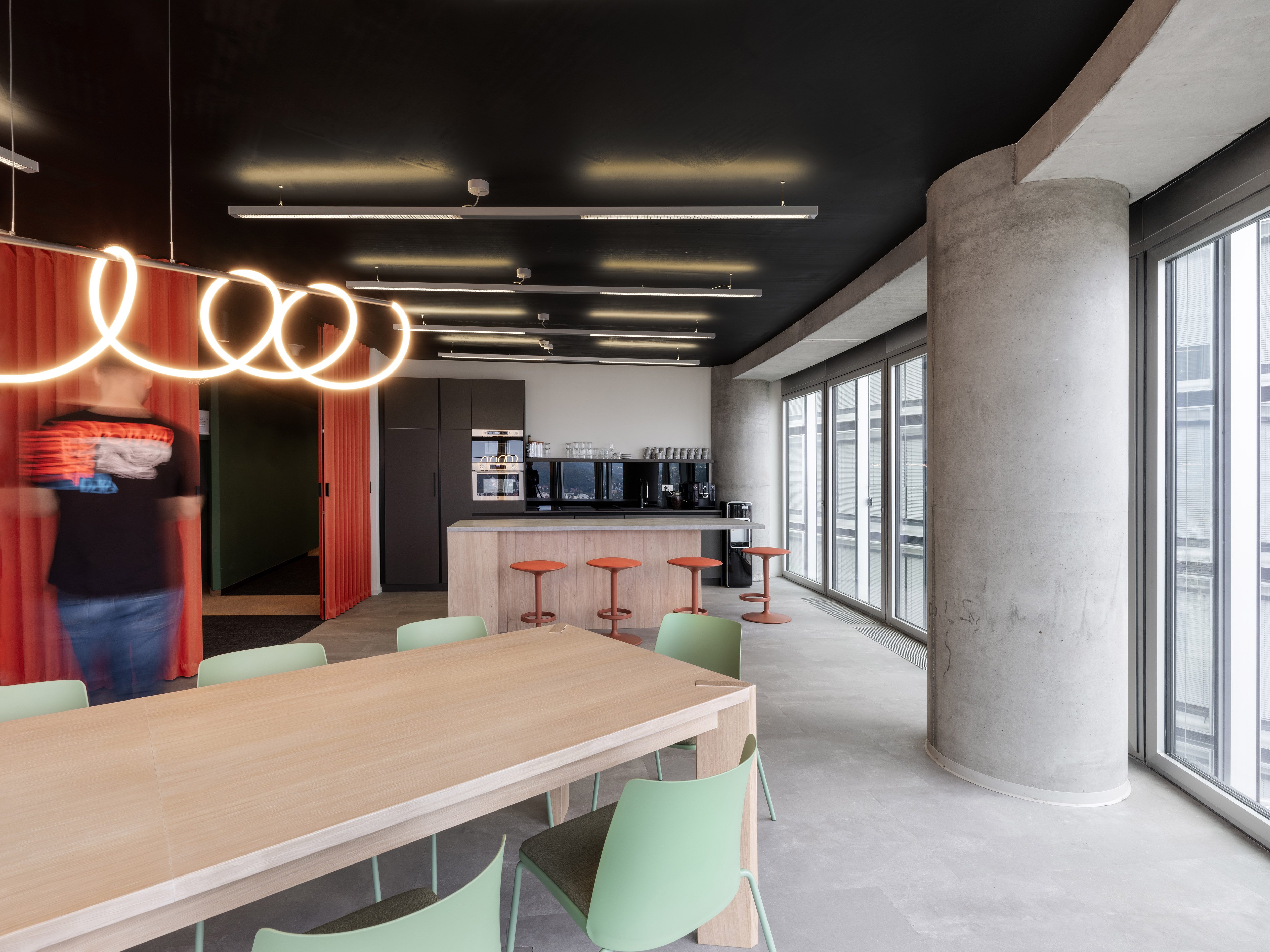 Uredska kuhinja proširena je na najatraktivniji prostor i time postaje mjesto susreta i zajedničkih druženja. Niz ureda prekida prostor s voluminoznim niskim foteljama za opuštanje.