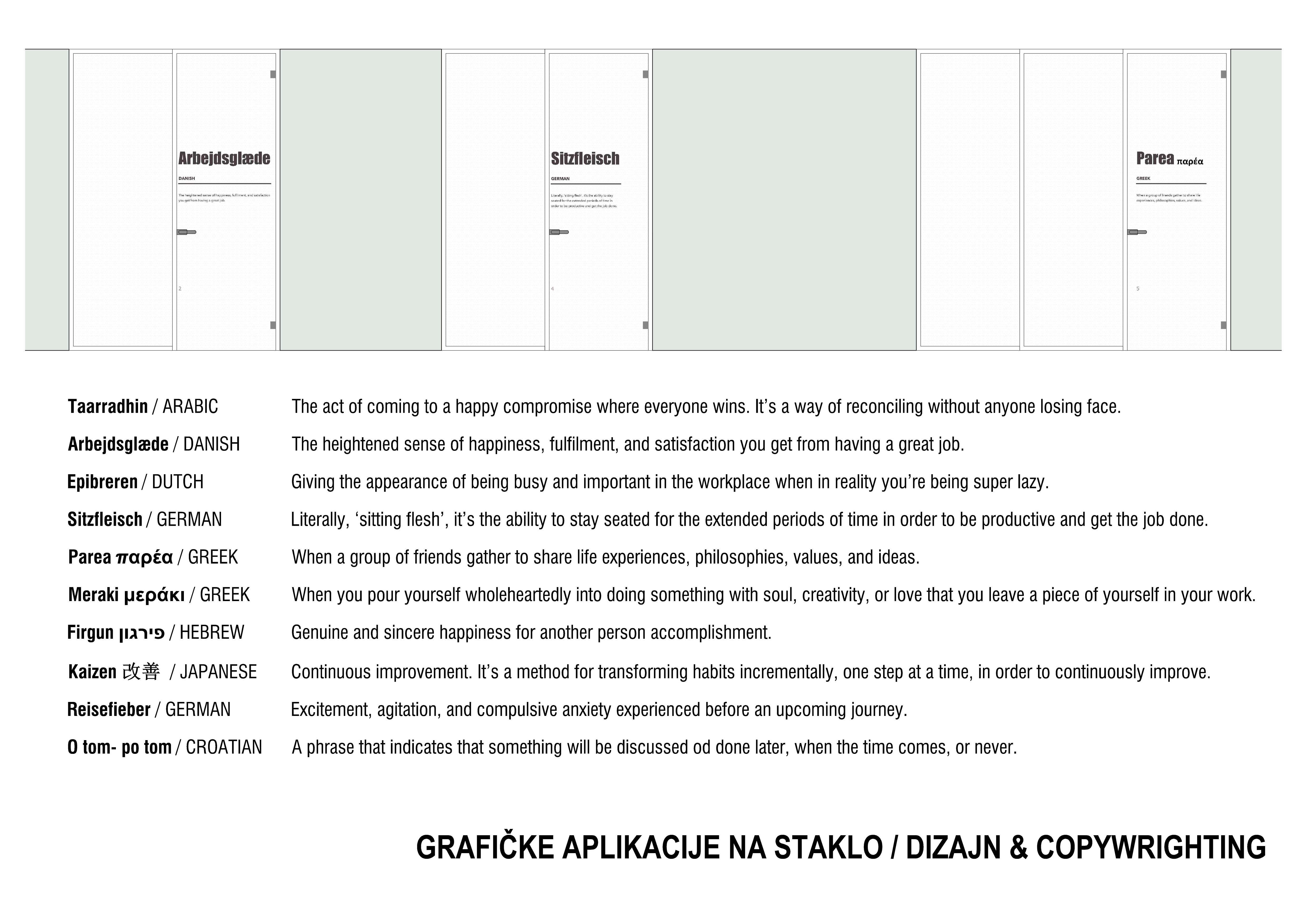 Svaka uredska prostorija nosi svoj naziv, takozvane „untranslateables“, teško prevodive riječi iz stranih jezika s proširenim objašnjenjem. Put oko jezgre u potrazi za uredom animiran je čitanjem poetskih multikulturalnih pojmova.