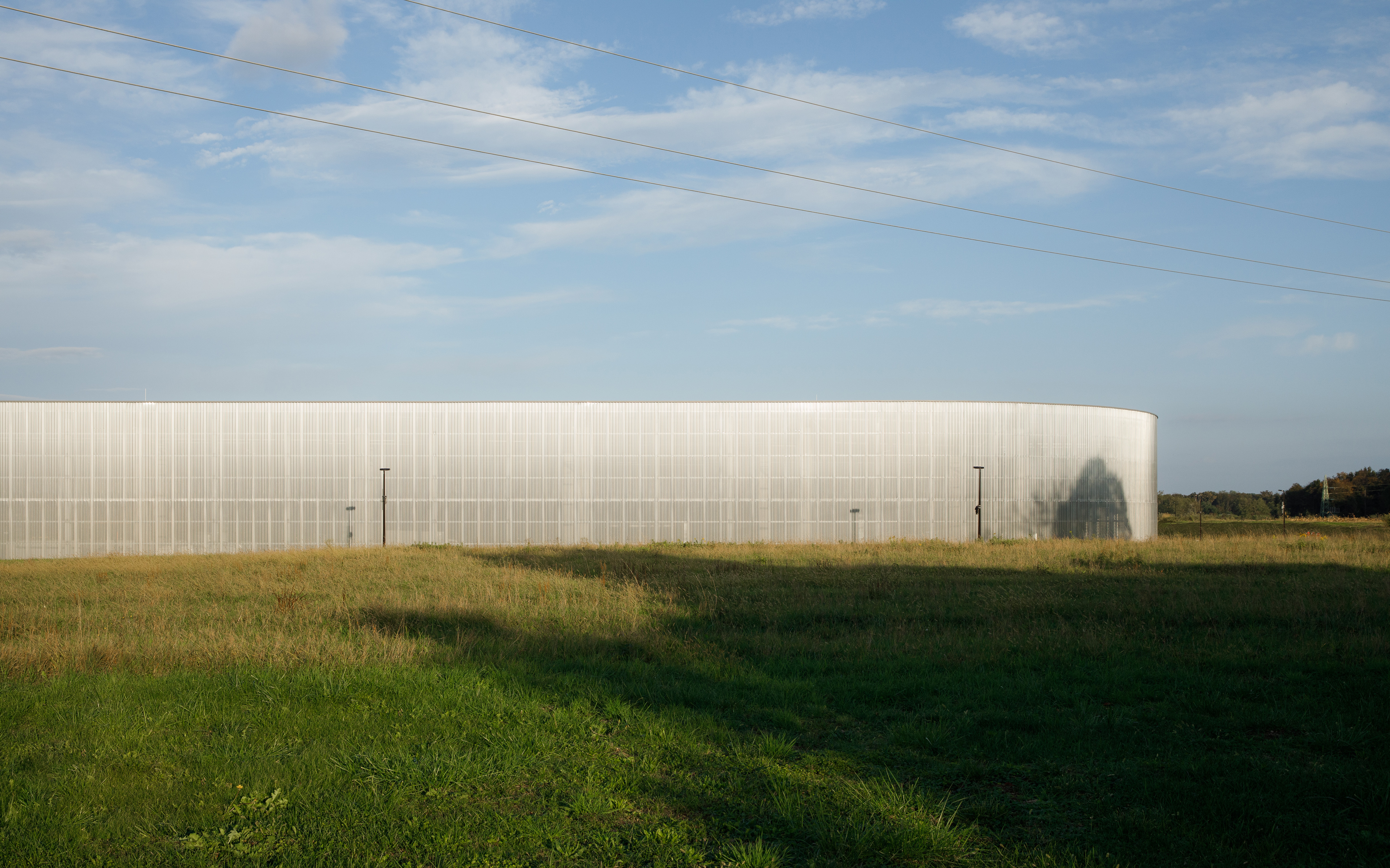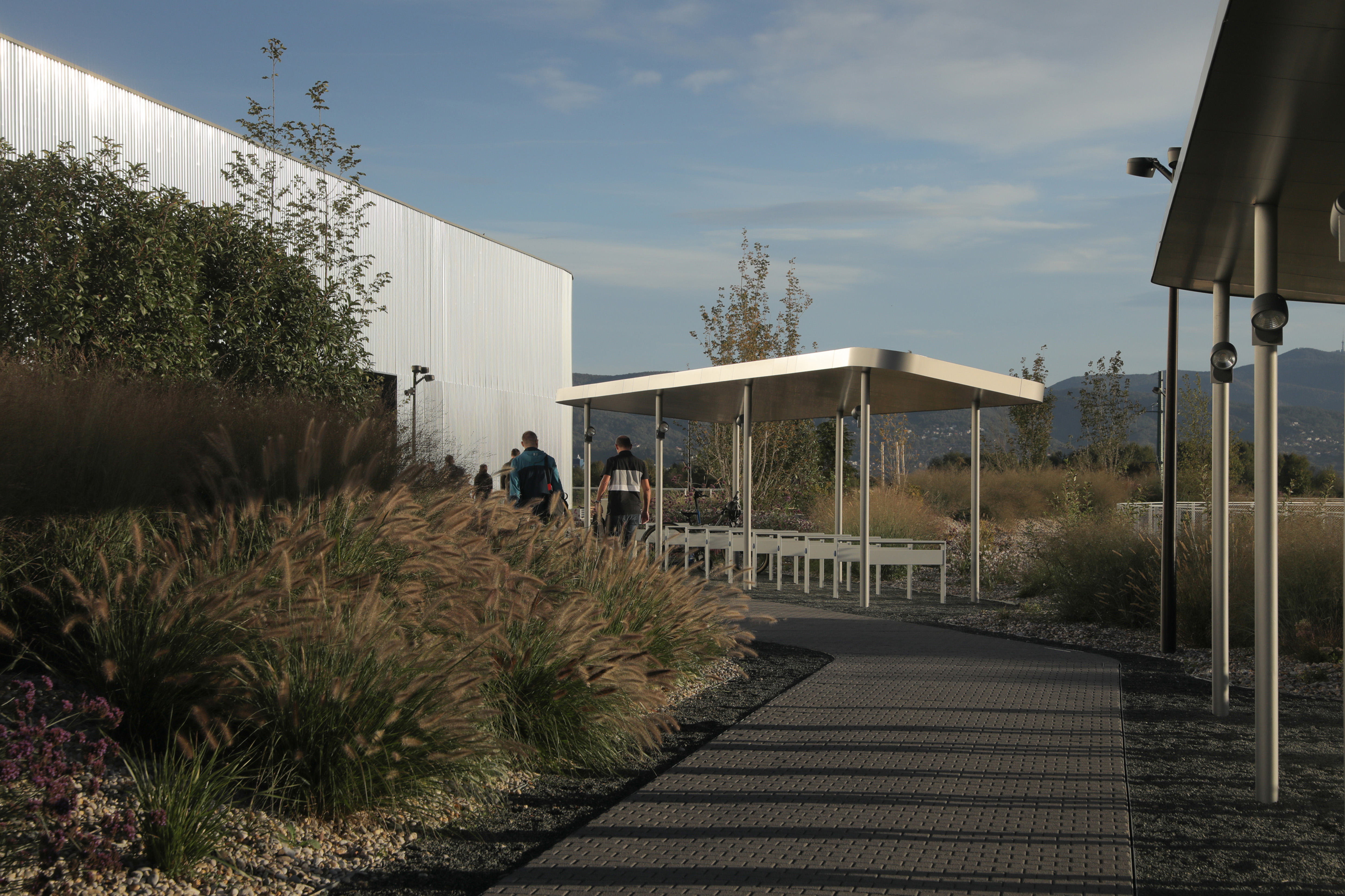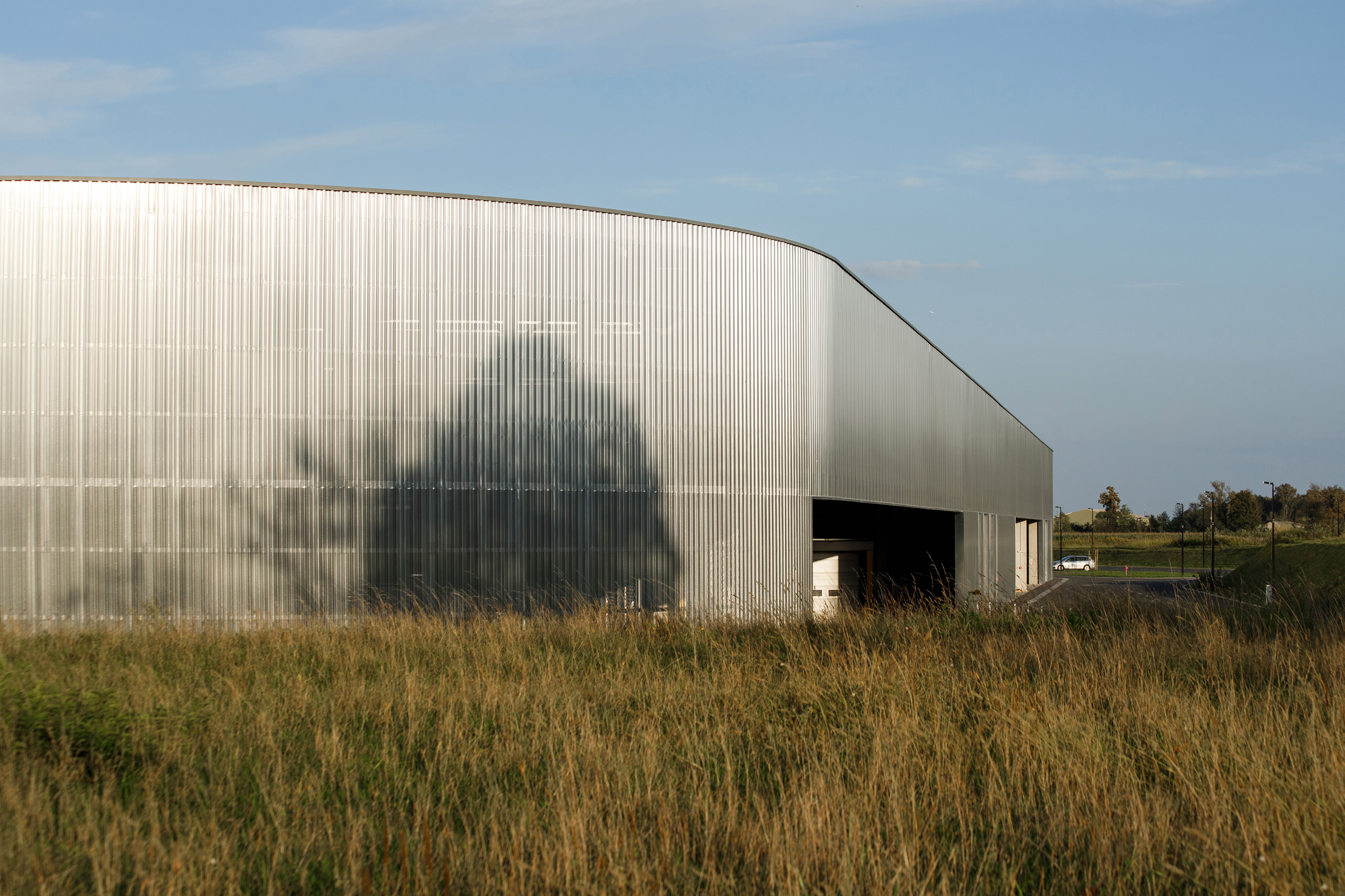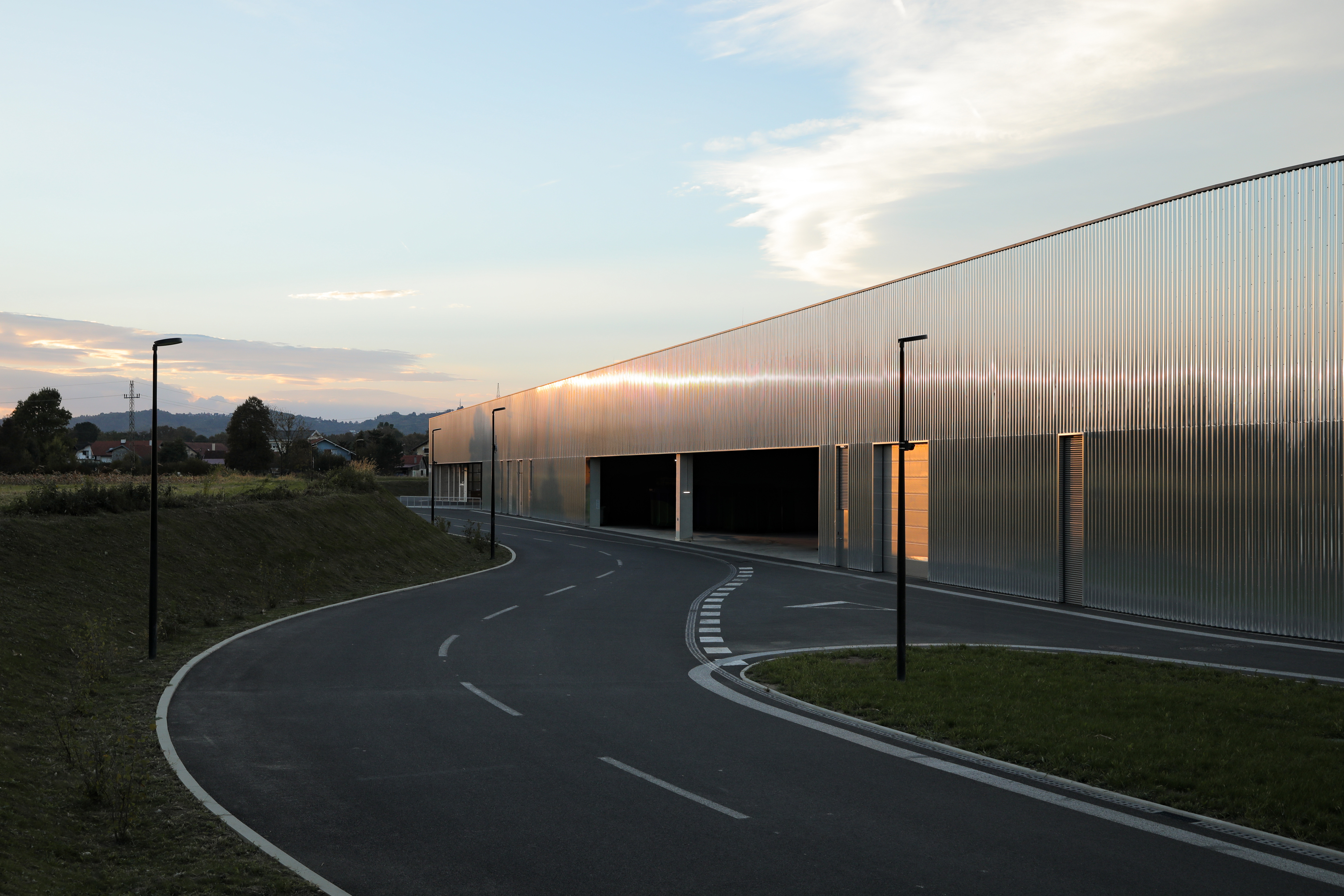 Glavni oblikovni element je kontinuirana ovojnica od profiliranog lima ukupne duljine od jednog kilometra. Aluminijski lim je izabran jer je lagan i jednostavan za slaganje na pročelju, te omogućuje prilagođavanje zakrivljenosti na uglovima. Istovremeno osigurava refleksiju i dematerijalizaciju ogromnog volumena proizvodnje otvarajući temu nove monumentalnosti i odnosa spram prostora.