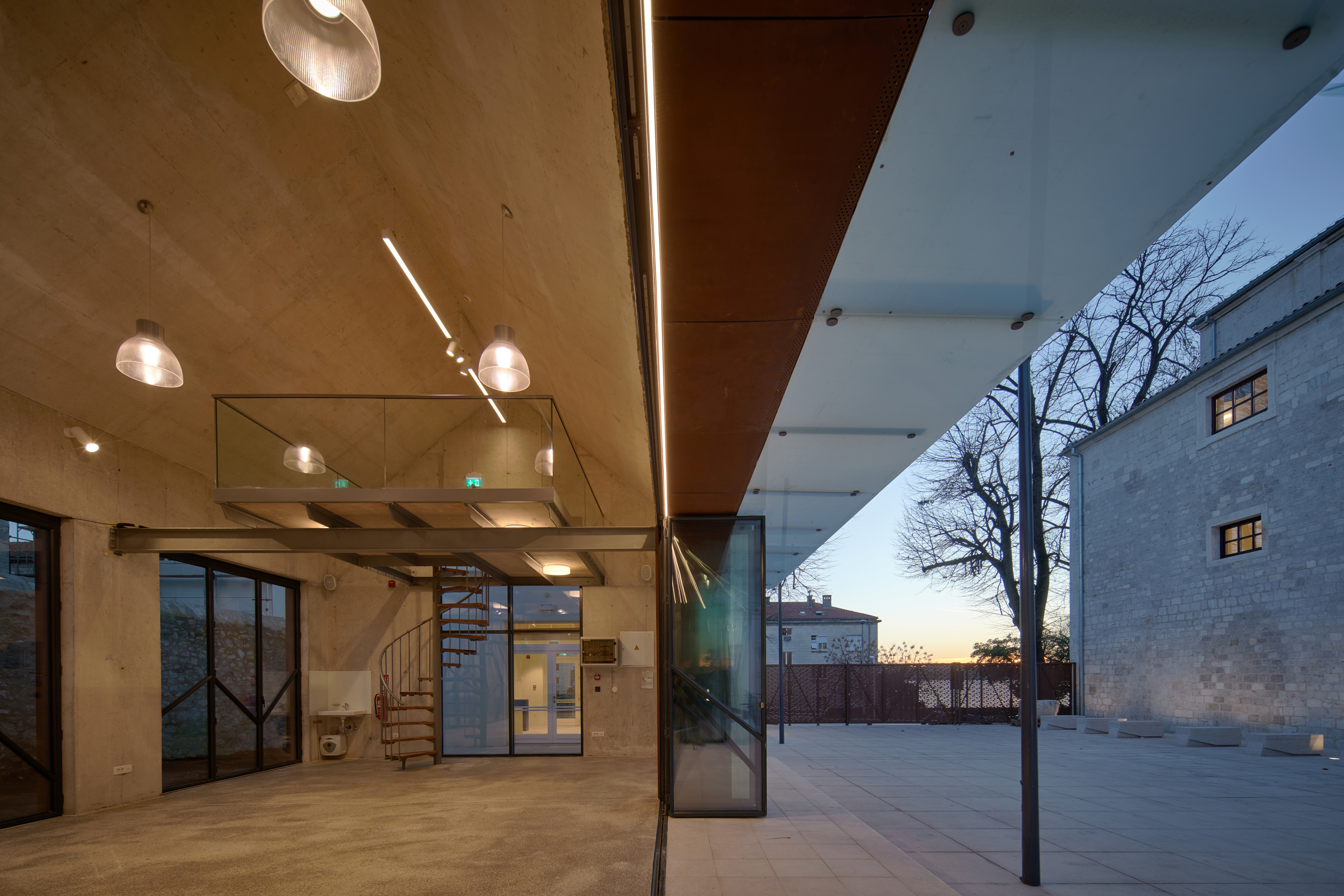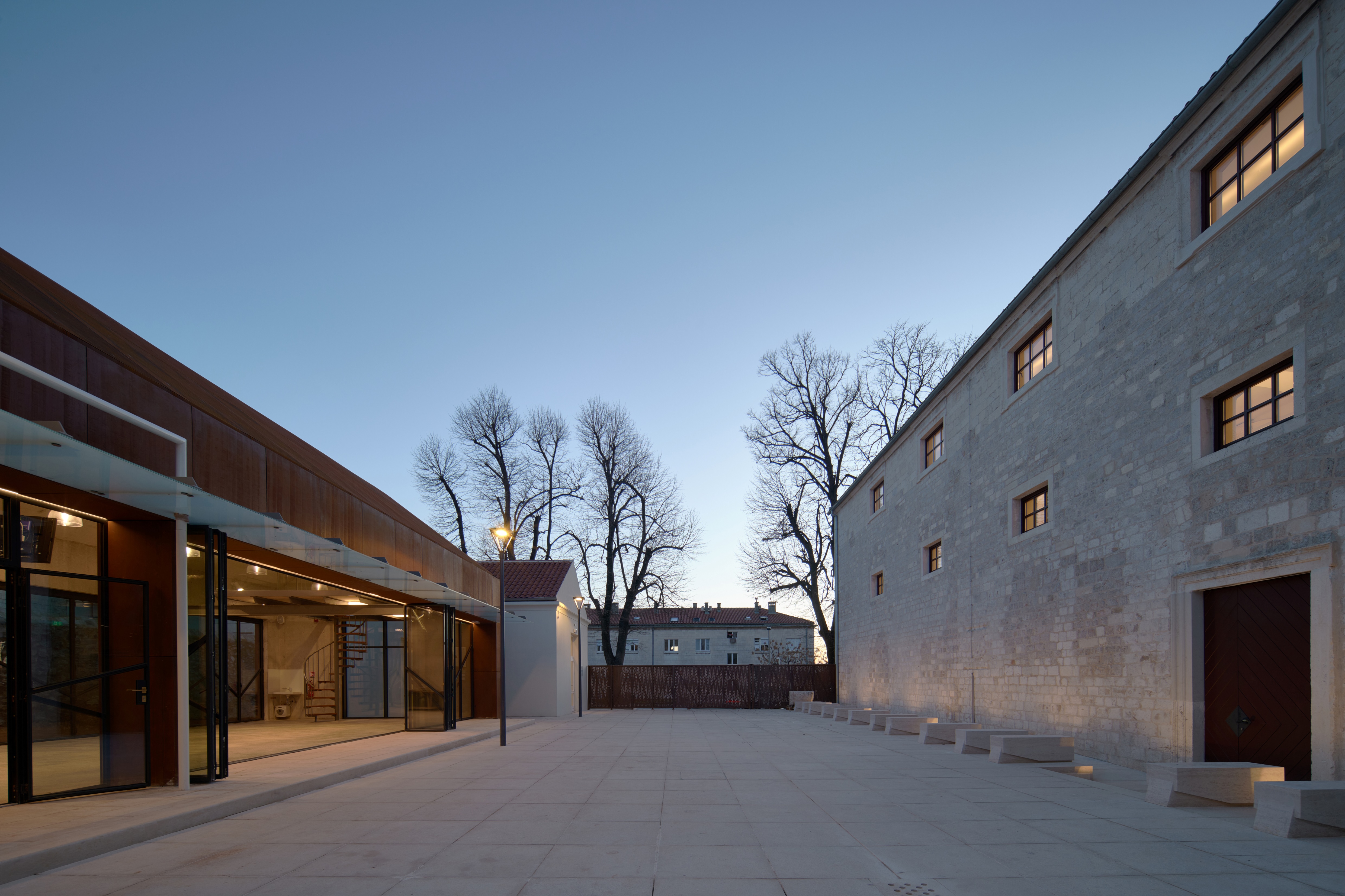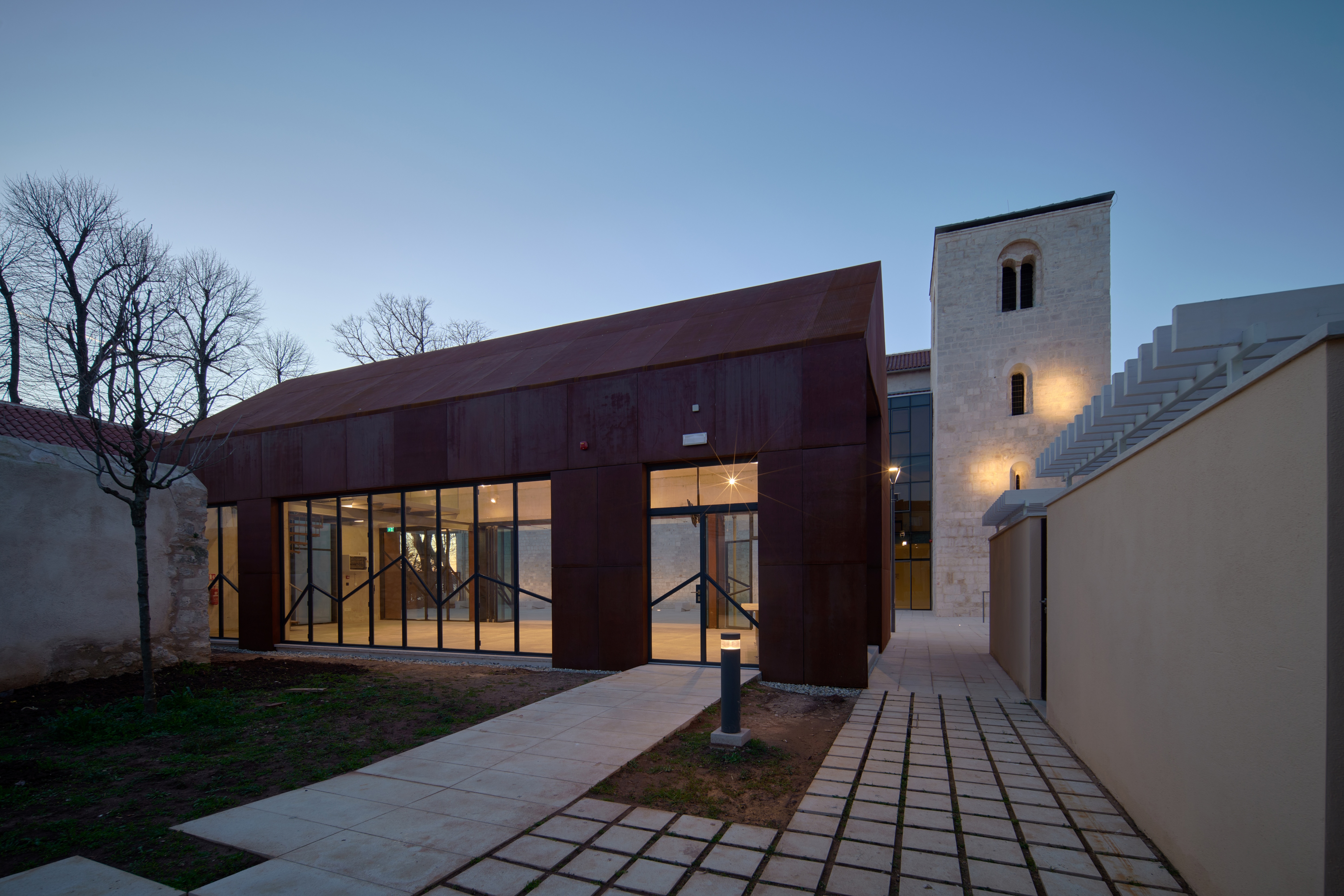 Između objekta bivše crkve i novog paviljona formirano je glavno dvorište koje može primiti veći broj ljudi za vanjska okupljanja, a vanjskim kamenim stubištem povezano je s nižim dvorištem u nastavku te malim atrijem sjeverno od apside crkve. Na jugoistočnom dijelu parcele iza paviljona i dormitorija oblikovan je vrt sa kamenom stazom, a ograđen je visokim kamenim zidom. Povezanost vanjskog prostora dvorišta i vrta ostvareno je i kroz velike ostakljene stijene paviljona koje se mogu rastvoriti, te na taj način i prostor paviljona postaje vanjski natkriveni prostor.