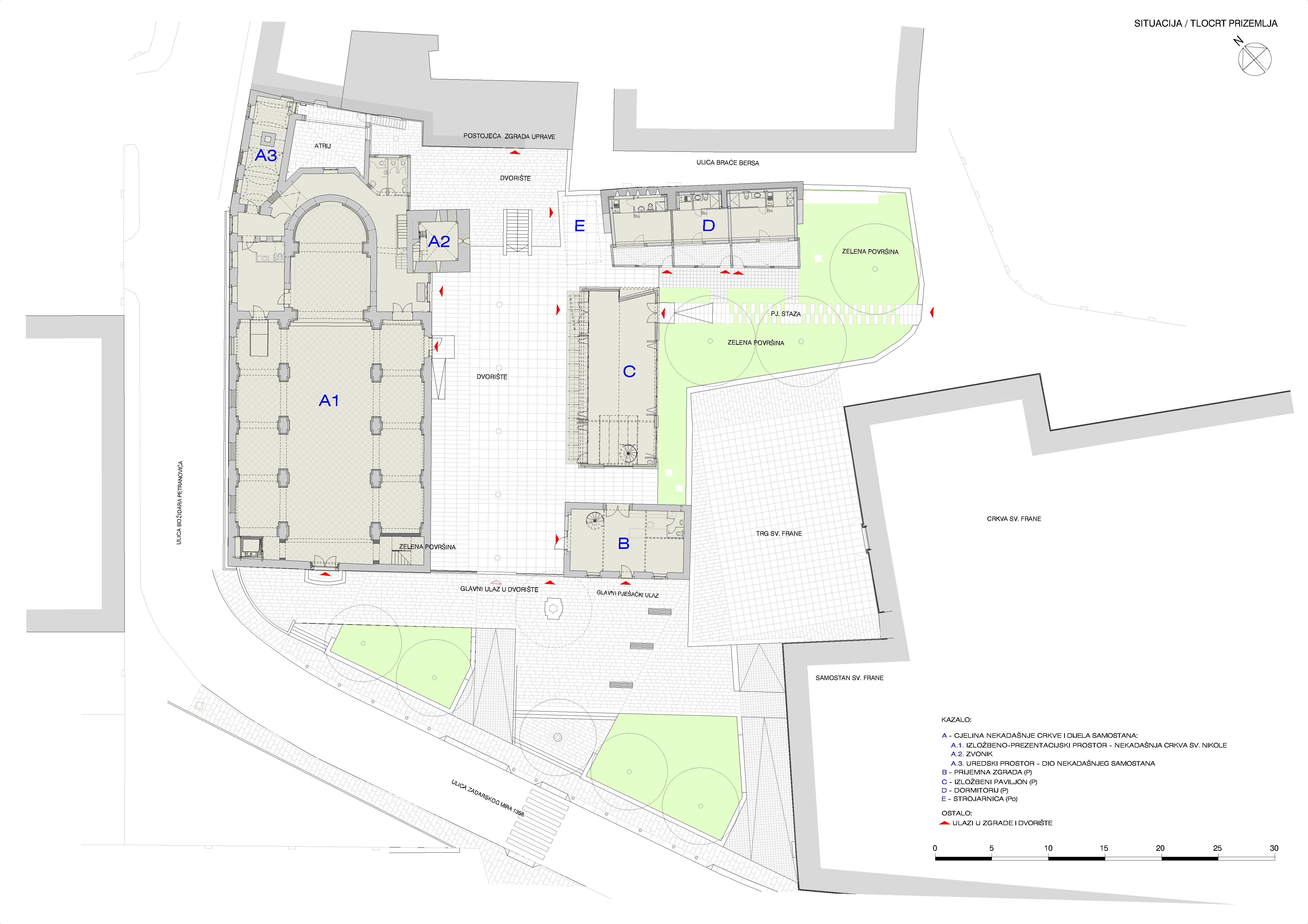 A – cjelina nek. crkve sa zvonikom i dijelom samostana, sadrži višenamjensku dvoranu, edukacijsko-prezentacijske prostore i uredski dio.