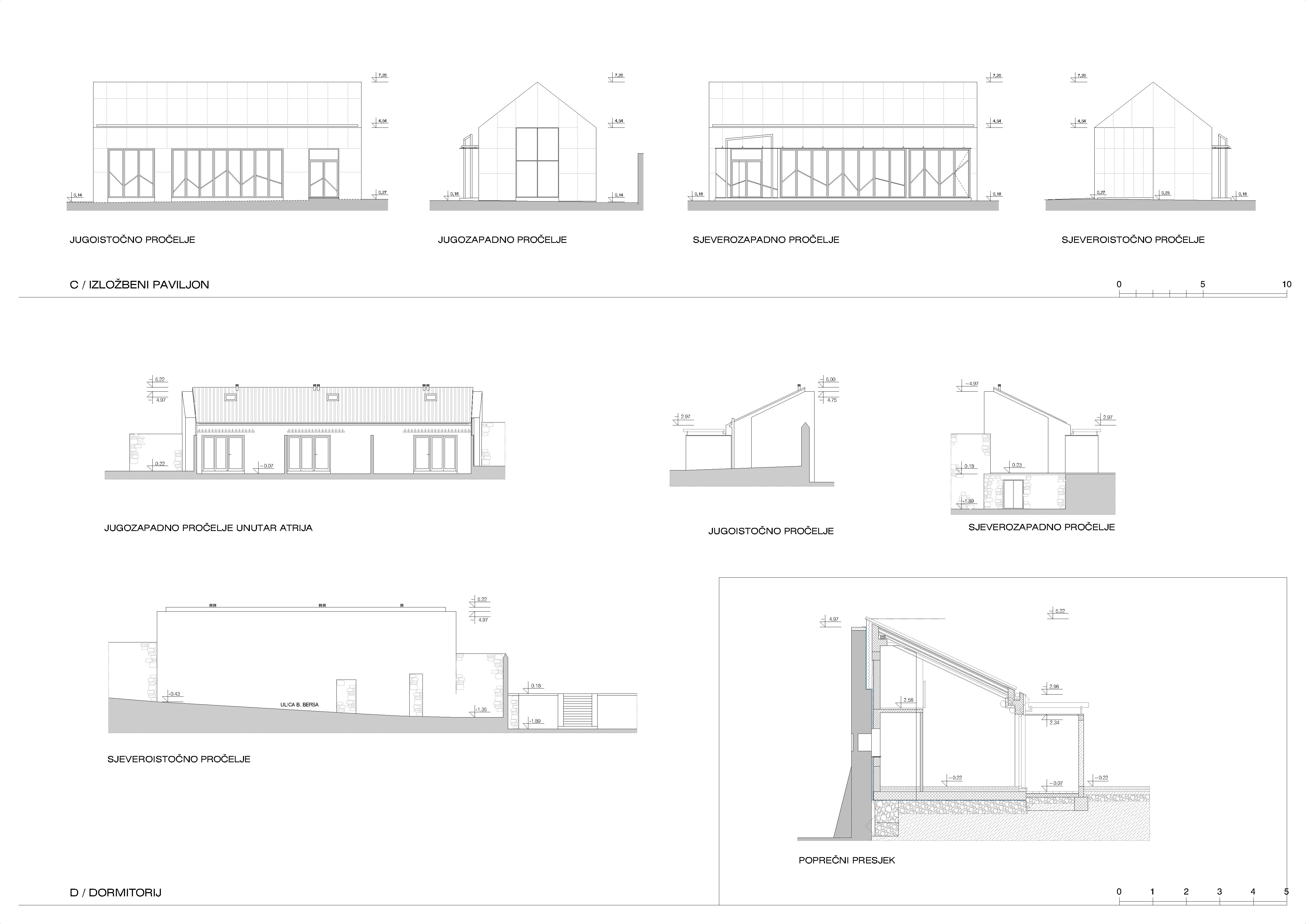D – zgrada dormitorija – prizemna zgrada s jednovodnim krovom na mjestu, inkorporirana između postojećih kamenih zidova nekadašnje gospodarske zgrade, sastoji se od tri manja apartmana sa zasebnim ulazima iz vanjskog prostora parcele, preko malih ograđenih atrija.