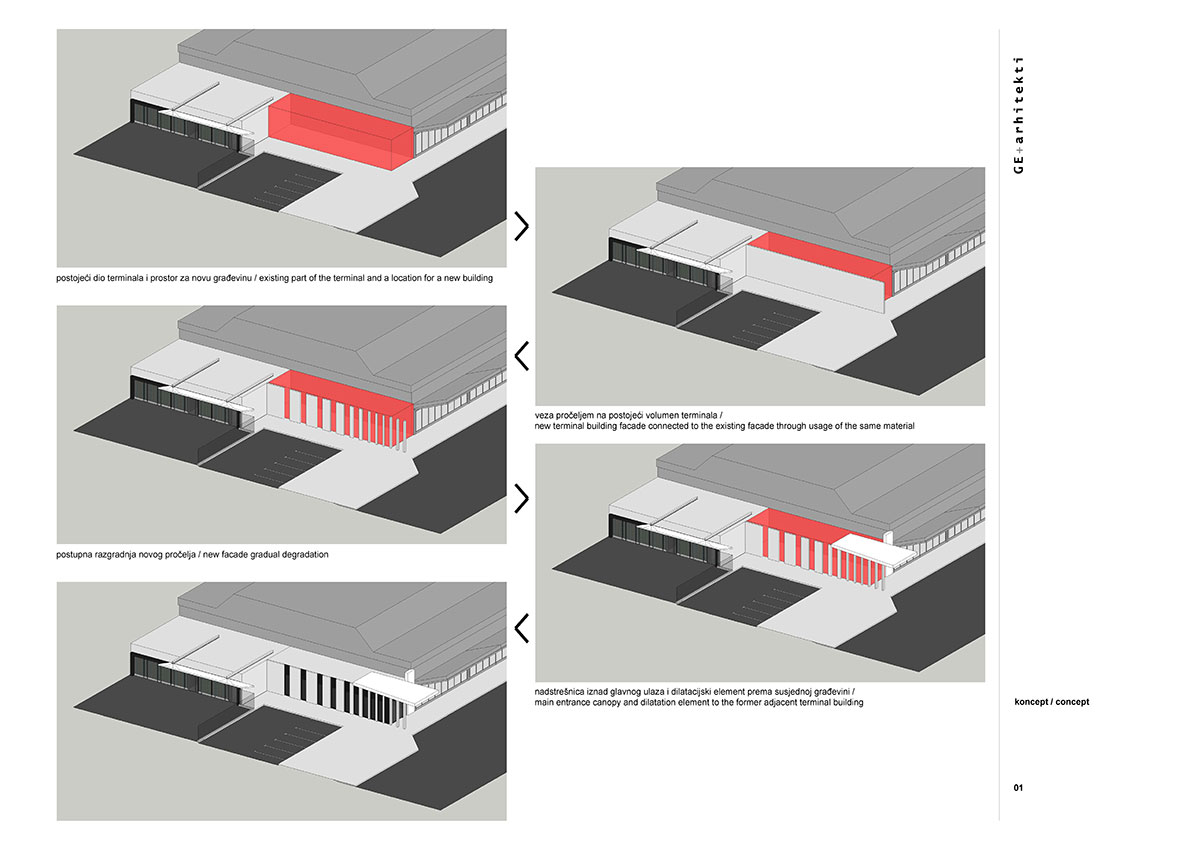 Novi volumen građevine naslanja se na postojeći, koristi djelomično isti materijal, ali se postupno otvara prema glavnom ulazu koji je izveden u njegovom sklopu. Konceptom postupnog otvaranja postiže se igra punog i praznog kao i igra prvi / drugi plan kojim se u isto vrijeme ostvaruje poveznica s postojećim volumenom, ali stvara i novi vizualni identitet cjelokupnog sklopa. Uz postojeći volumen i novi je većim dijelom sastavljen od punih elemenata, a približavajući se glavnom ulazu uglavnom od praznih elemenata, dok puni poprimaju vitke dimenzije u funkciji konstrukcije koja pridržava nadstrešnicu iznad ulaza.