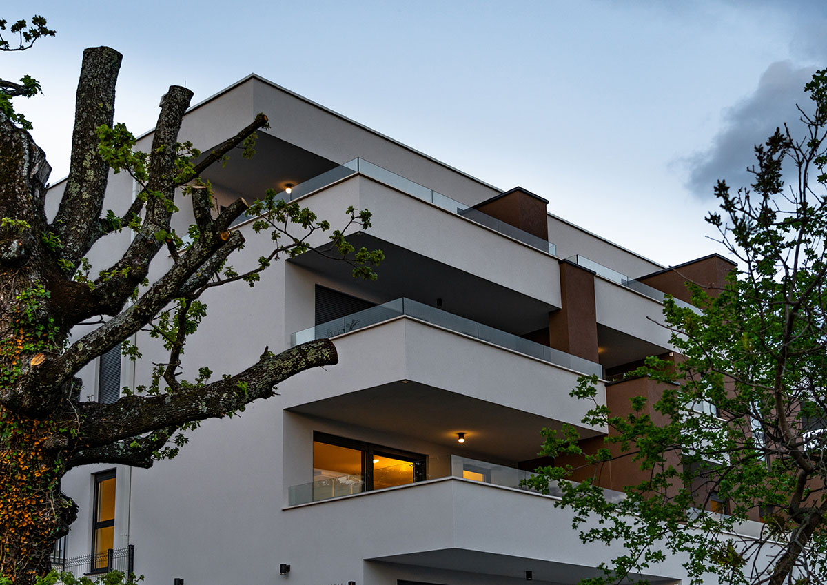 Organizacija 11 stanova, svakog sa terasom površine od minimalno 15 do 40m², i sa željom za osiguranjem intime svake od navedenih jedinica stana, oblikovno je odredilo izgled jugozapadnog pročelje zgrade.