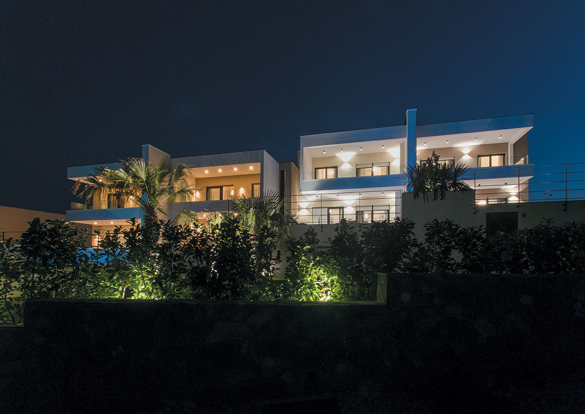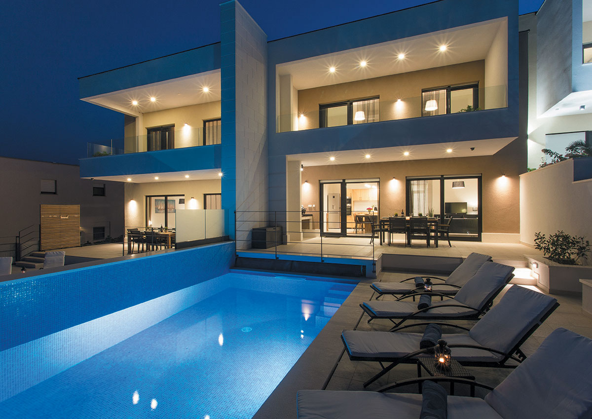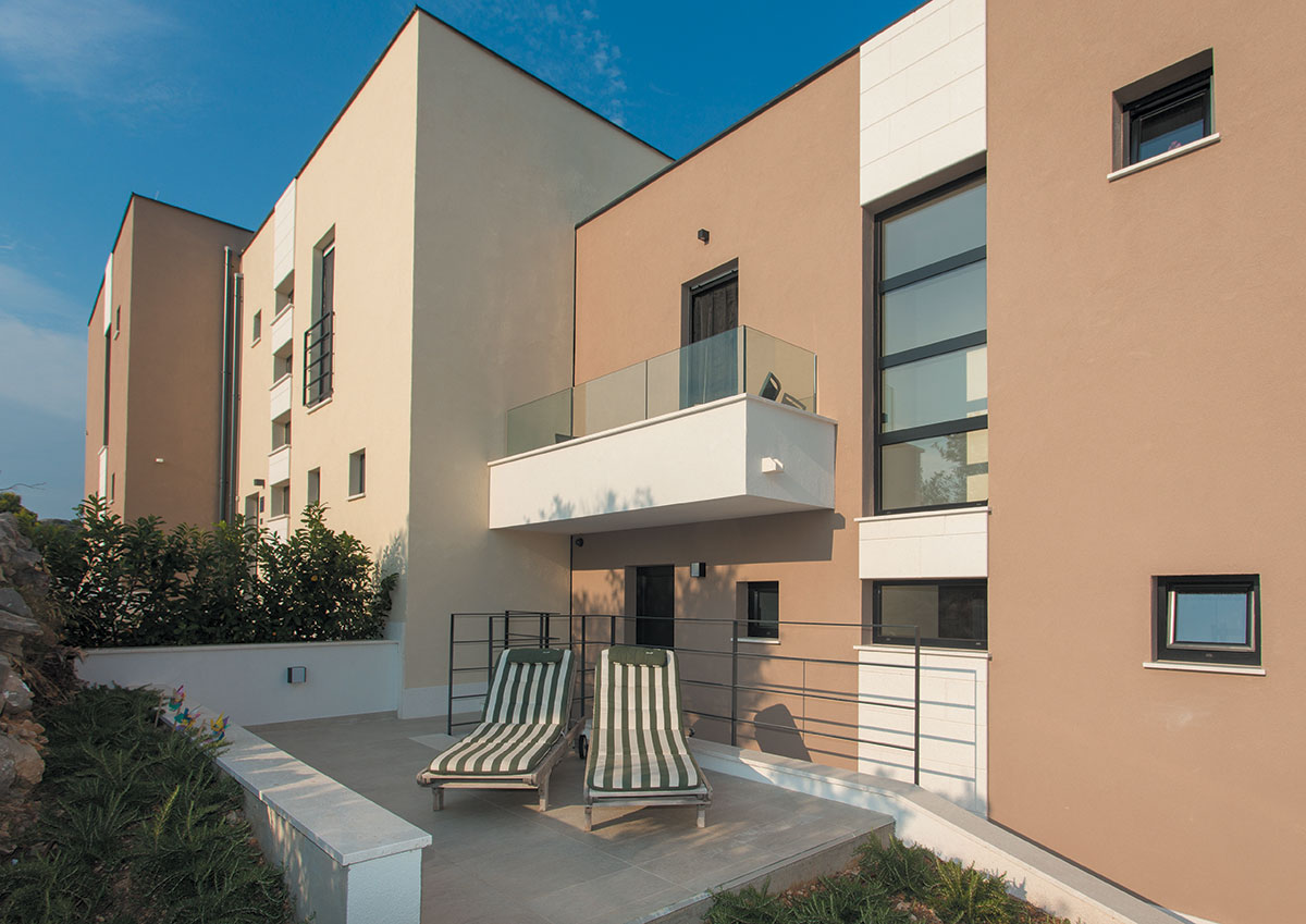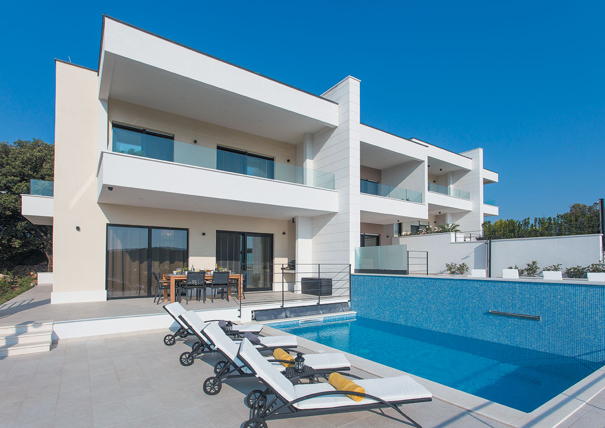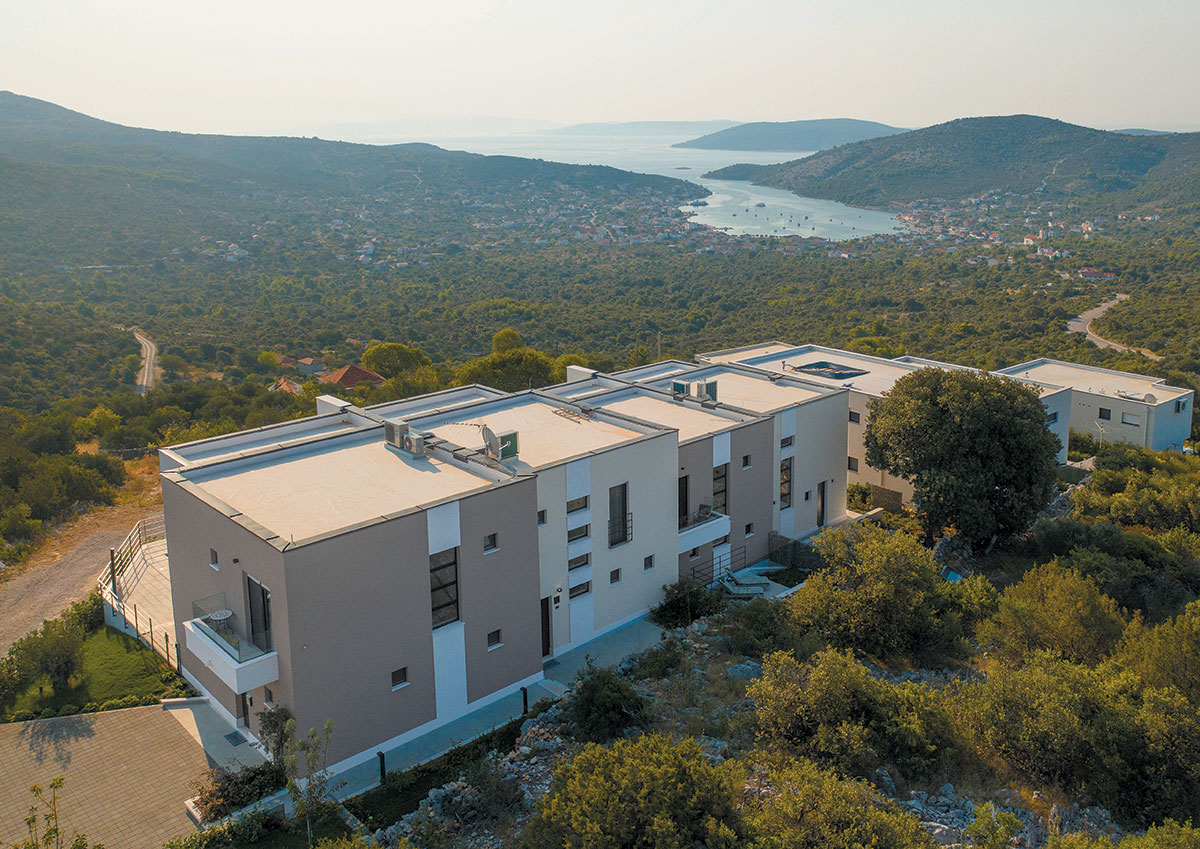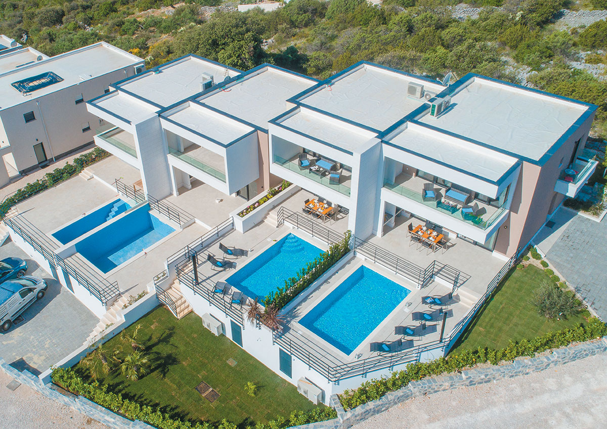 Svaka stambena jedinica ima i bazen s južne strane s pratećim sunčalištem, koji je povezan s nekoliko stepenica s vanjskom kuhinjom i blagovanje. S tih pozicija omogućen je prekrasan pogled na zaljev. Čestica je položena uz postojeću prometnicu, koja prolazi pored parcele na sjeveru i istoku. Parcela je kosa, s nagibom koji pada prema jugoistoku, prema moru.