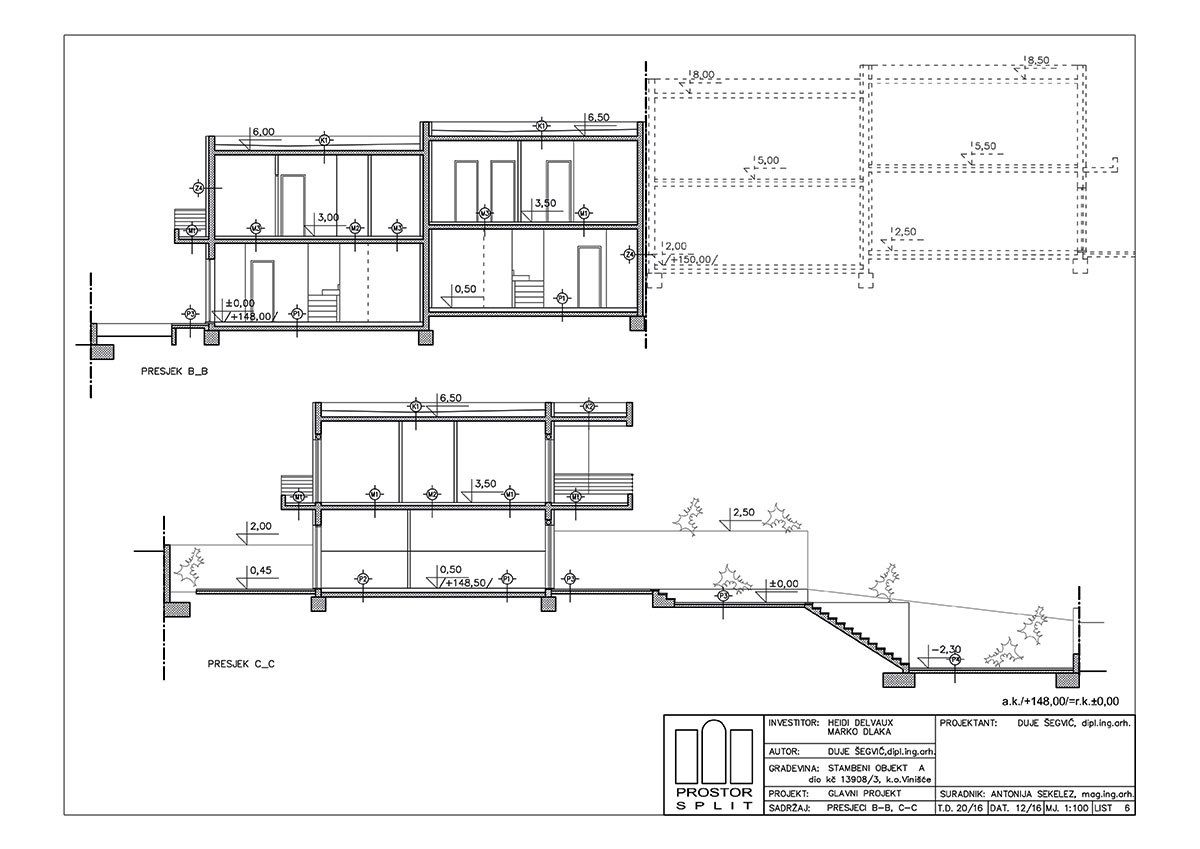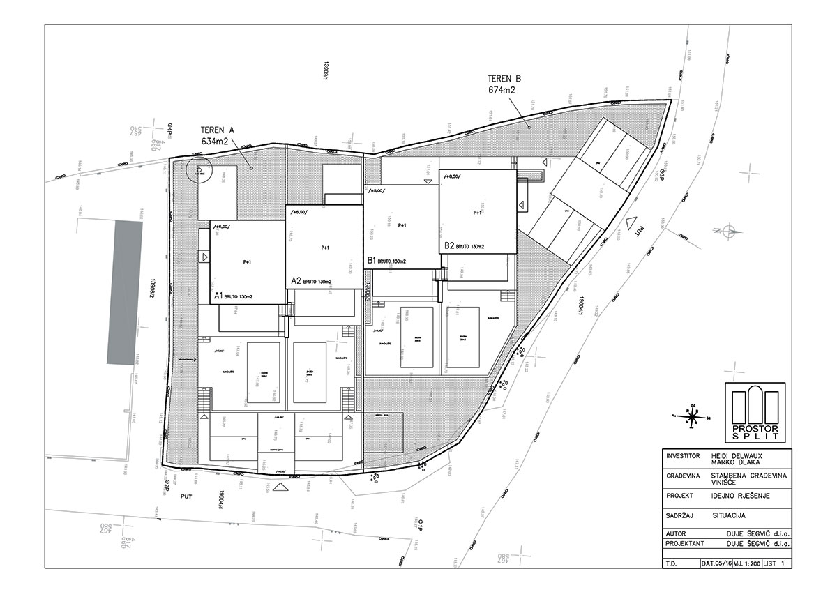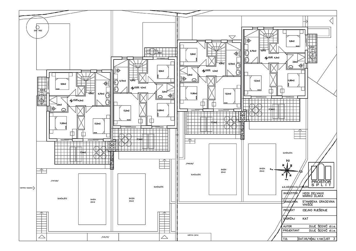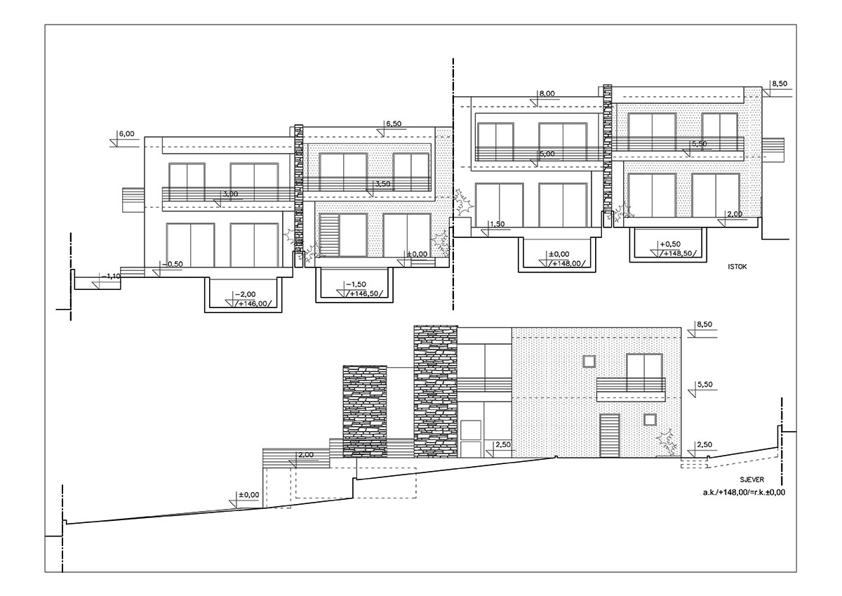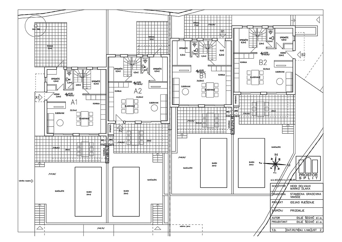 Tlocrtne dimenzija svake kuće je 13,32 m x 15,40 m i sastoji se od dvije dvoetažne stambene jedinice. Katnost objekata je prizemlje i kat, a bruto razvijena površina zgrade iznosi 261 m2, odnosno 522 m2 cijeli zahvat u prostoru. Zemljište od 1300m2 je podijeljeno na dvije građevinske čestice.