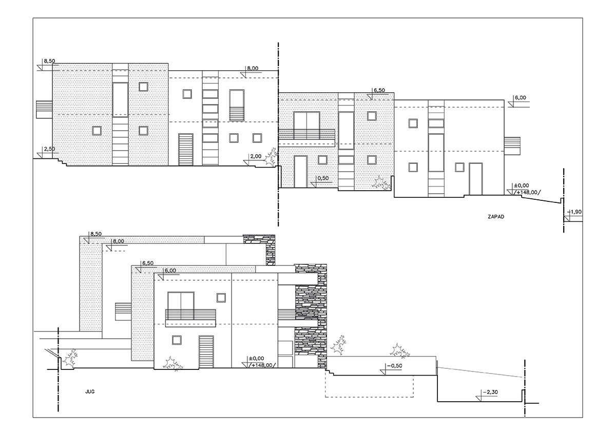U svakoj stambenoj jedinici u prizemlju su svi dnevni prostori, wc i spremišta, dok se na katovima do kojeg se prilazi dvokrakim betonskim stubištem predviđaju spavaonice sa pripadajućim kupaonicama.