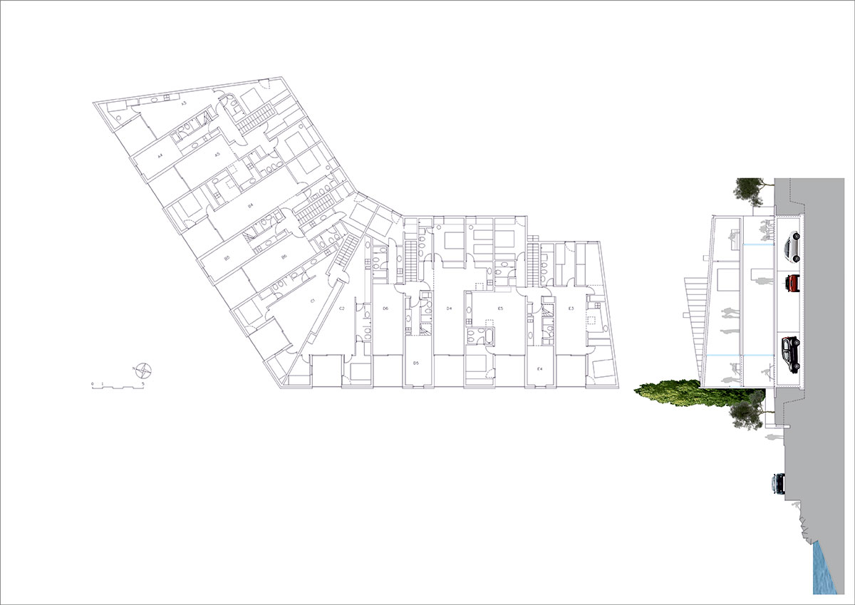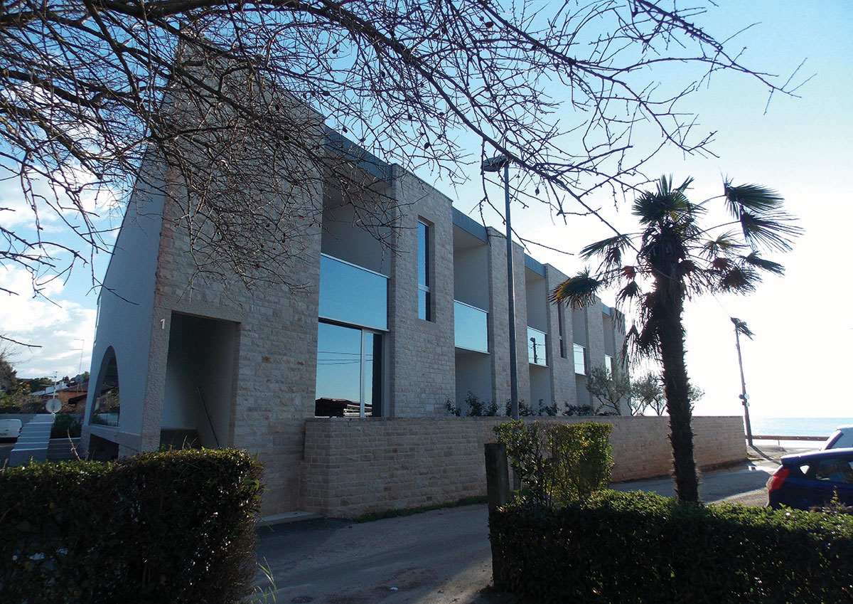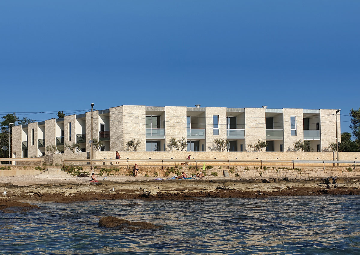 Zgrada se sastoji od podruma u kojem su parkirna mjesta i spremišta, visokog prizemlja sa 10 stanova, te kata s 14 stanova. Stanovi su različitih veličina i svi imaju pogled na uvalu (more). Oveća lođa, koja produžuje dnevni boravak, čini okosnicu svakog stana. Veći stanovi u prizemlju, sa svojim vrtovima, nadomještavaju potrebu po individualnoj kući.