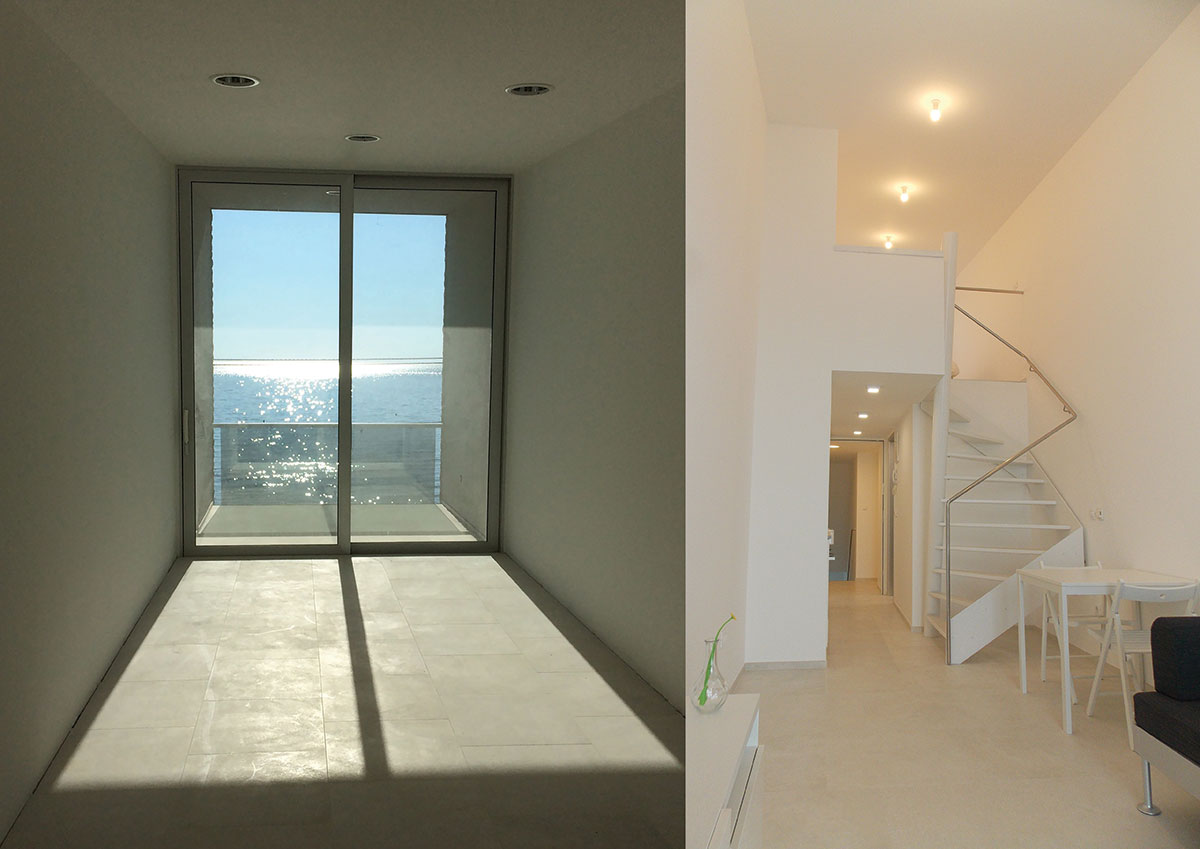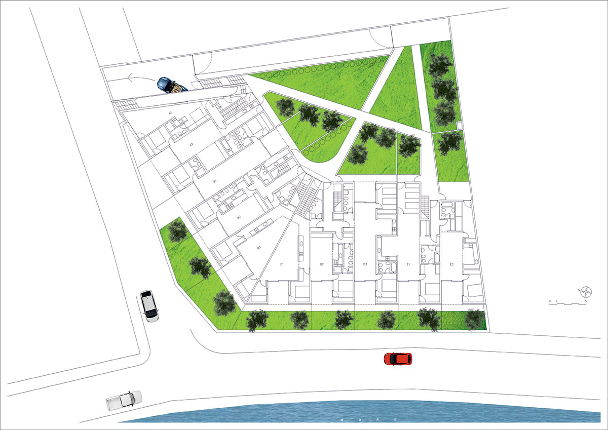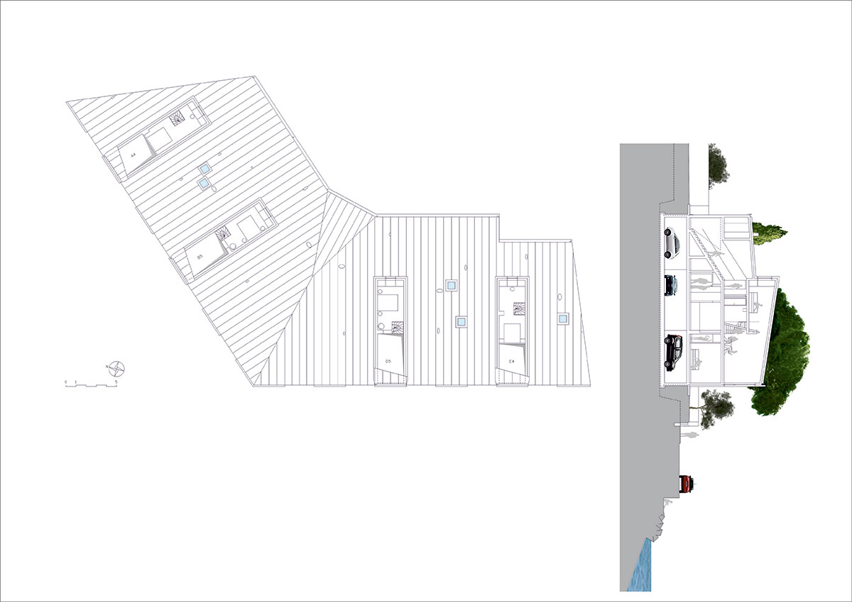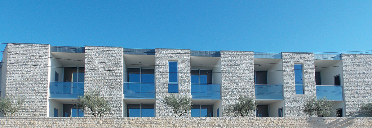 Zgrada se sastoji od podruma u kojem su parkirna mjesta i spremišta, visokog prizemlja sa 10 stanova, te kata s 14 stanova. Stanovi su različitih veličina i svi imaju pogled na uvalu (more). Oveća lođa, koja produžuje dnevni boravak, čini okosnicu svakog stana. Veći stanovi u prizemlju, sa svojim vrtovima, nadomještavaju potrebu po individualnoj kući.