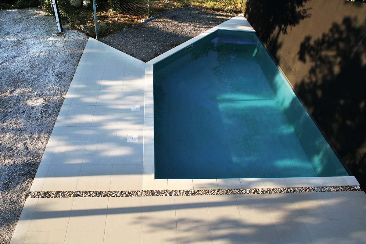 Okoliš je tektonski sveden na jednostavan plato prekriven šljunkom kako bi se još više naglasio skulpturalan doživljaj objekta.