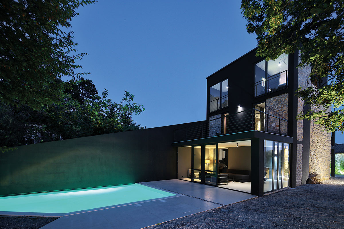 Interijer sadrži različit ambijenate, od introventiranog kamenog boravka sa kaminom u prizemlju do ostakljenih kliznih stijena terase sa bazenom ili krovne terase.