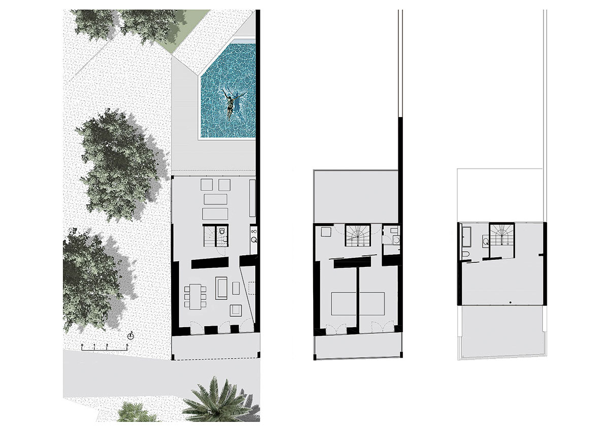 Nova konstrukcija betonskih stropova sa skrivenim gredama, kontinuirano se nastavljaja u vanjski prostor u obliku balkona i terasa koje se otvaraju prema bujnoj vegetaciji.