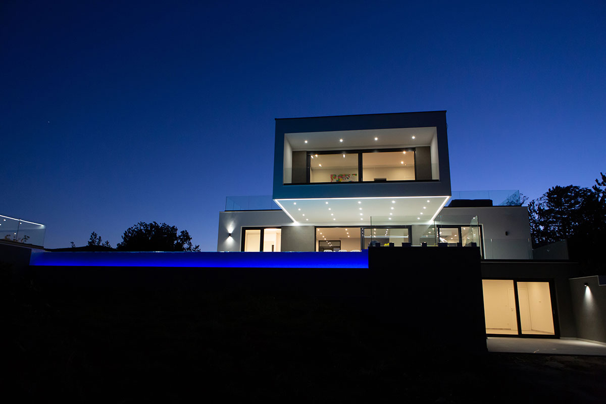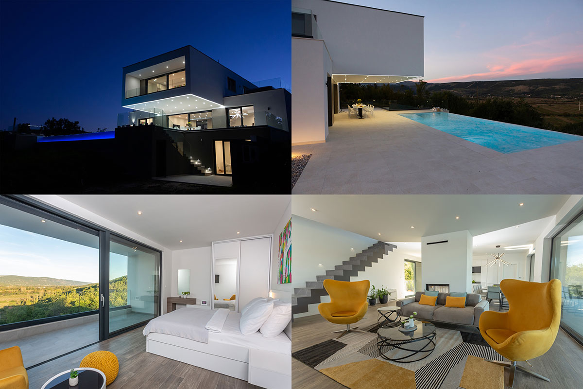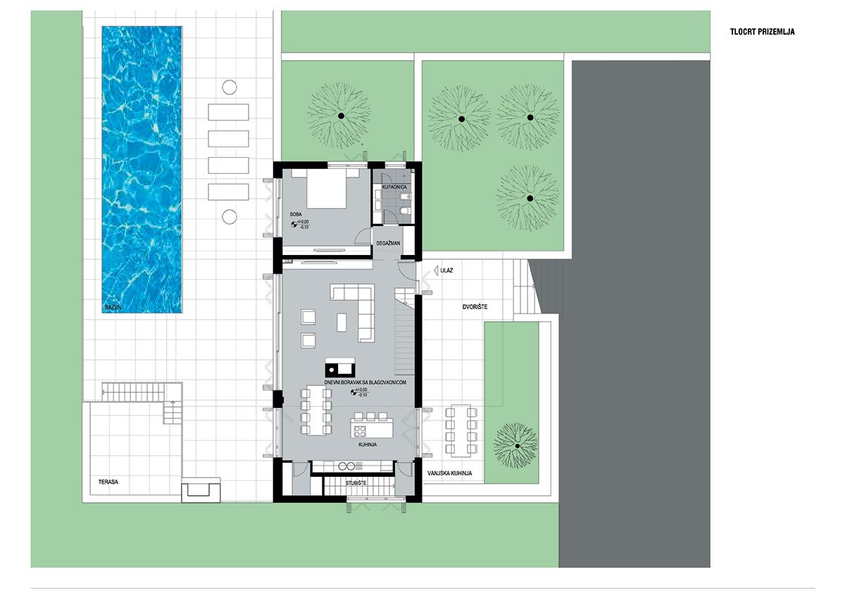 Obrazloženje arhitektonskog koncepta, funkcionalna i prostorna organizacija i oblikovanje građevine Arhitektonsko oblikovanje građevine proizlazi iz namjere za stvaranjem tehnološki i arhitektonski suvremene kuće za odmor visokog komfora i funkcionalnog koncepta. Intencija projekta je da se jednostavnim volumenima i minimalističkom arhitekturom suvremeno artikulira zatečeni kontekst Dalmatinske zagore te omogući otvaranje unutarnjih i vanjskih prostora prema dominantnim vizurama grada Imotskog i Imotskog polja. Volumen građevine je strukturirani kubični volumen koji se sastoji od dva po vertikali međusobno okomito pozicionirana kvadra. Dispozicijom volumena po vertikali u formi dva izmaknuta kvadra postiže jasna tlocrtno-dispozicijska i funkcionalna struktura stambenog prostora te strukturiranost vanjskog volumena kuće i otvaranje pojedinih prostora prema dominantnim vizurama. Kuća je smještena pored naselja Grubine na blago položenoj padini orijentiranoj prema sjeveroistoku s pogledom prema gradu Imotskom. Tlocrtni gabarit građevine čine dva po etažama gabaritom okomito izmaknuta volumena u kojima su smještene funcionalne cjeline stambenog prostora. Katnost građevine je suteren, prizemlje i 1. kat. Naizmjeničnom dispozicijom volumena po vertikali dva izmaknuta kubusa postiže jasna tlocrtno-dispo zicijska i funkcionalna struktura stambenog prostora te strukturiranost vanjskog volumena kuće odnosno prožimanje interijera i vanjskog postora sunčališta sa bazenom. Ostakljene klizne stijene velikog formata omogućavaju vizualno i funkcionalno prožimanje unutarnjih i vanjskih prostora dnevnog boravka sa prostorom bazena te otvaranje prema dominantnim vizurama.Kuća je koncipirana kao 3-etažna stambena građevina sa jednom stambenom jedinicom, otvorenim bazenom i sunčalištem, teniskim terenom te parkiralištem za 4 vozila. Stambeni prostor je 3-etažna cjelina sa dnevnom zonom na etaži prizemlja, 4 odvojena trakta soba sa kupaonicama na prizemlju i 1. katu te zonom rekreacije i gospodarskih prostora na etaži suterena.