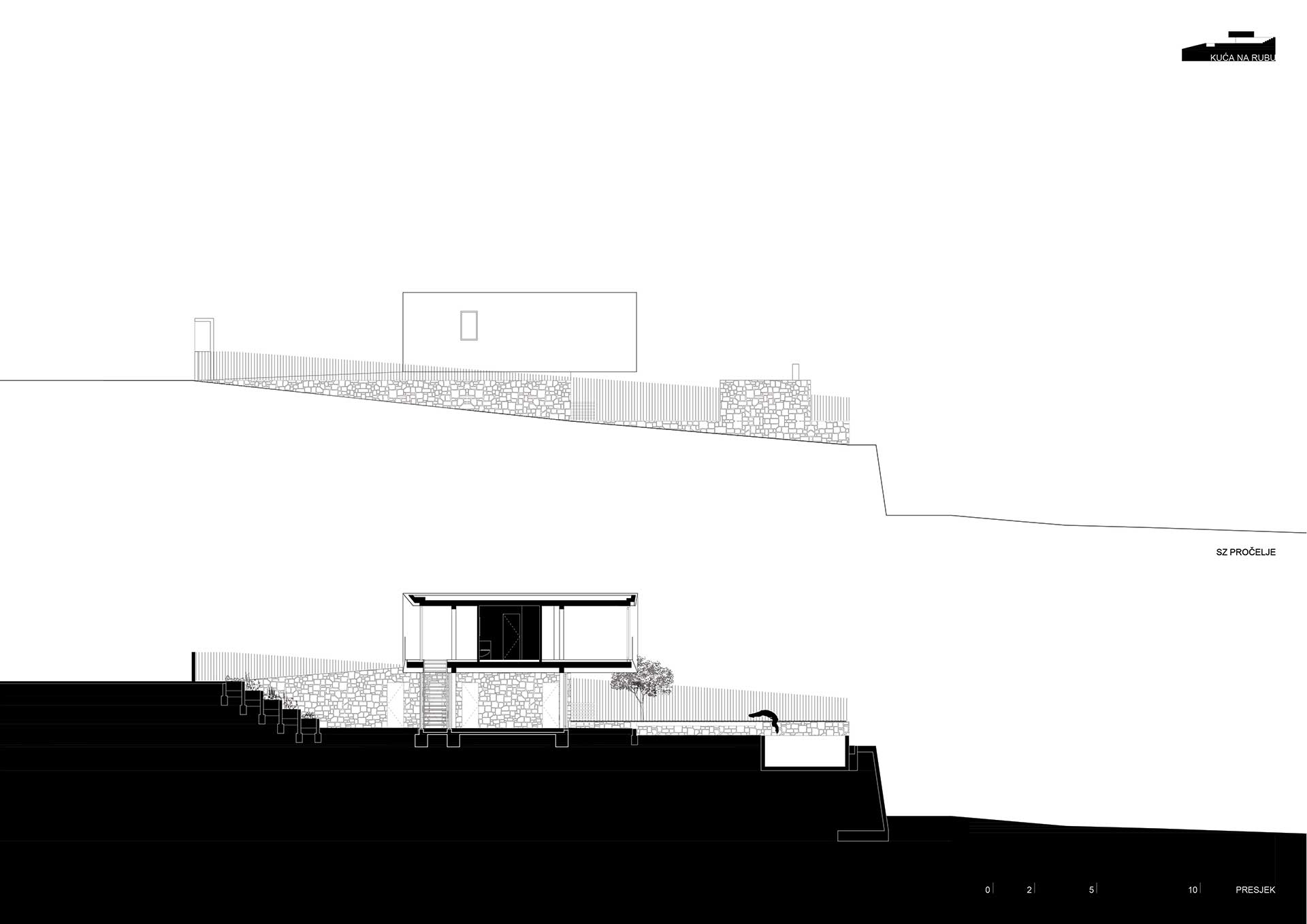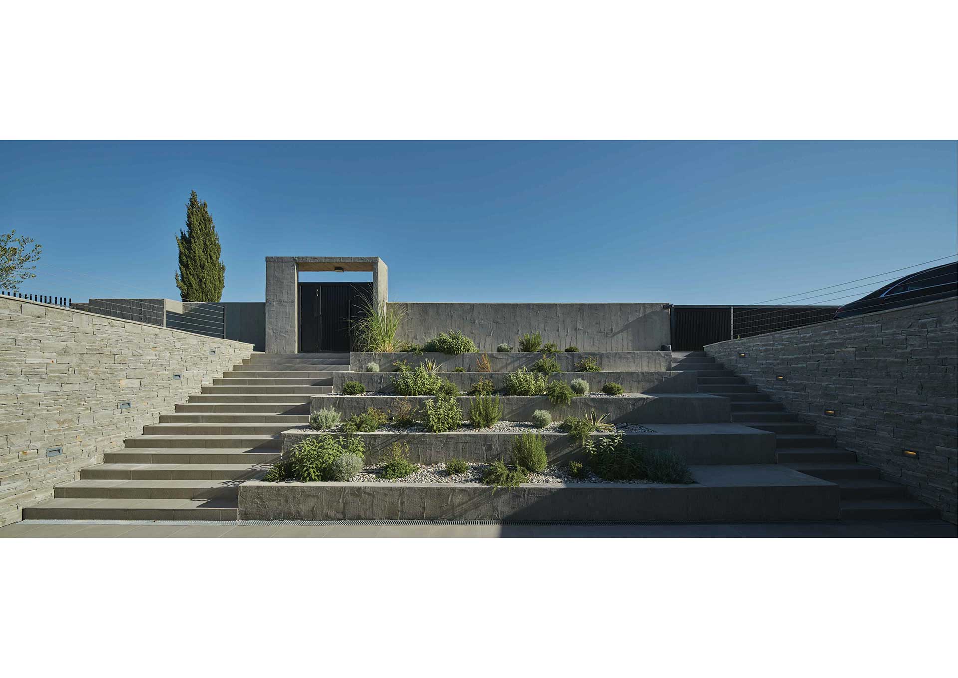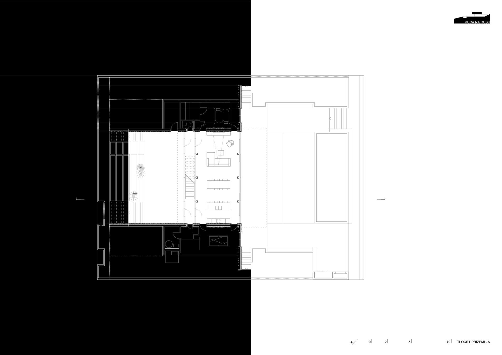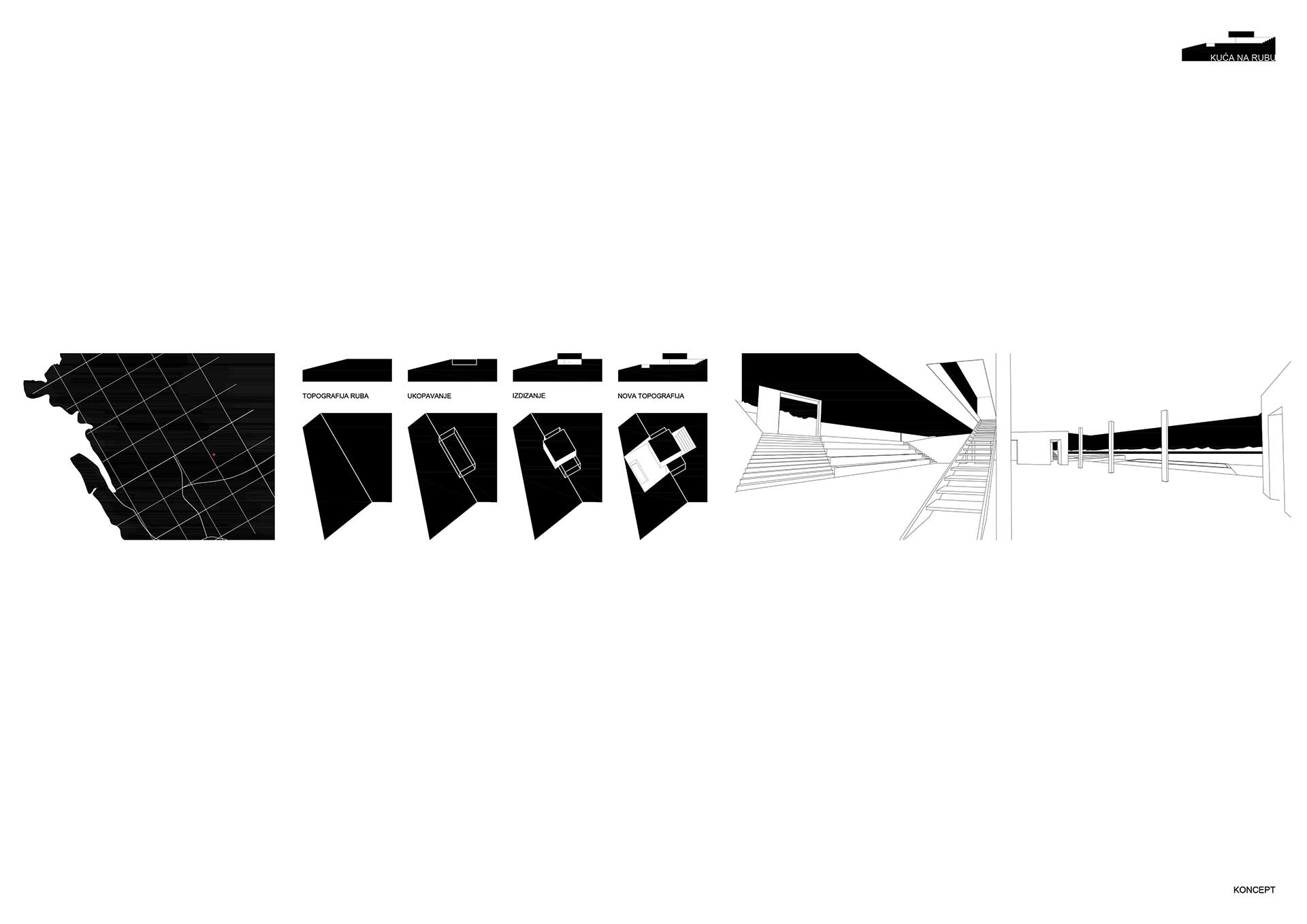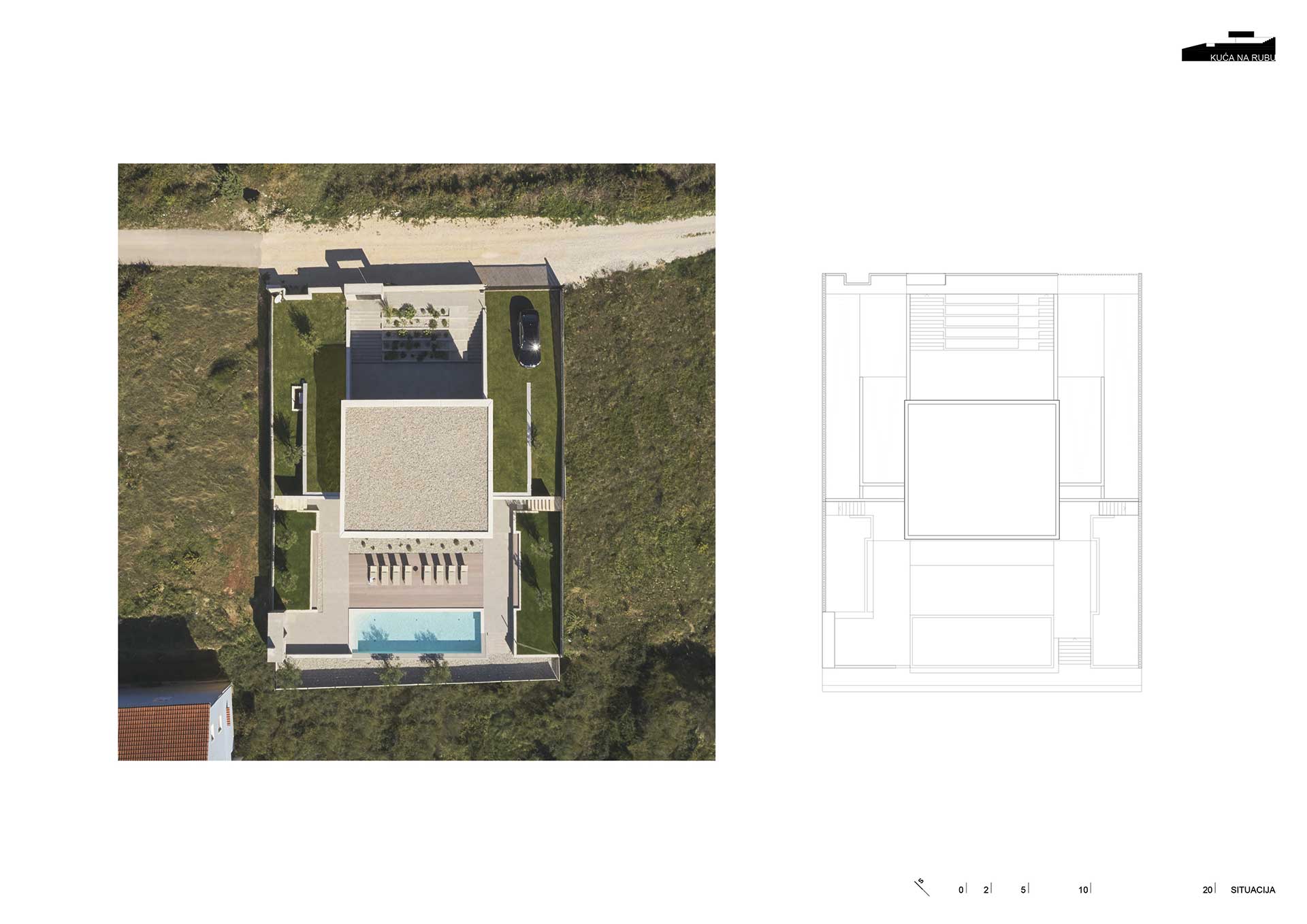 Arhitektura prostora kuće se formira u skladu s topografijom, paralelno s hrbtom ukopana u okolni teren. Dio sadržaja građevine izdignut iz prizemlja iznad hrbta stvara novododani prostor boravišta ispod. Denivelacija terena okomito na smjer pružanja ukopanog dijela kuće stvara ekstenziju boravka u vanjski, otvoreni prostor ulaznog dvorišta, odnosno vrta prema gradu. Aksijalni prodor (carda) dematerijalizira prizemlje kuće i tvori jedinstveni natkriveni prostor življenja vizualno i klimatski povezan s nasuprotnim odrednicama krajolika (morem i planinom). Neobuzdana i divlja priroda ulazi u areal kuće kultivirana terasatim plohama ulaznog dvorišta i krovnim vrtom prizemlja prelazi preko prostora kuće.
