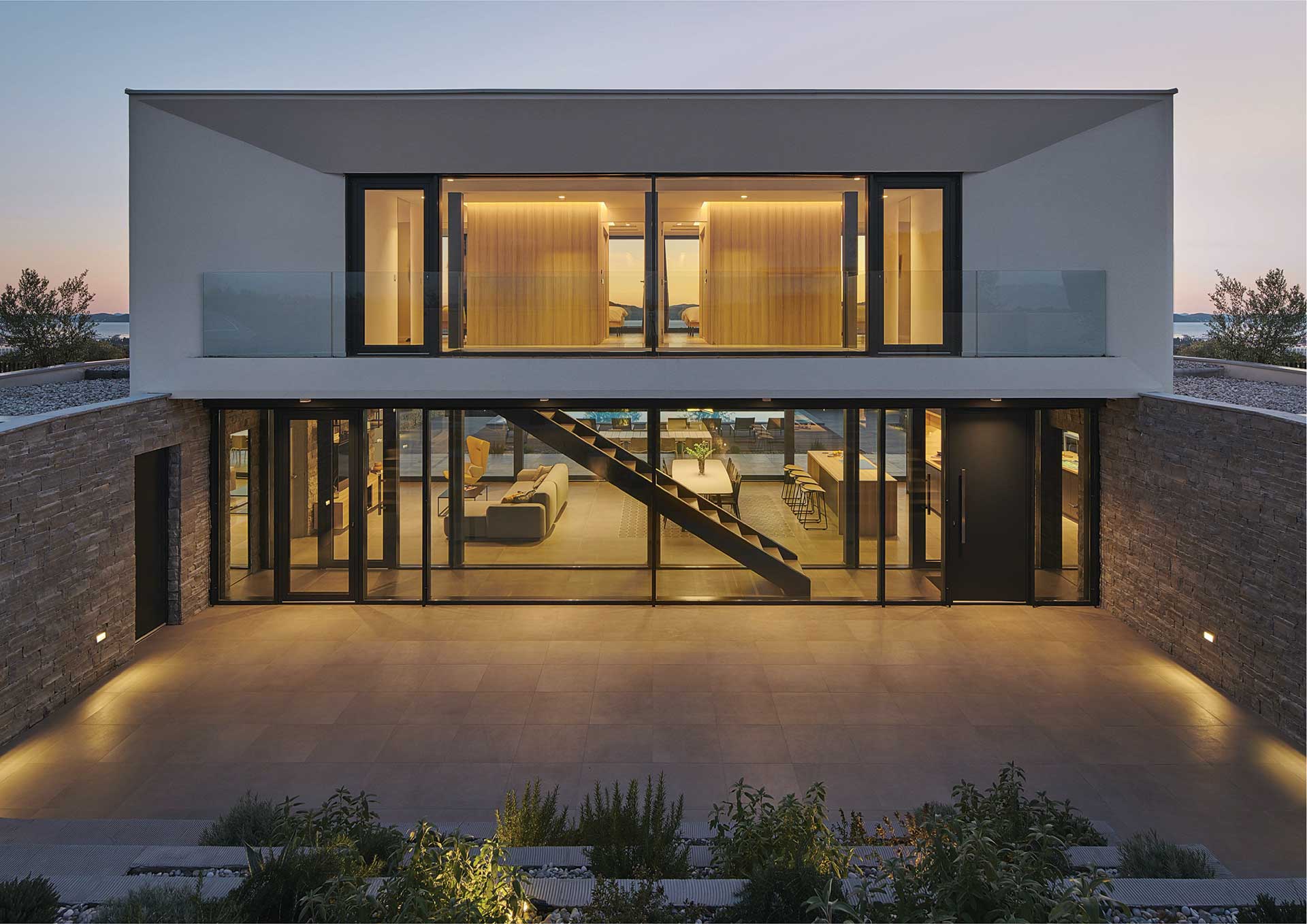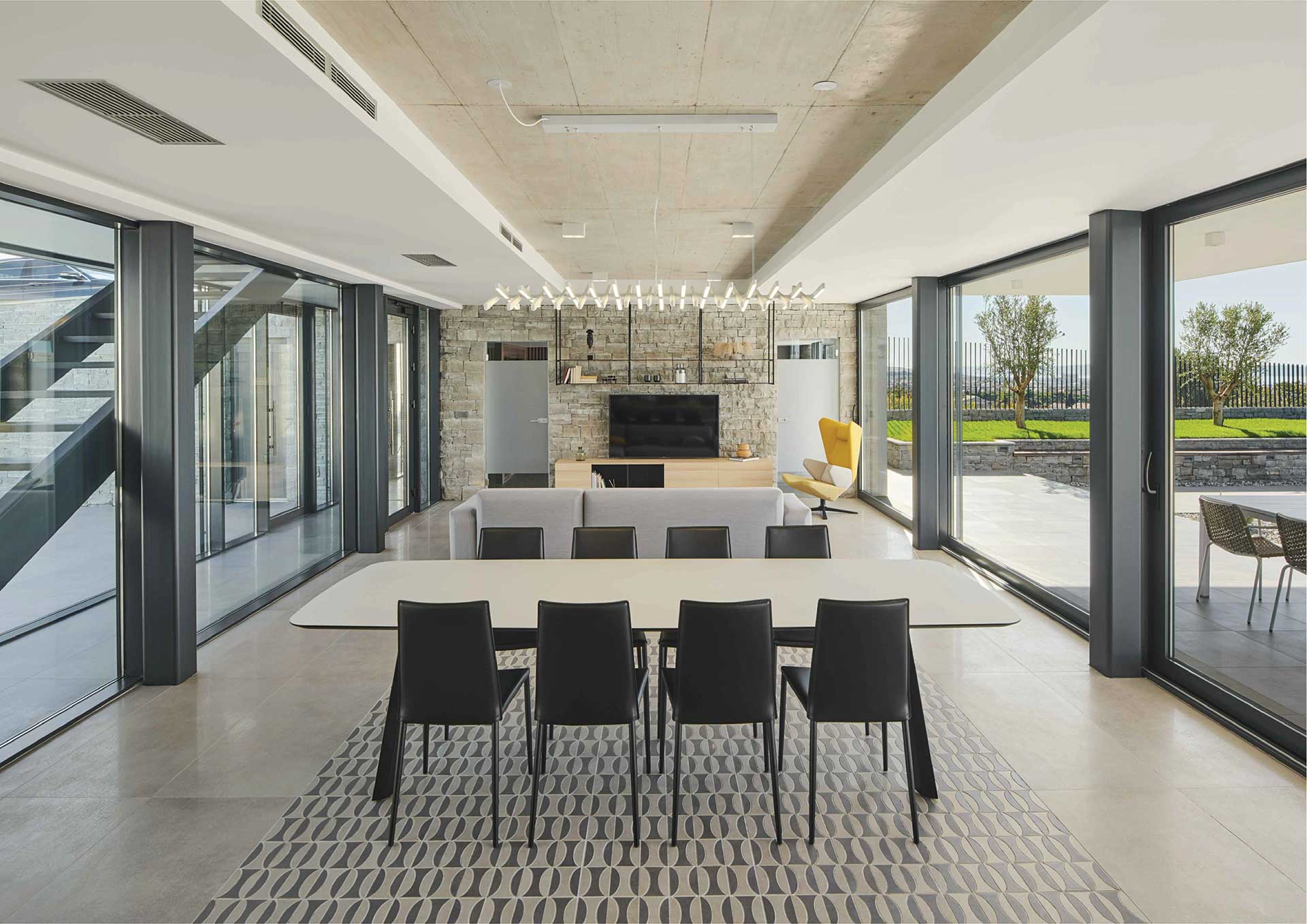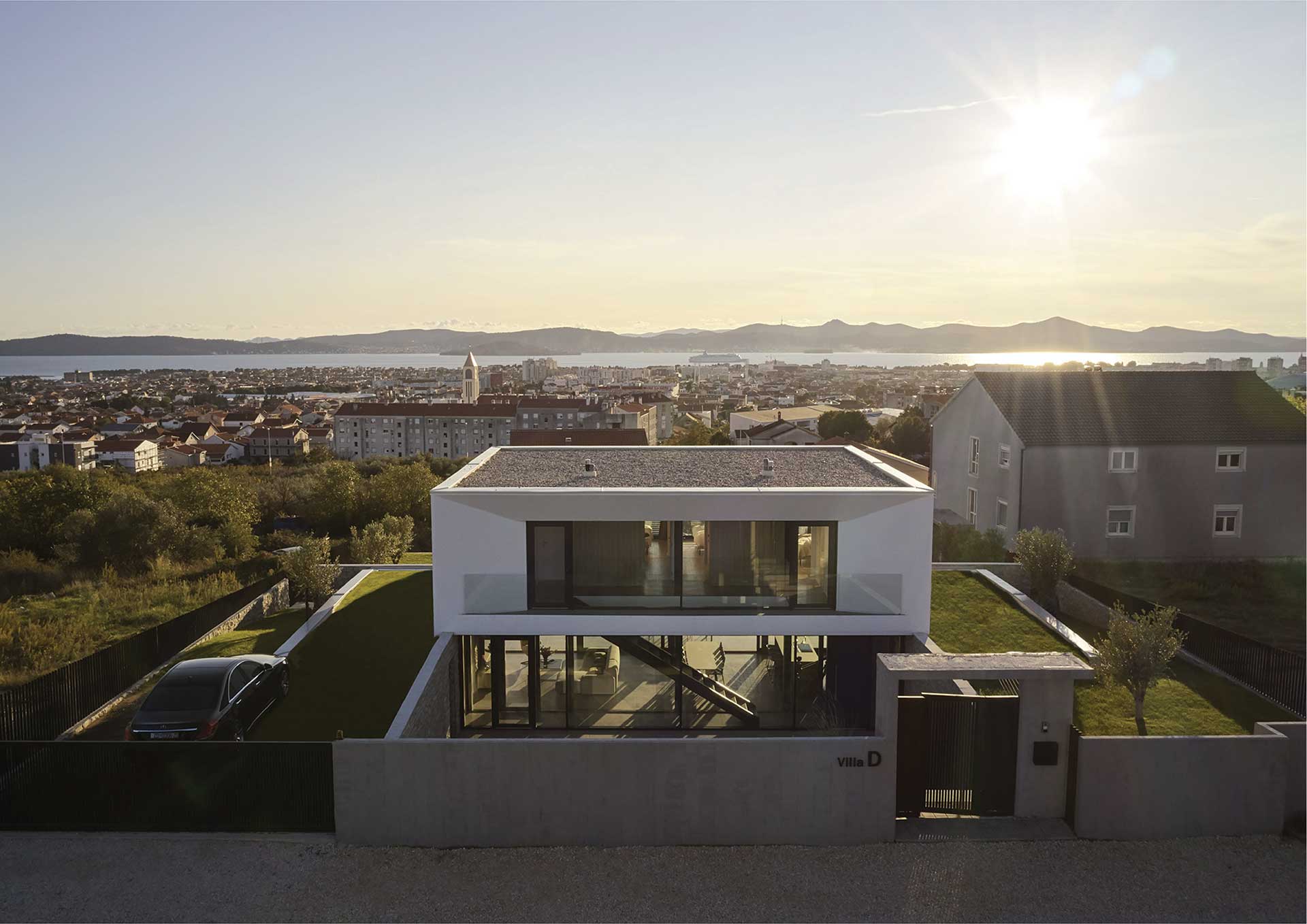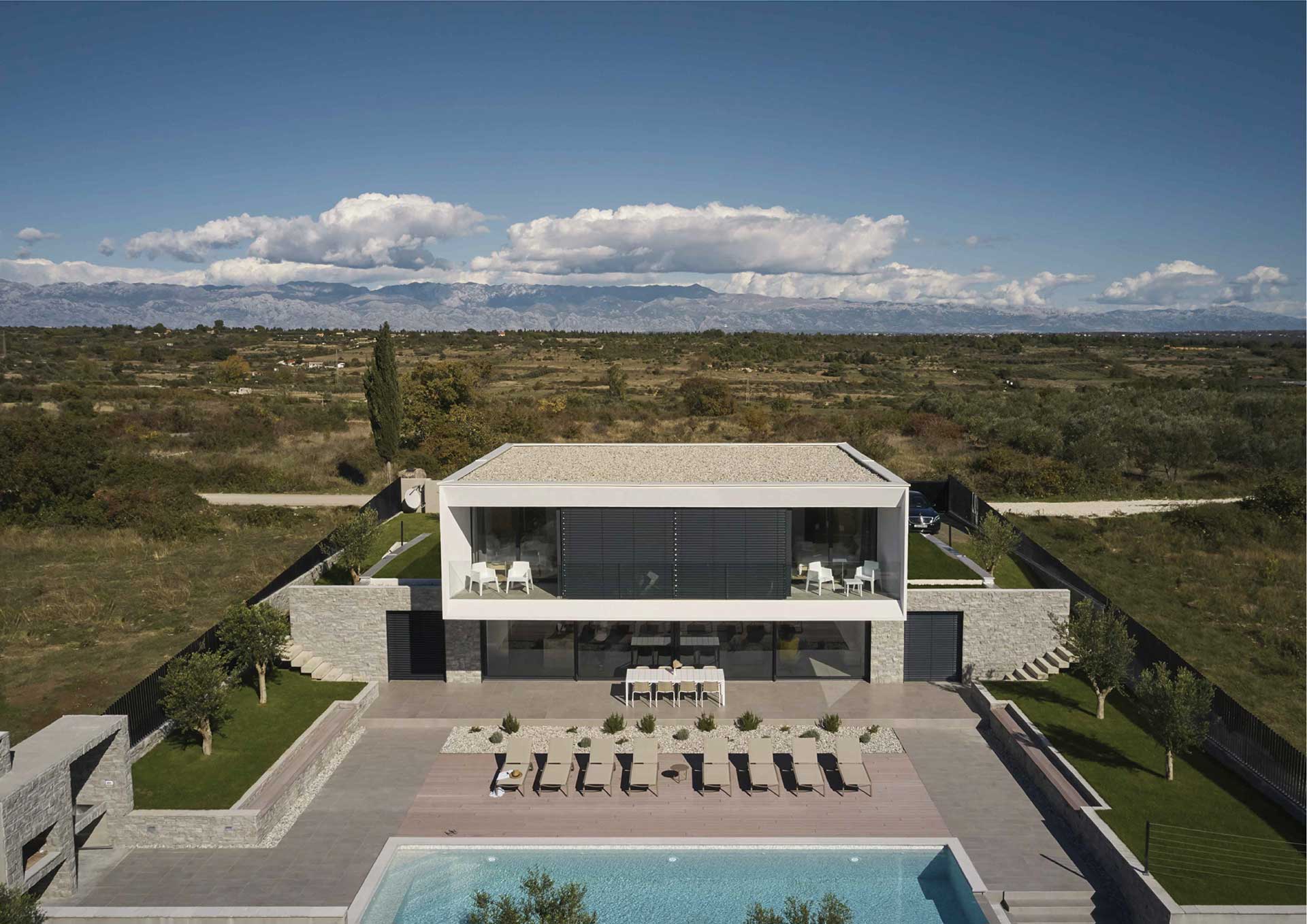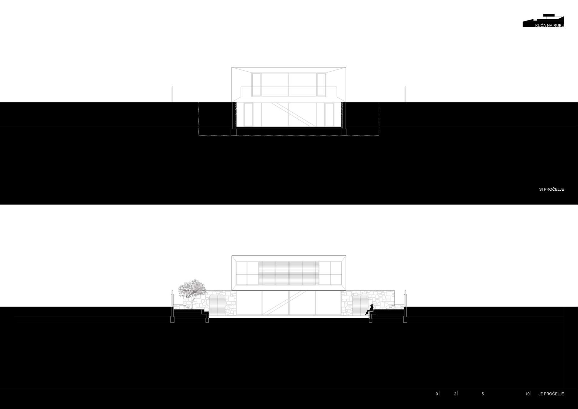 Arhitektura prostora kuće se formira u skladu s topografijom, paralelno s hrbtom ukopana u okolni teren. Dio sadržaja građevine izdignut iz prizemlja iznad hrbta stvara novododani prostor boravišta ispod. Denivelacija terena okomito na smjer pružanja ukopanog dijela kuće stvara ekstenziju boravka u vanjski, otvoreni prostor ulaznog dvorišta, odnosno vrta prema gradu. Aksijalni prodor (carda) dematerijalizira prizemlje kuće i tvori jedinstveni natkriveni prostor življenja vizualno i klimatski povezan s nasuprotnim odrednicama krajolika (morem i planinom). Neobuzdana i divlja priroda ulazi u areal kuće kultivirana terasatim plohama ulaznog dvorišta i krovnim vrtom prizemlja prelazi preko prostora kuće.