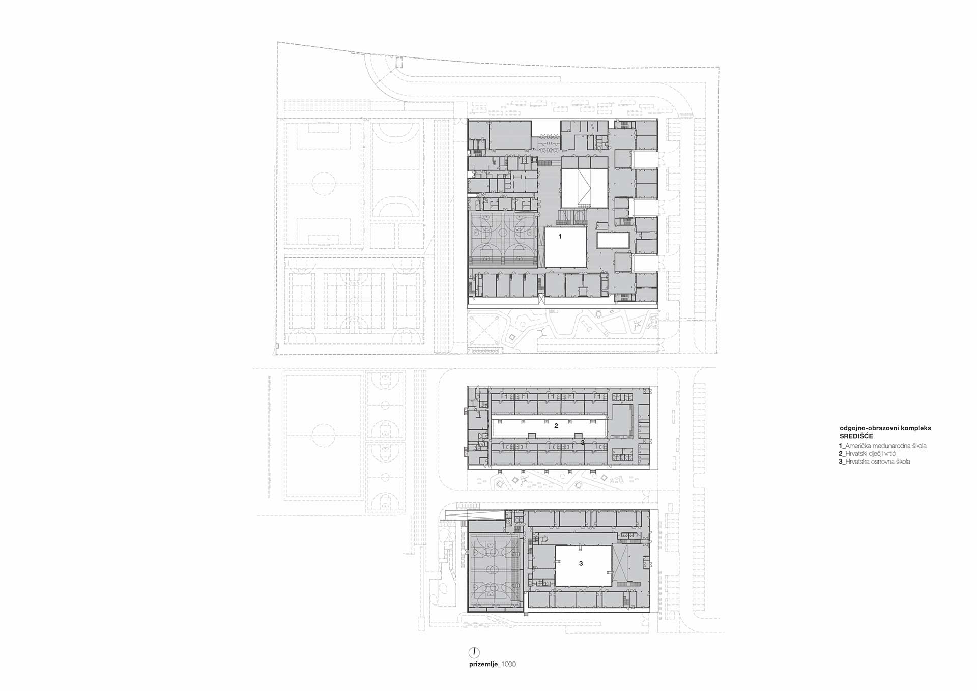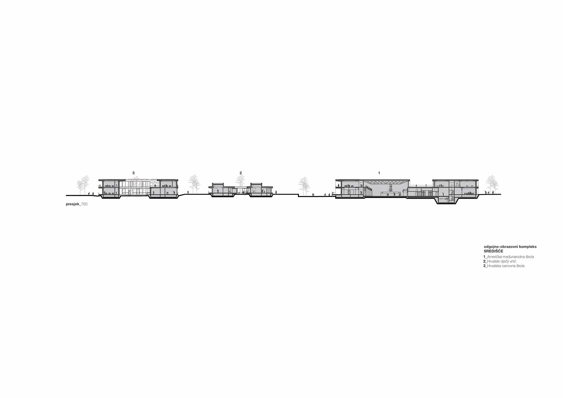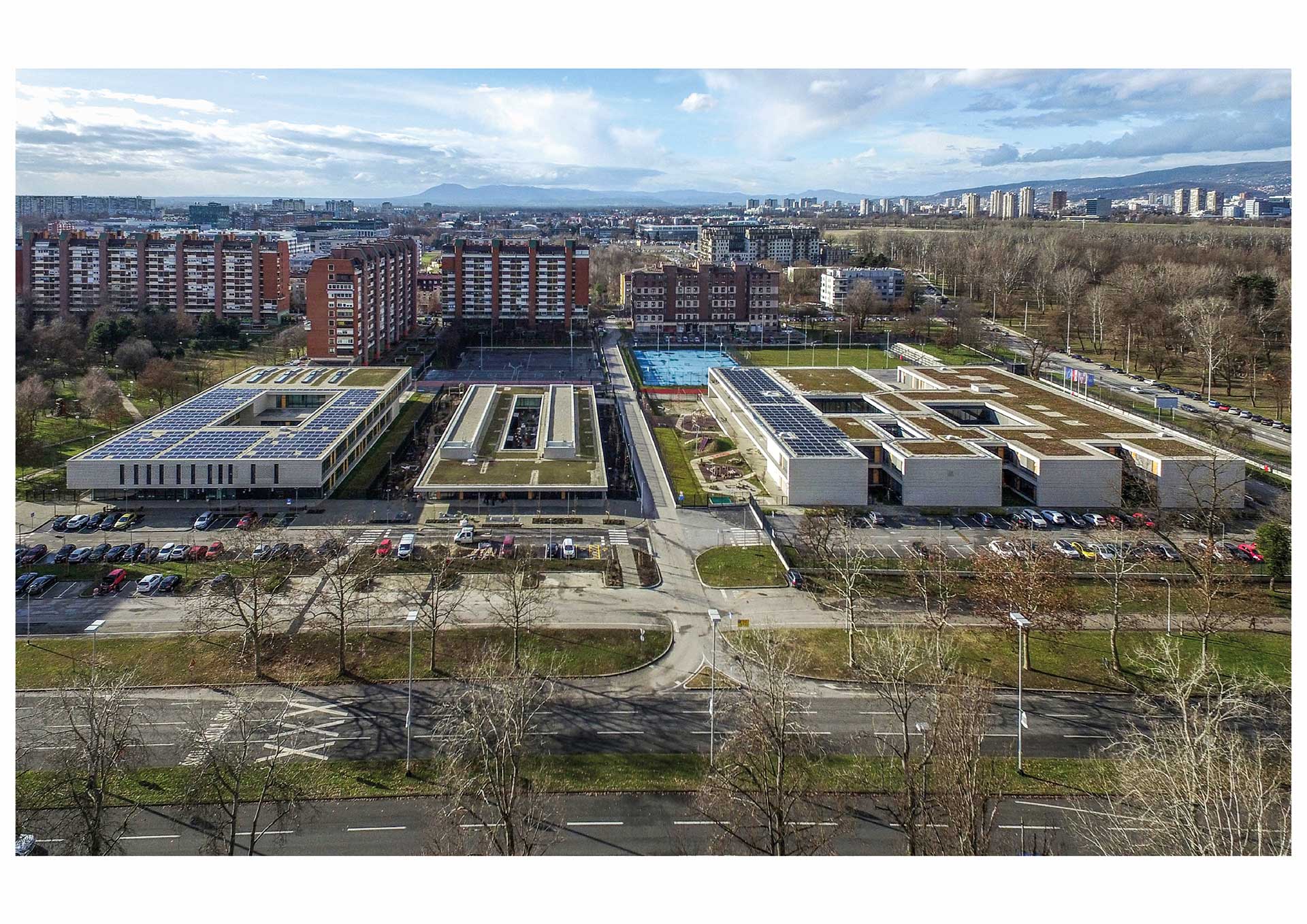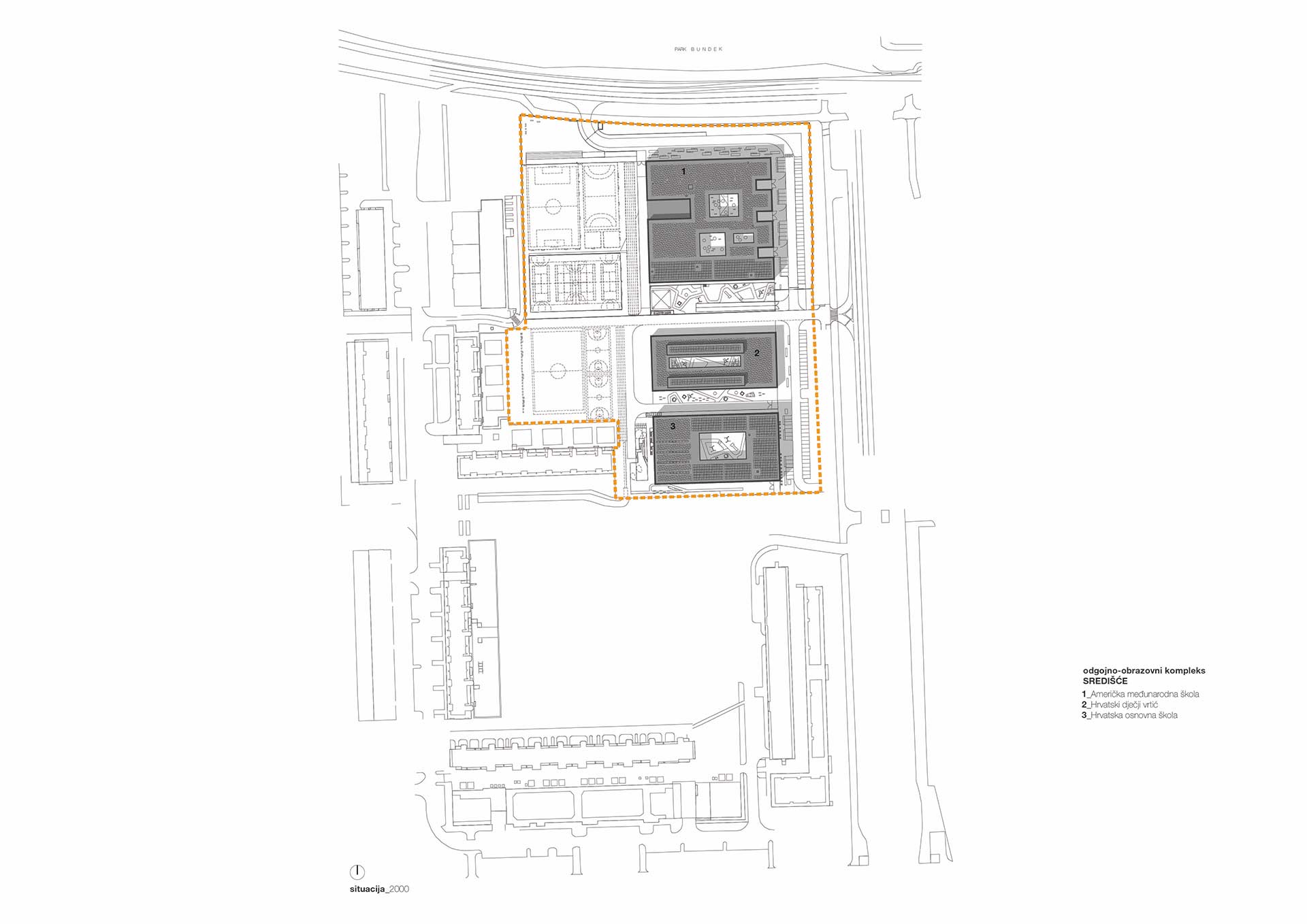 Pristup urbanoj dispoziciji naslonjen je na plansku matricu Novog Zagreba. Kompoziciju čini linearan potez ortogonalnih građevina uz istočnu marginu parcele. Kuće drže isti pravac-obostrani perimetar i strogi visinski međuodnos. Američka škola formira sjeveroistočni kut, hrvatska osnovna škola jugoistočni, a dječji vrtić je neutralna, niska struktura u sredini. Objekti su istog nazivnika, u dijalogu oblika i strukture, grade prostor oko unutrašnjih dvorišta i naglašavaju intimnost odnosno sigurnost introvertiranog. Zgrade su niskoenergetske i orjentacija je strogo determinirana funkcionalnom postavkom optimalnog osvjetljenja u smjeru sjever-jug na stranama gdje su objekti otvoreni–ostakljeni, odnosno istok zapad gdje dominira ploha punog zida.