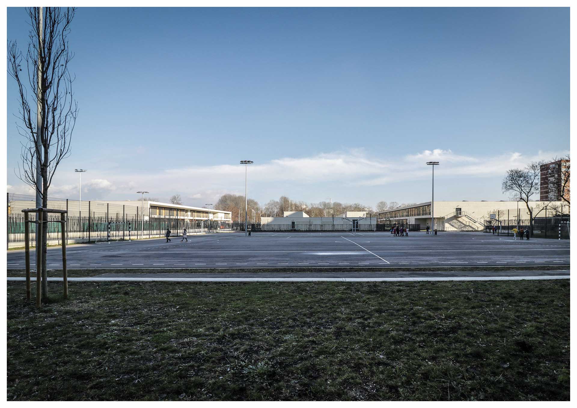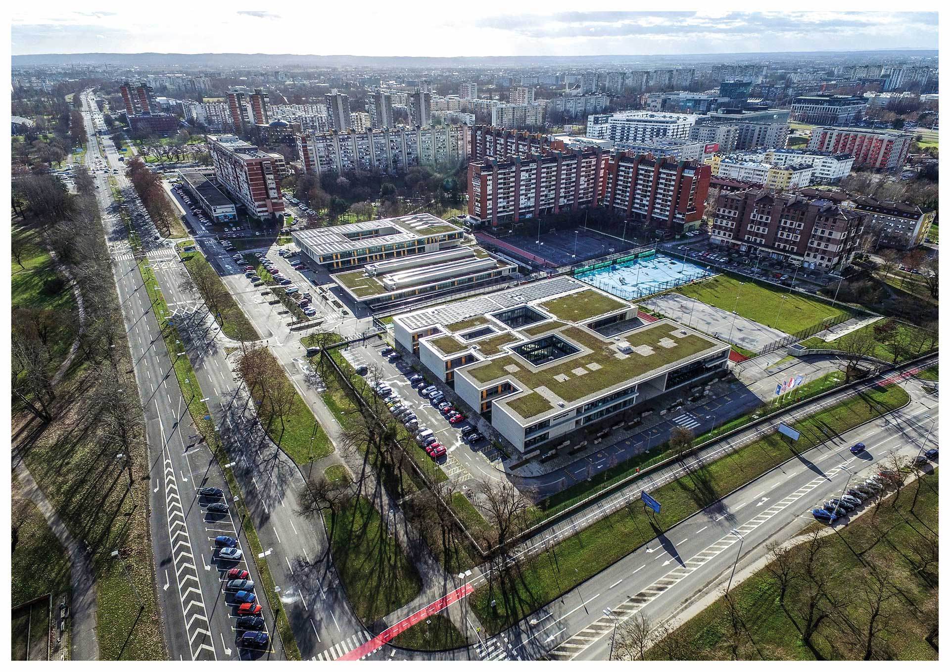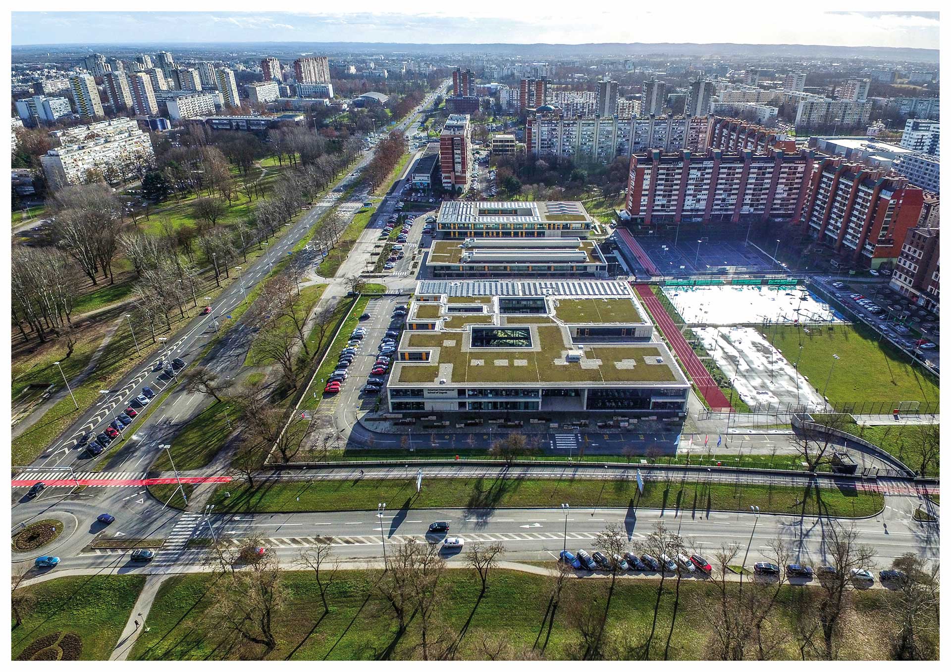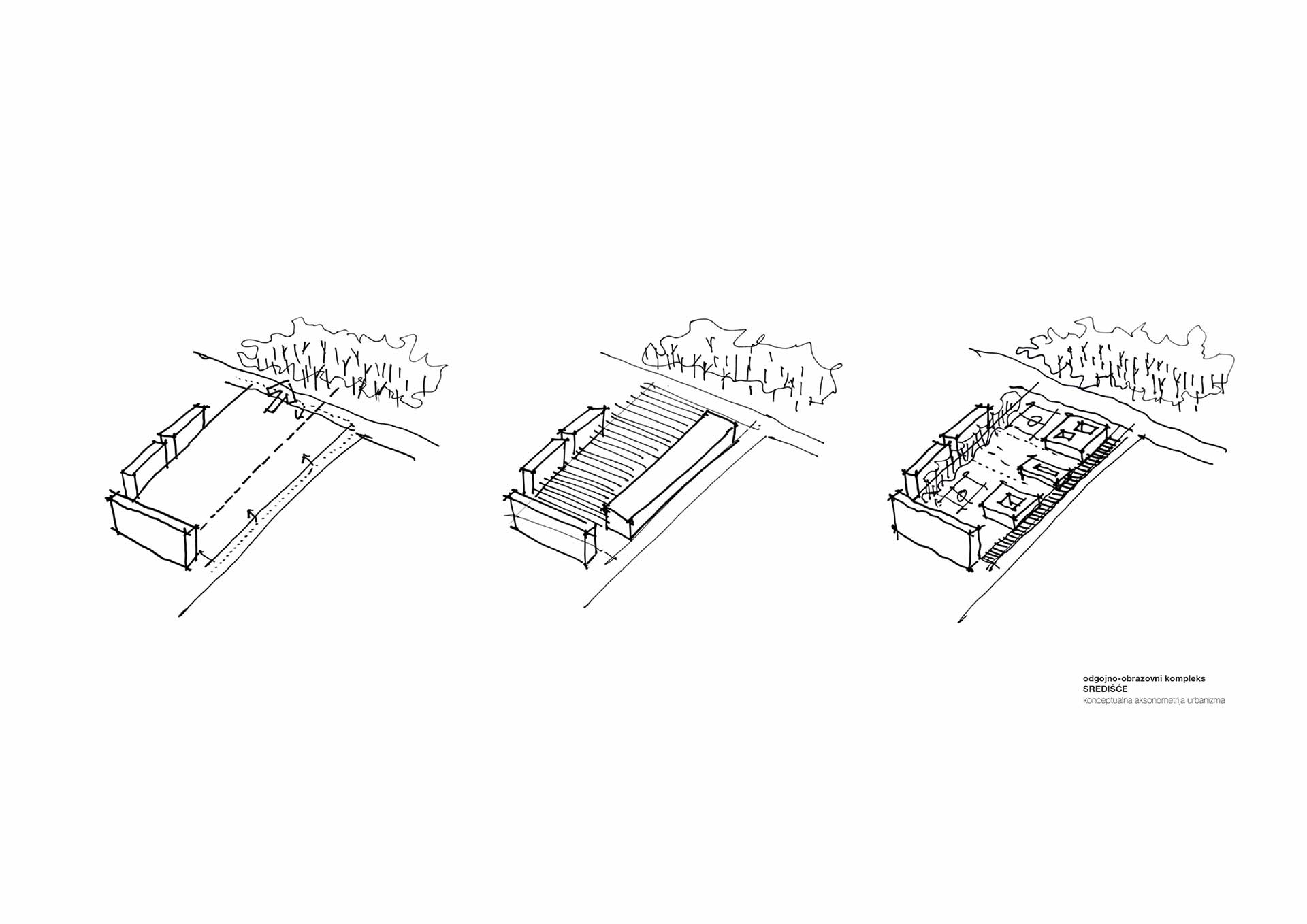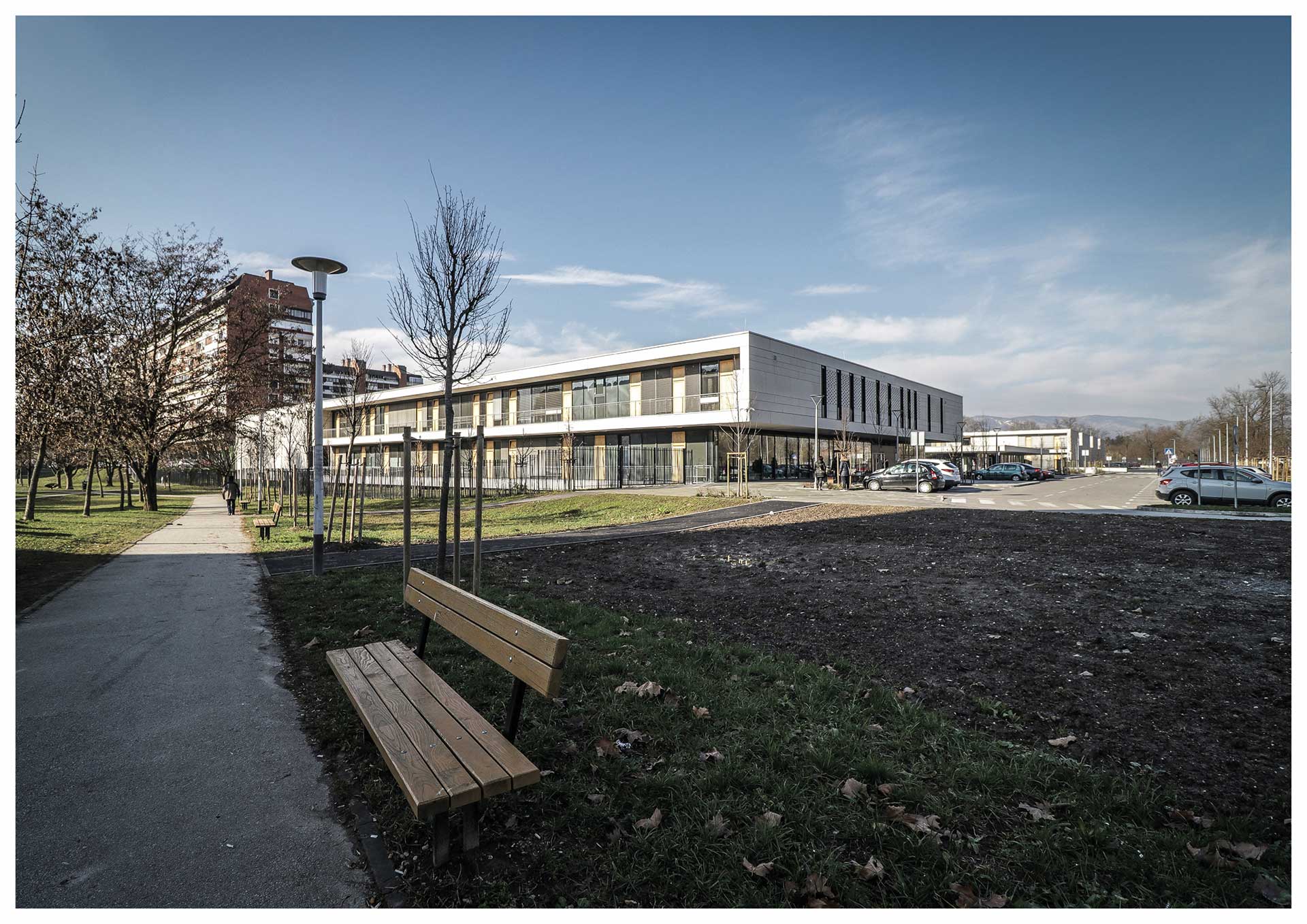 Pristup urbanoj dispoziciji naslonjen je na plansku matricu Novog Zagreba. Kompoziciju čini linearan potez ortogonalnih građevina uz istočnu marginu parcele. Kuće drže isti pravac-obostrani perimetar i strogi visinski međuodnos. Američka škola formira sjeveroistočni kut, hrvatska osnovna škola jugoistočni, a dječji vrtić je neutralna, niska struktura u sredini. Objekti su istog nazivnika, u dijalogu oblika i strukture, grade prostor oko unutrašnjih dvorišta i naglašavaju intimnost odnosno sigurnost introvertiranog. Zgrade su niskoenergetske i orjentacija je strogo determinirana funkcionalnom postavkom optimalnog osvjetljenja u smjeru sjever-jug na stranama gdje su objekti otvoreni–ostakljeni, odnosno istok zapad gdje dominira ploha punog zida.