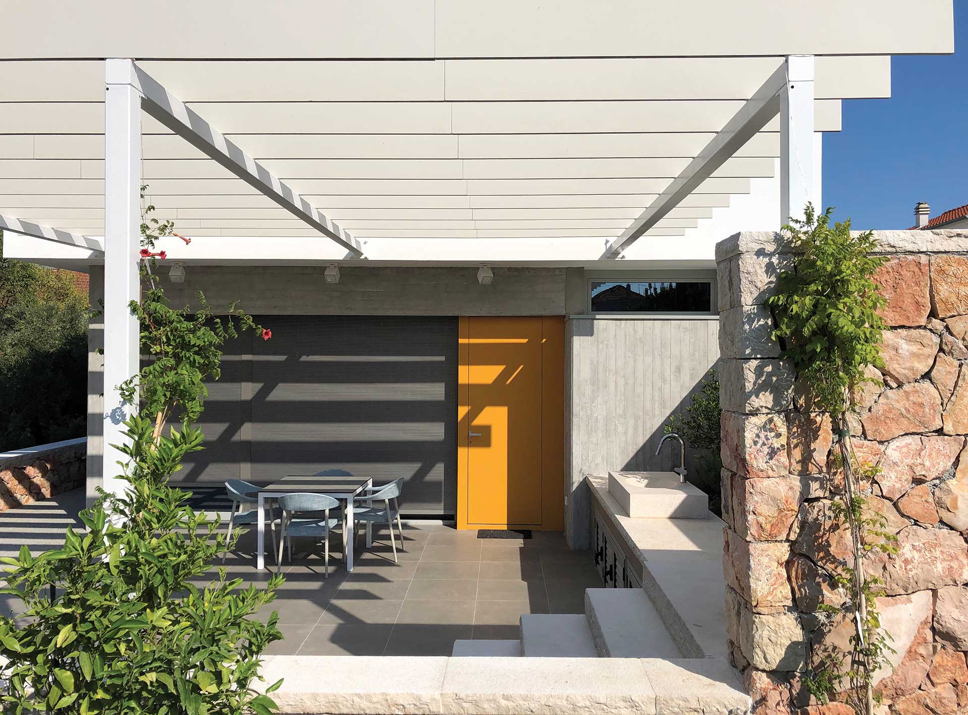 Središnja terasa , otvorena je moru, sjeveru, a s južne strane zatvorena dubokom, rešetkastom intarzijom koja, uz zaštitu od vanjskog pogleda, služi i za poprečno prozračivanje te bogato proporcionira i ritmizira glatko žbukano ulično pročelje izduženog kubusa kata.