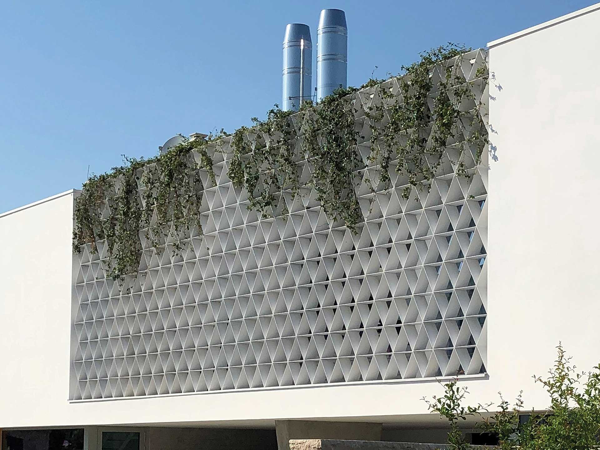 Tradicionalno vezani za prostorije s ognjištem, FUMARI izviru iz zone ljetnih kuhinja natkrivenih betonskim koritom iz kojih se geometrijska struktura rešetke prepliće slapovima zelenila. Ostatak vertikalnih instalacija skrivaju asimetrične forme razvijenog betonskog plašta koje oblikuju peto pročelje.