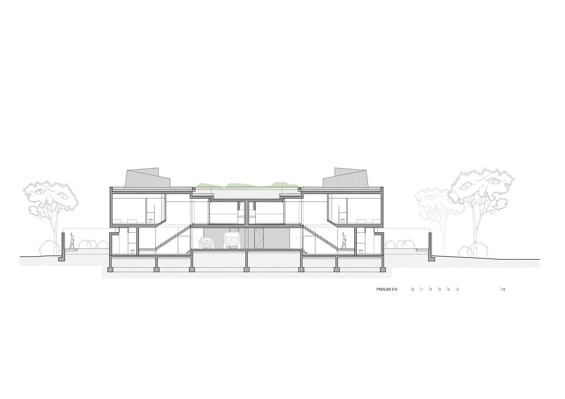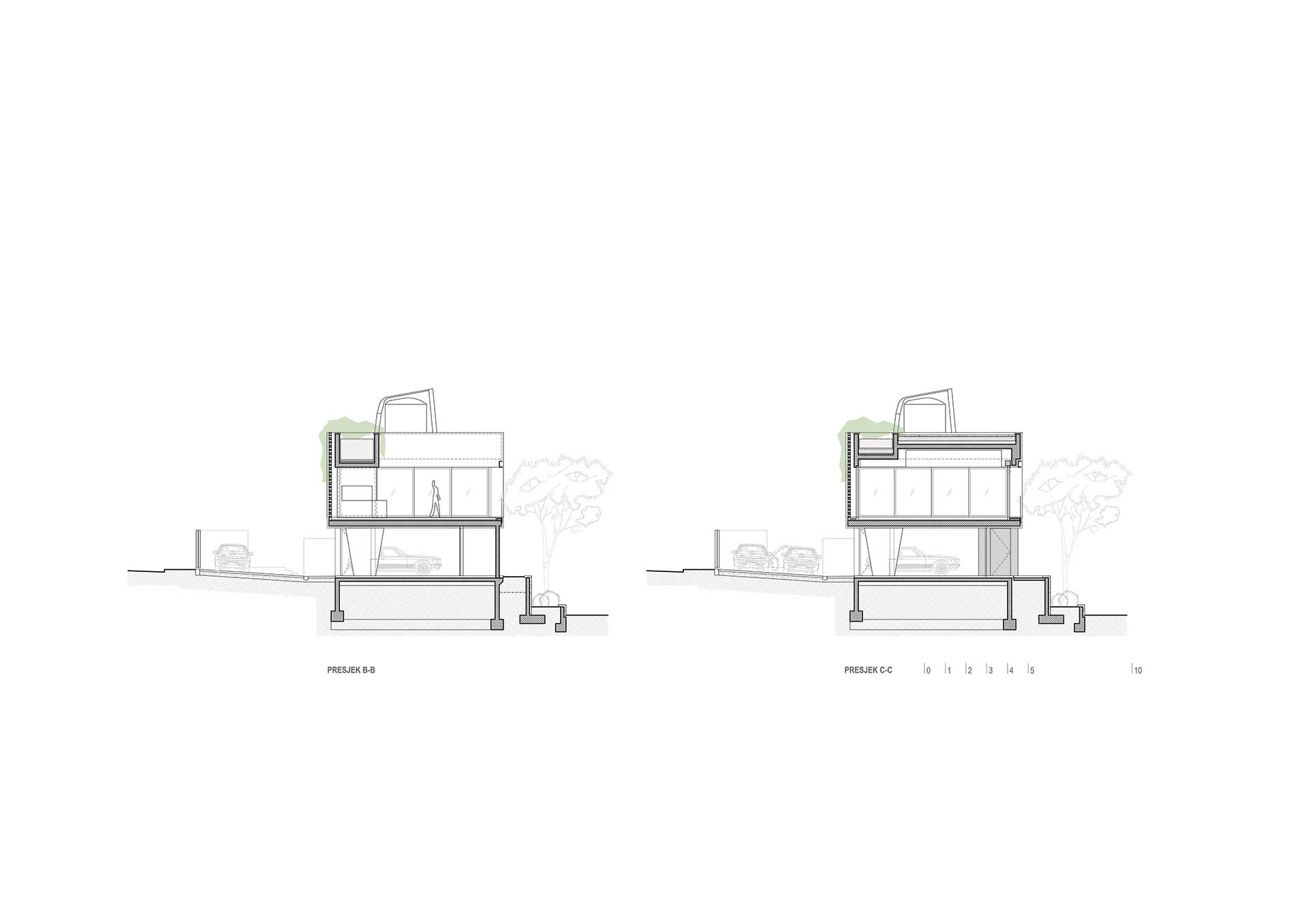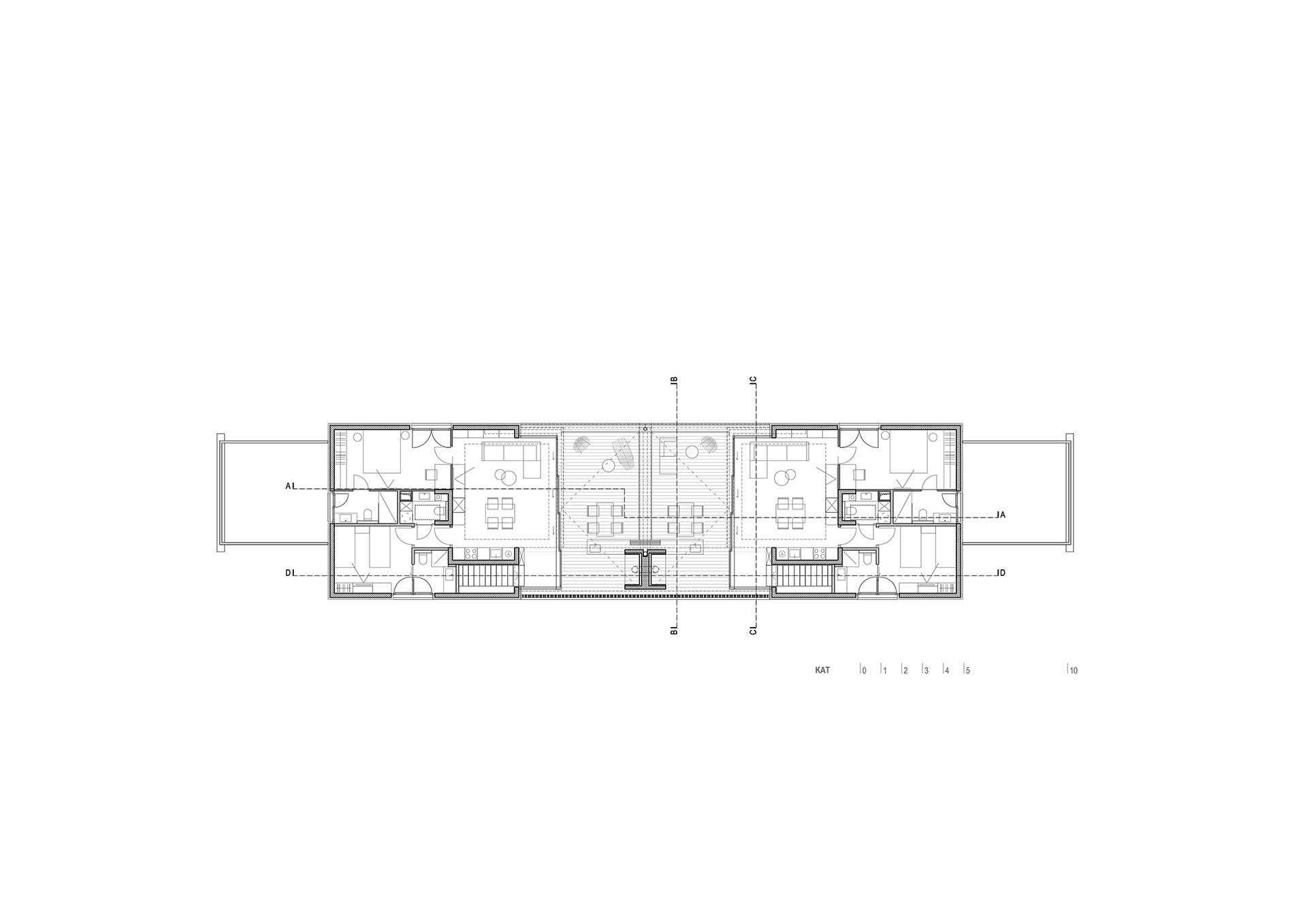 Betonski kubusi manjih jedinica u prizemlju formiraju otvoreno parkiralište, natkriveno volumenom kata, unutar kojeg veće jedinice flankiraju središnju vanjsku prostoriju odijeljene/spojene terase. Oblikovna posljedica ovakvog razdjela, suženi je prozračni postament na koji je položen istaknuti piano nobile koji priziva oblik MORTARA, kako u tlocrtu tako i u presjeku.