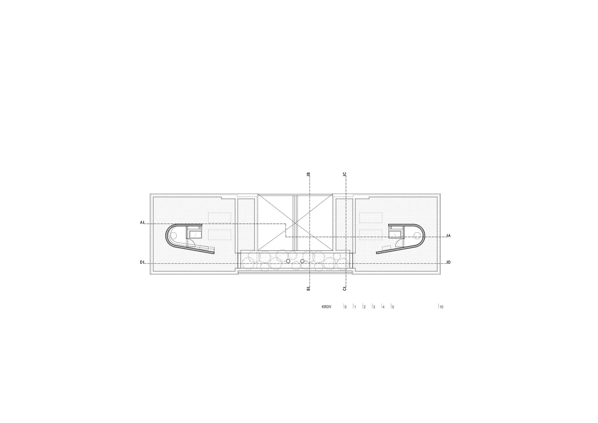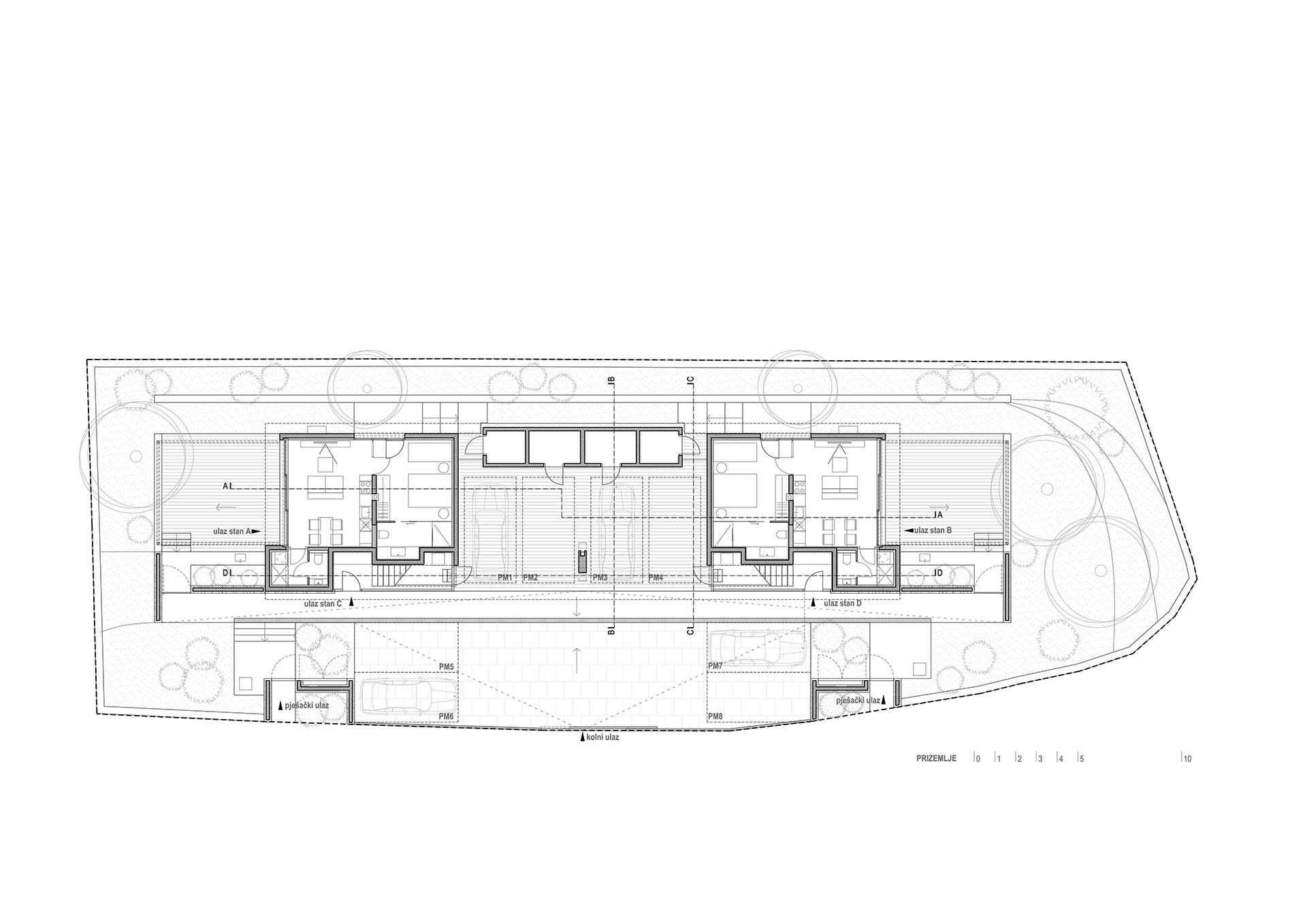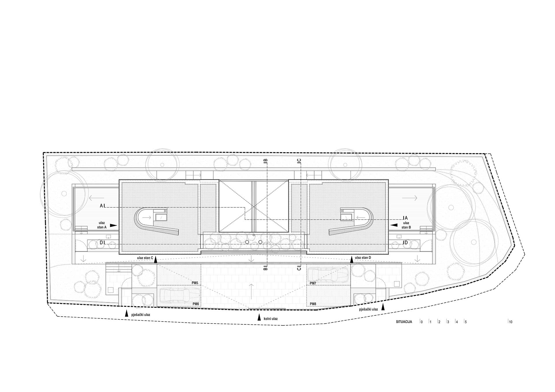 Betonski kubusi manjih jedinica u prizemlju formiraju otvoreno parkiralište, natkriveno volumenom kata, unutar kojeg veće jedinice flankiraju središnju vanjsku prostoriju odijeljene/spojene terase. Oblikovna posljedica ovakvog razdjela, suženi je prozračni postament na koji je položen istaknuti piano nobile koji priziva oblik MORTARA, kako u tlocrtu tako i u presjeku.