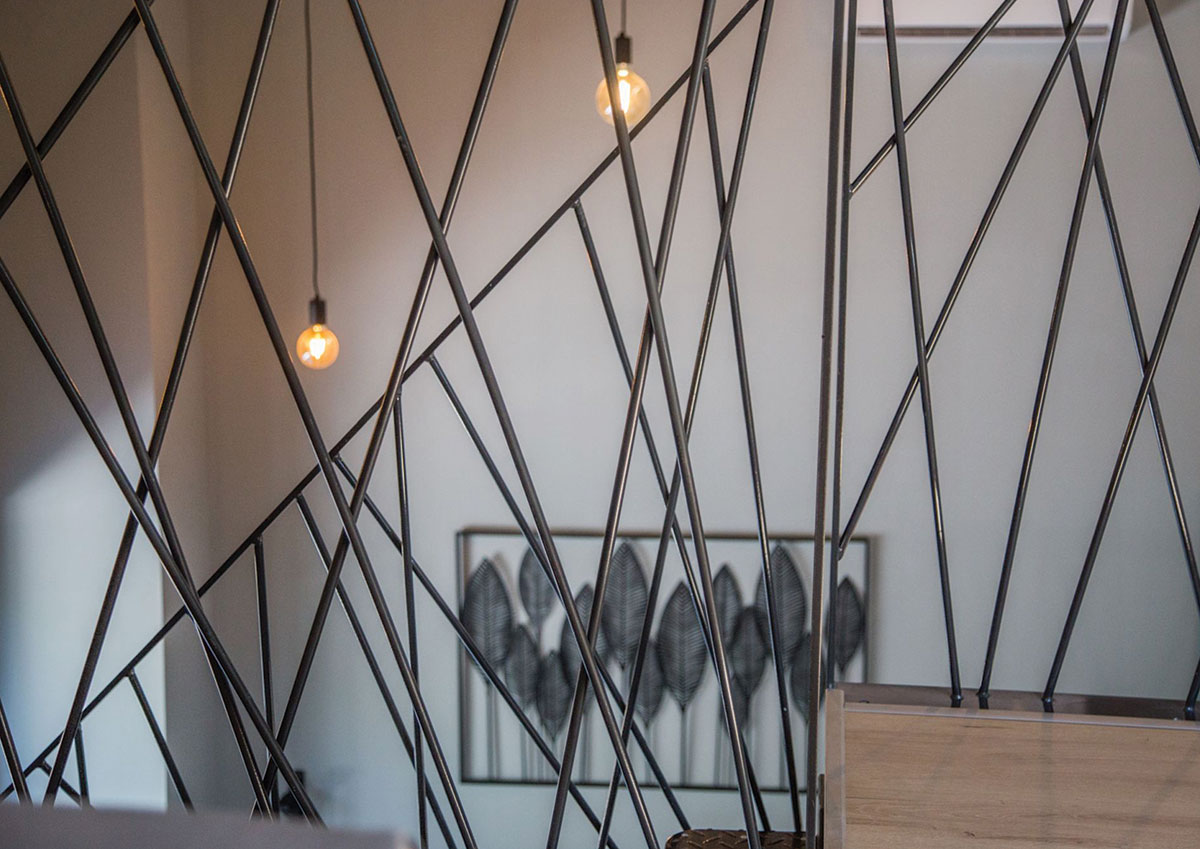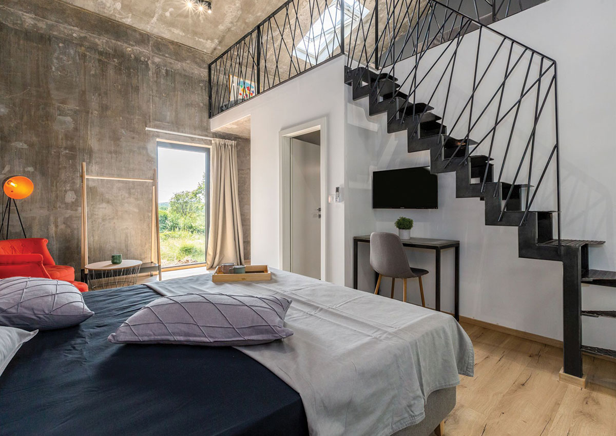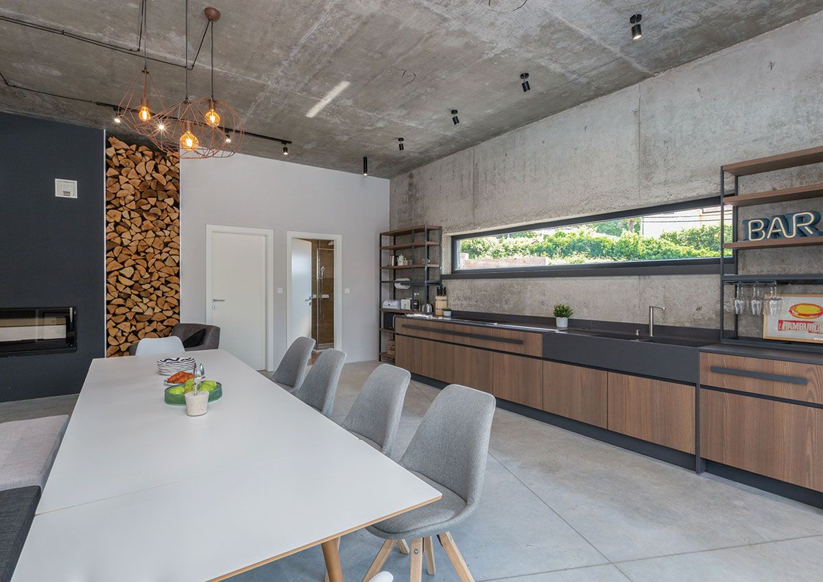 Interijer kombinira ogoljene građevinske materijale, poput betona i vidljivih instalacija, sa udobnim i pažljivo biranim elementima namještaja i dekoracija.