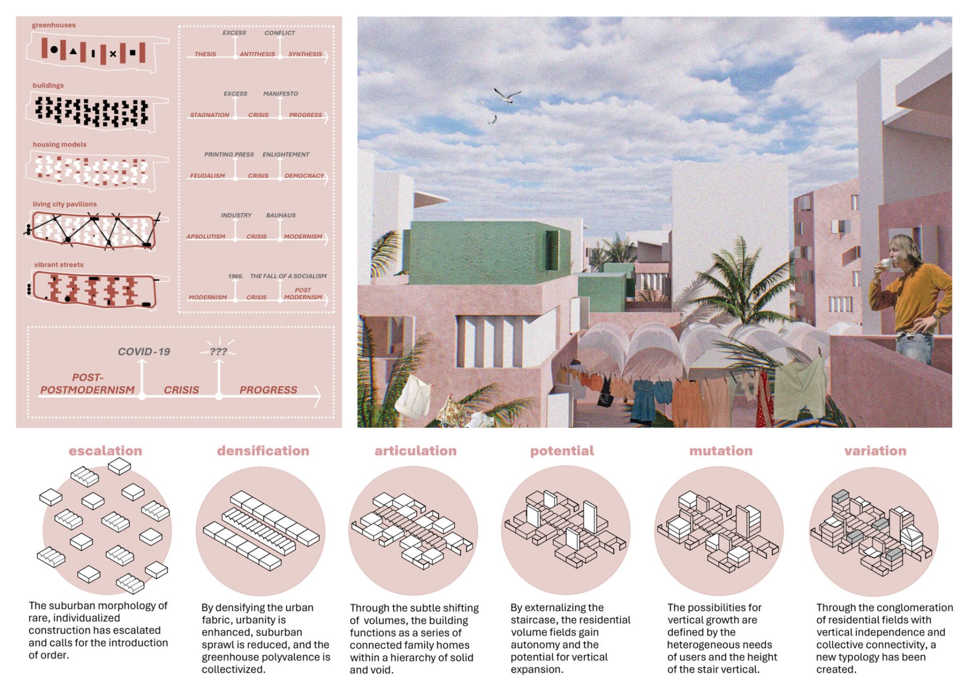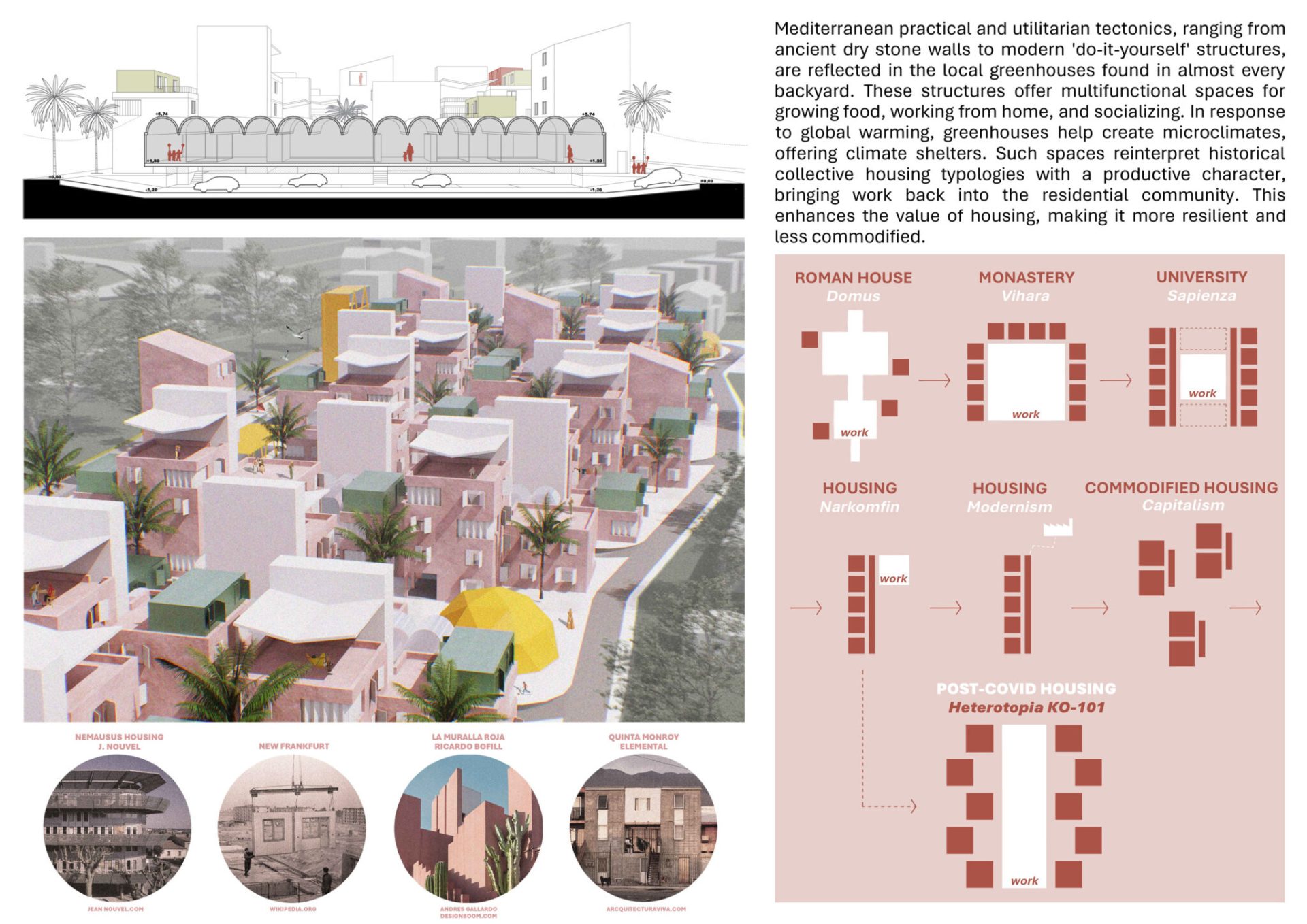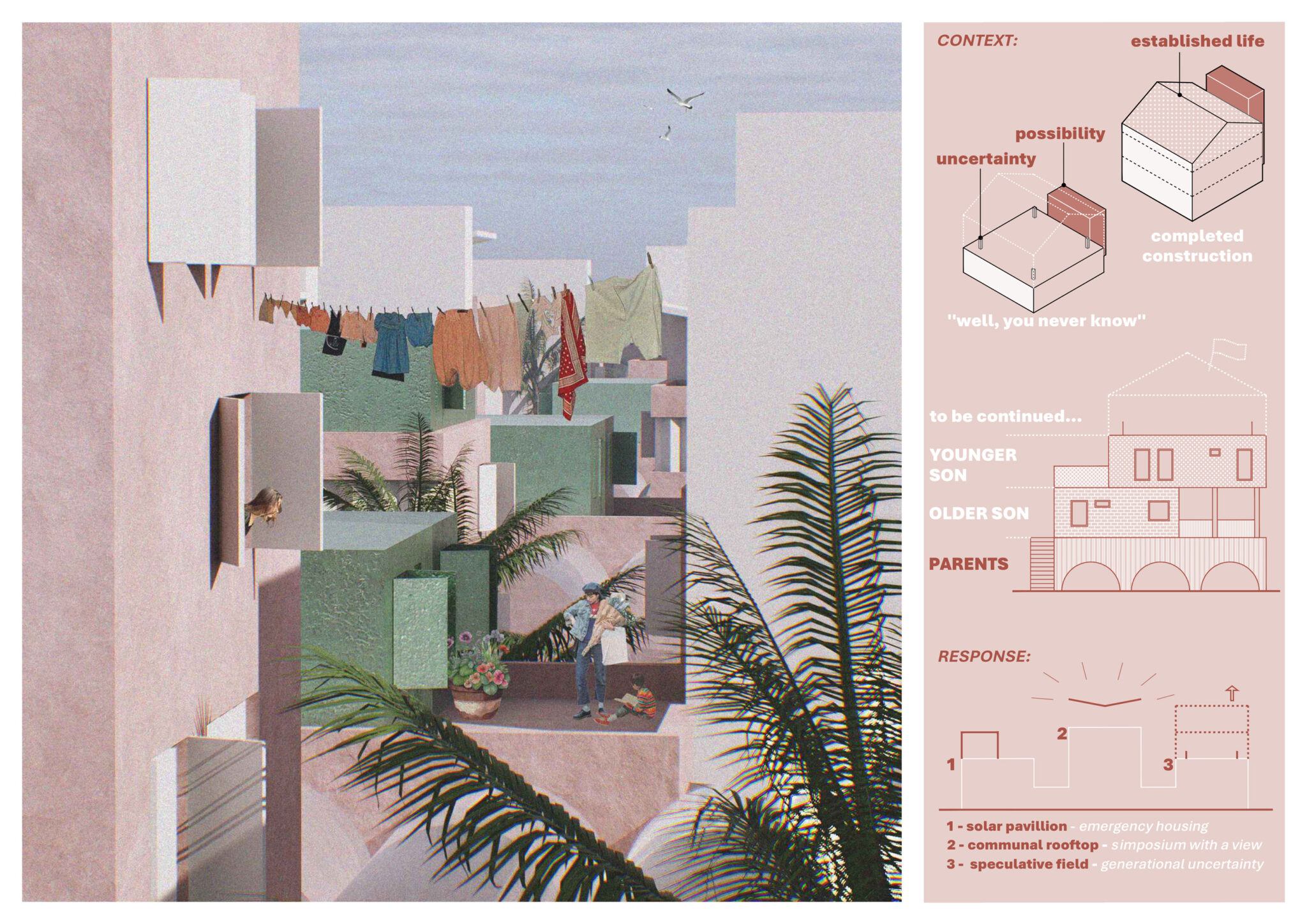 Turistifikacija i manjak gradivog prostora globalni su problemi, izrazito prisutni u Splitu. Stanovništvo se seli prema periferiji, a živi individualizirano, raspršeno i neodrživo. Postojeći stambeni fond krut je i neprilagodljiv. Stanovanje je komodificirano i lišeno svih vrijednosti, posebno onih (re)produktivnih. Priuštivo stanovanje ne postoji, a postojeći modeli namijenjeni su isključivo kreditno sposobnima. Gdje bi trebali živjeti najranjiviji? Može li stanovanje ponovno postati inkluzivno i kontekstualno? Što je s gustoćom i samodostatnošću? Ovaj projekt nudi odgovor – otporan i gust suburbani arhipelag.