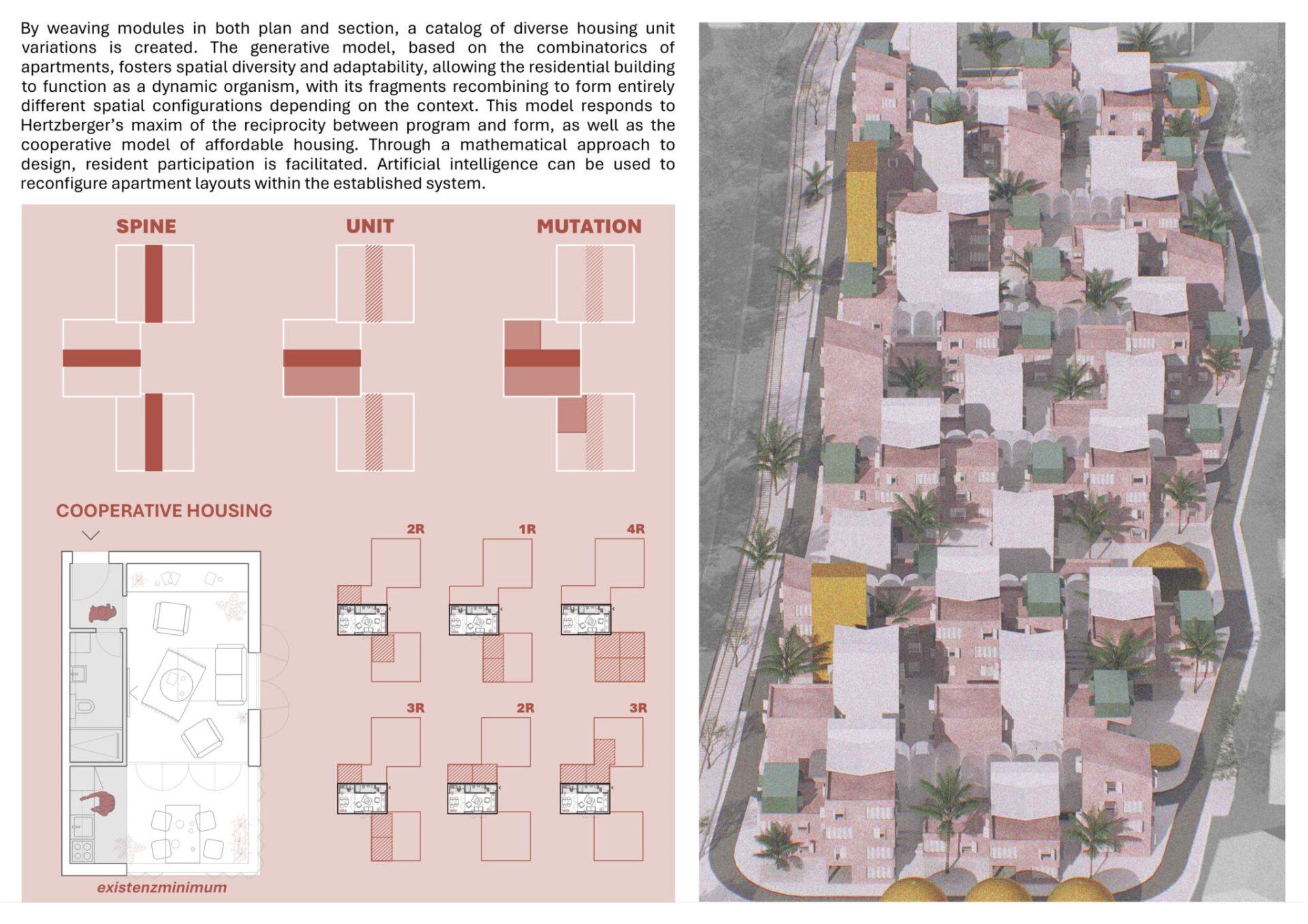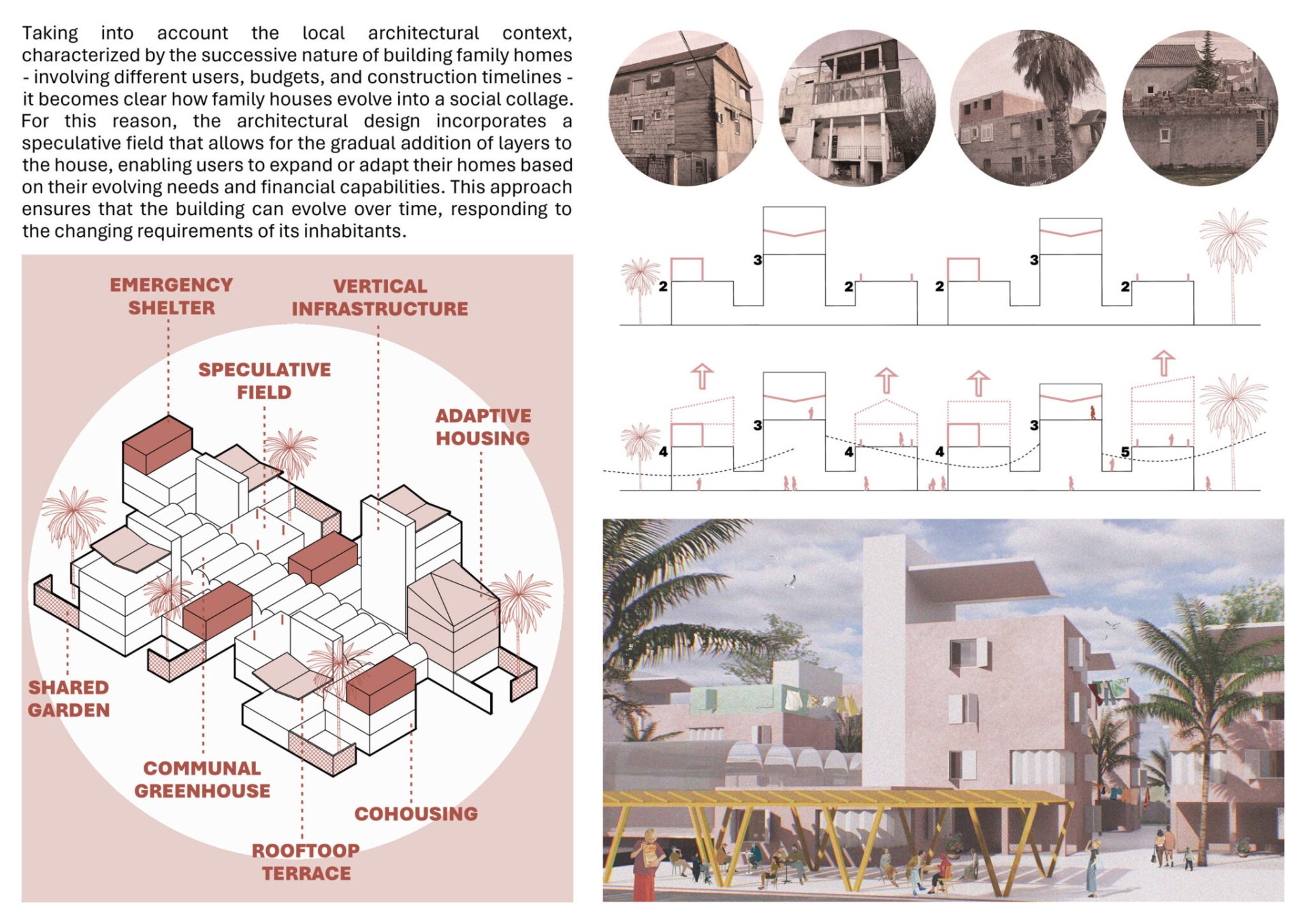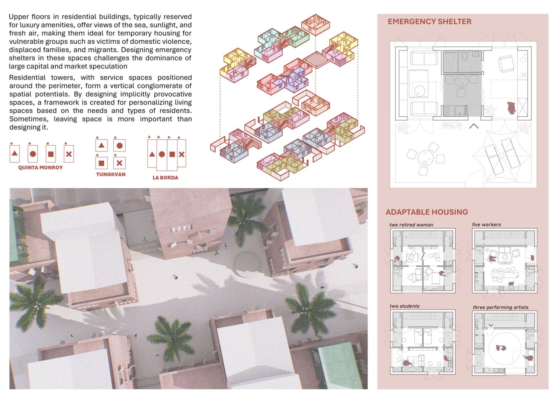 Turistifikacija i manjak gradivog prostora globalni su problemi, izrazito prisutni u Splitu. Stanovništvo se seli prema periferiji, a živi individualizirano, raspršeno i neodrživo. Postojeći stambeni fond krut je i neprilagodljiv. Stanovanje je komodificirano i lišeno svih vrijednosti, posebno onih (re)produktivnih. Priuštivo stanovanje ne postoji, a postojeći modeli namijenjeni su isključivo kreditno sposobnima. Gdje bi trebali živjeti najranjiviji? Može li stanovanje ponovno postati inkluzivno i kontekstualno? Što je s gustoćom i samodostatnošću? Ovaj projekt nudi odgovor – otporan i gust suburbani arhipelag.