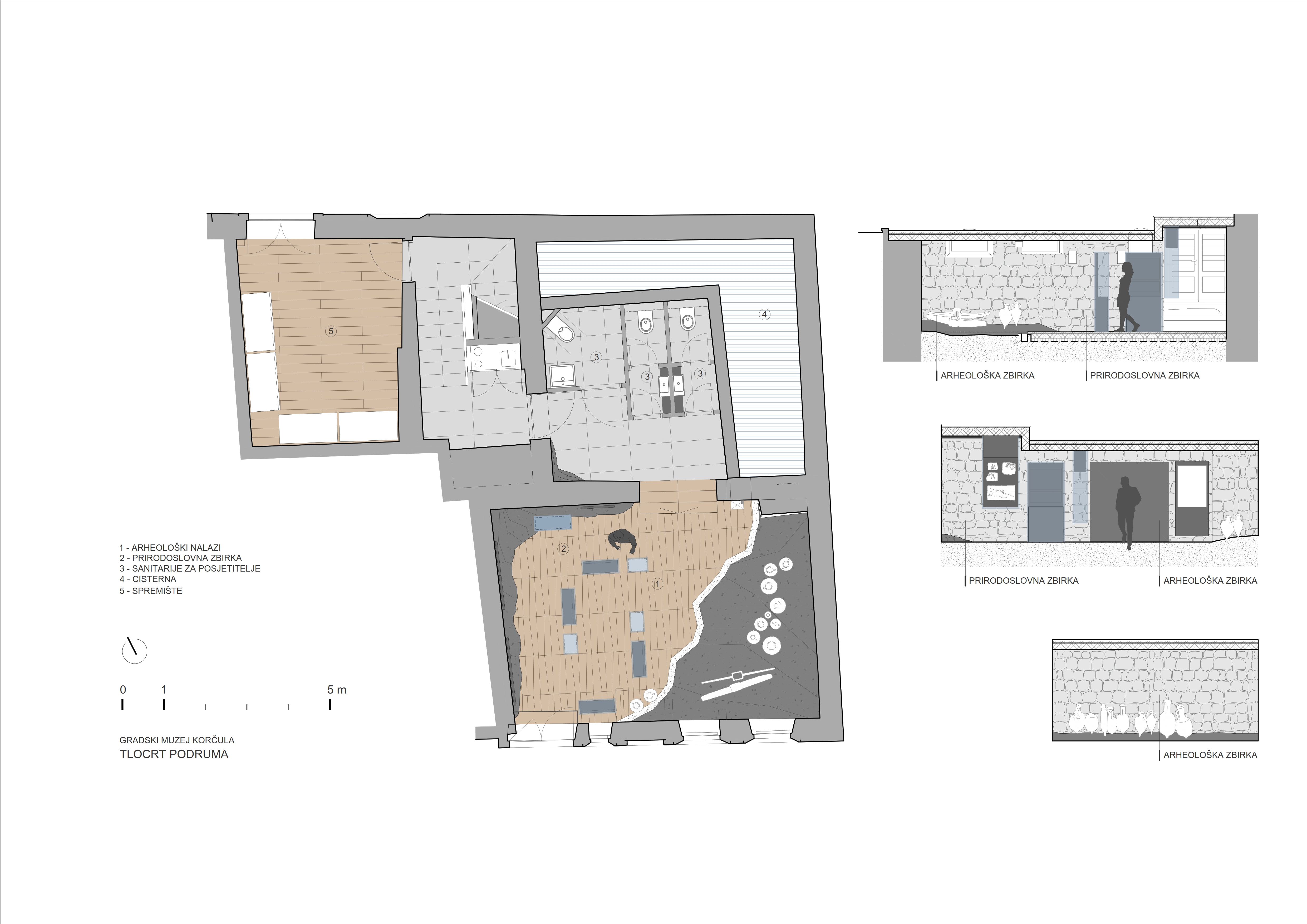 U podrumu je soba posvećena arheologiji s prirodnom stijenom na podu koja je pružila odličnu scenu za izlaganje arheoloških nalaza iz morskih dubina poput amfora. Vitrine su stajaći i viseći stakleni kubusi koji pričaju priču o nastanku i životu otoka pradoba i antike.