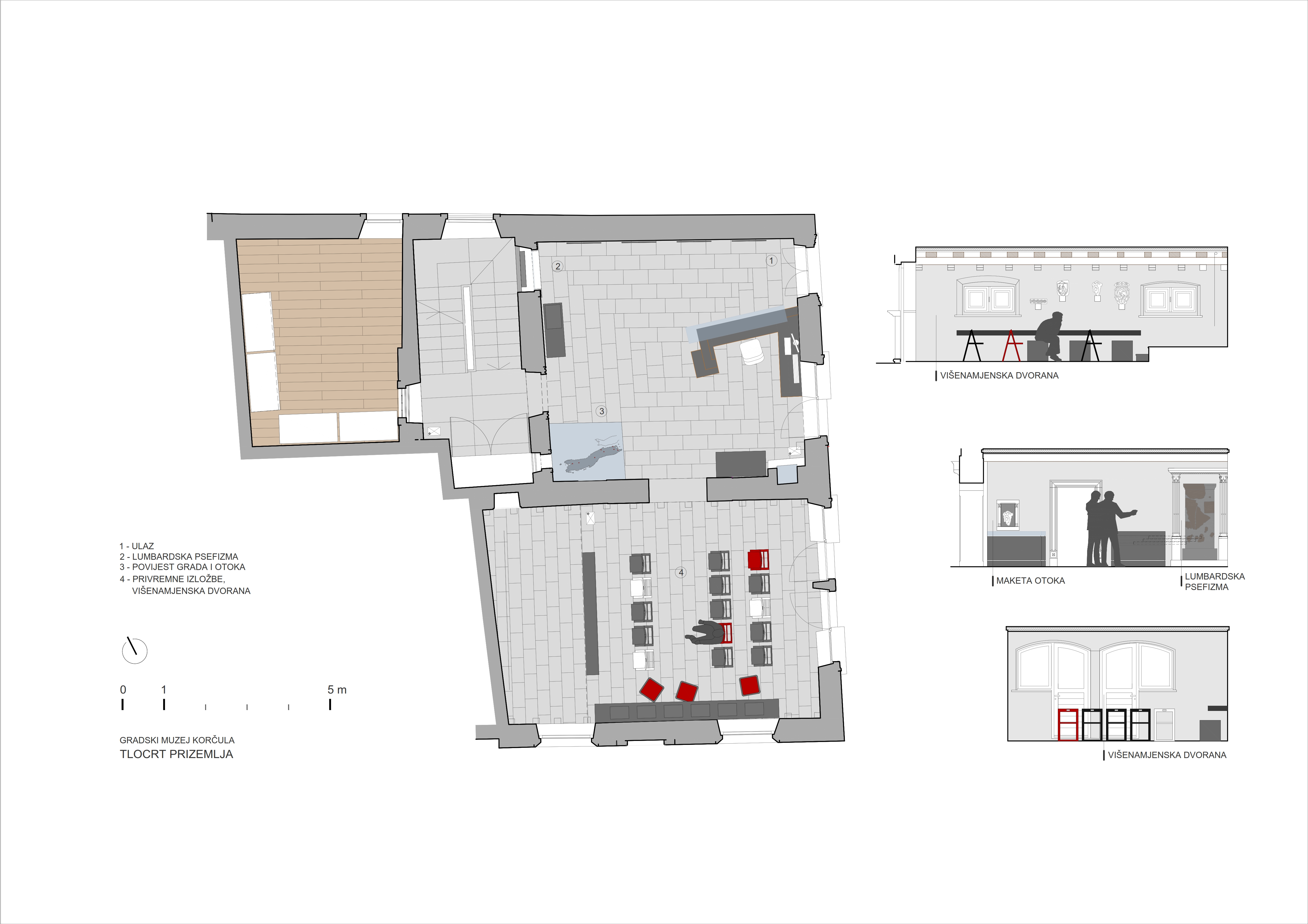 Jednostavni sivi panoi i kubusi postamenata olakšani staklenim plohama i vitrinama stvaraju moderan i nenapadan prostor u kojem izlošci dolaze do izražaja. Neutralna siva boja muzejske opreme na drvenom parketu suvremenog geometrijskog uzorka daju dojam topline.