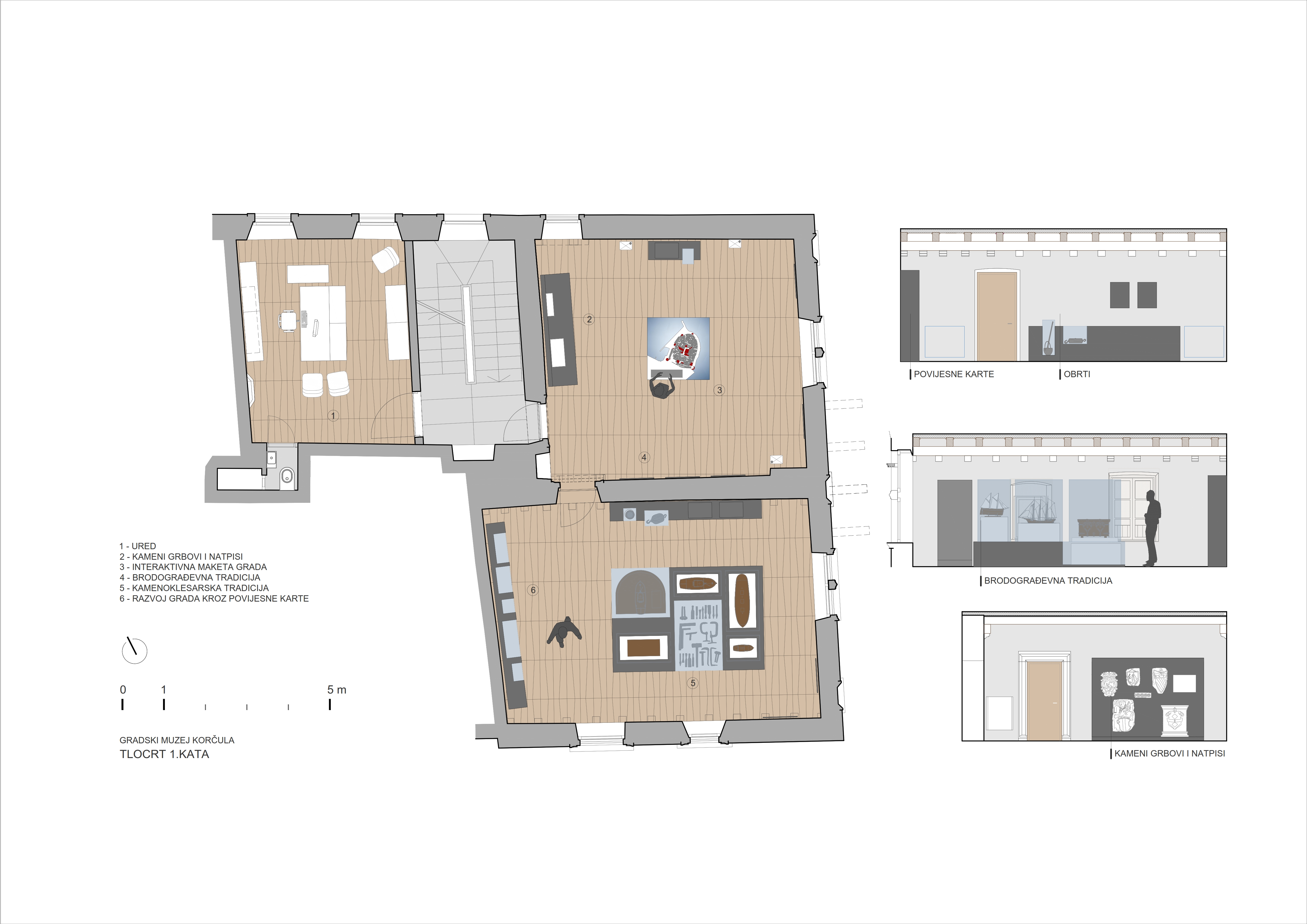 Tema prvog kata je razdoblje najvećeg procvata Grada, vrijeme Srednjeg vijeka. U centru sobe je interaktivna maketa grada, prezentirani su kameni grbovi, Statut Grada, stare karte i modeli brodova i alat brodogradilišta.