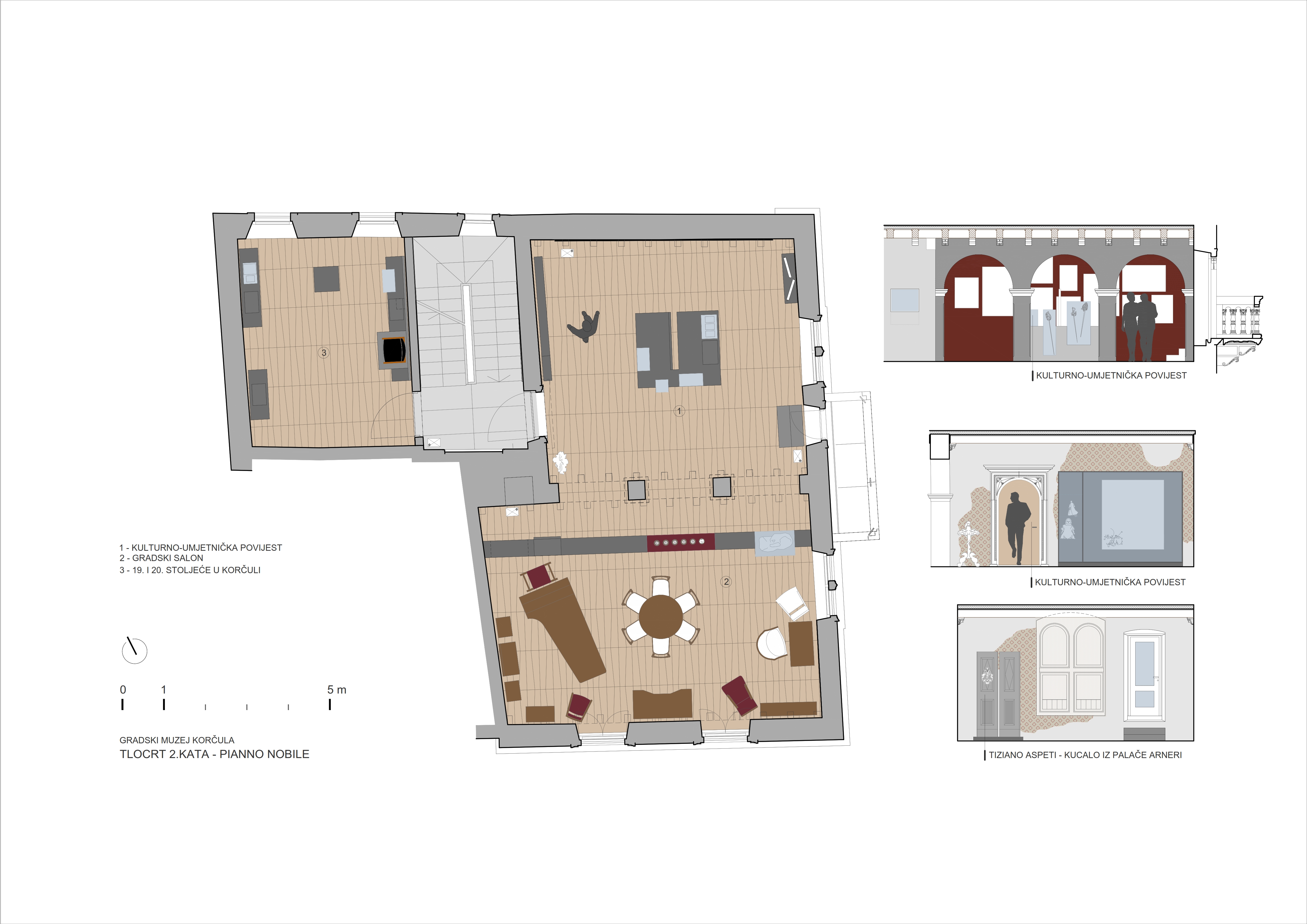 Zadatak projekta unutrašnjeg uređenja i muzejskog postava je bio zahtjevan zbog vrijednosti palače, te kontinuiteta gradnji i nadogradnji unutar nje, što je rezultiralo postavom unutar kojeg se usporedno prezentiraju vrijedni predmeti - izlošci kao i detalji same palače.