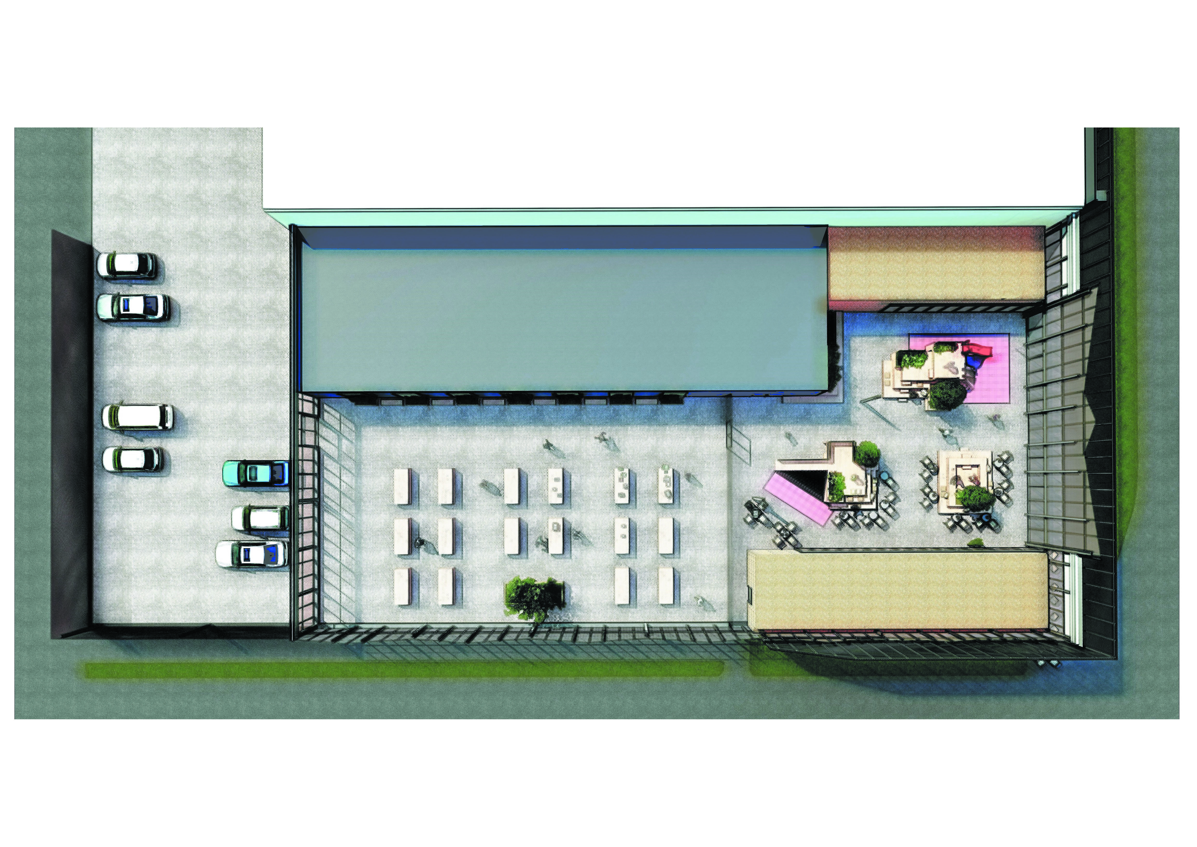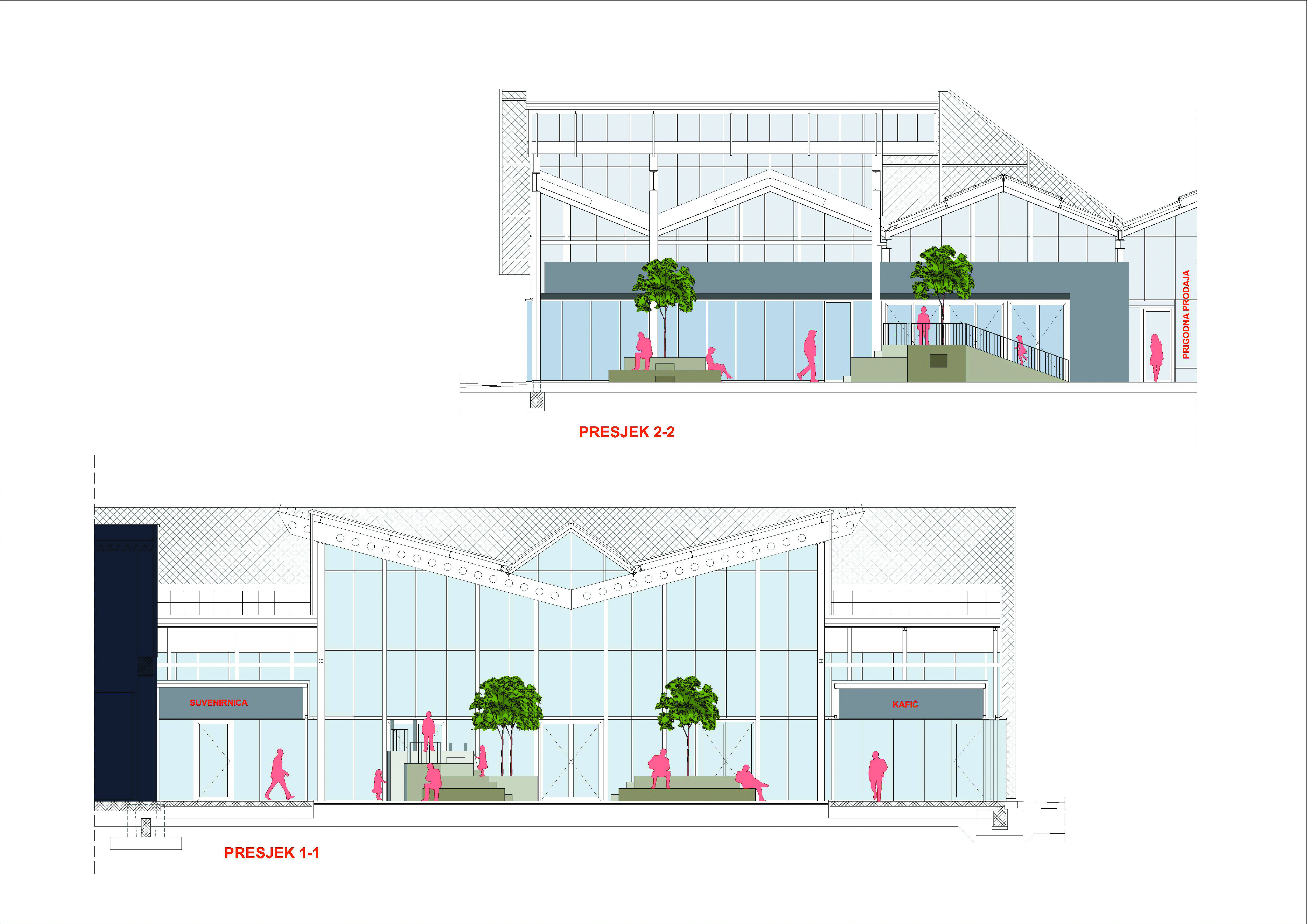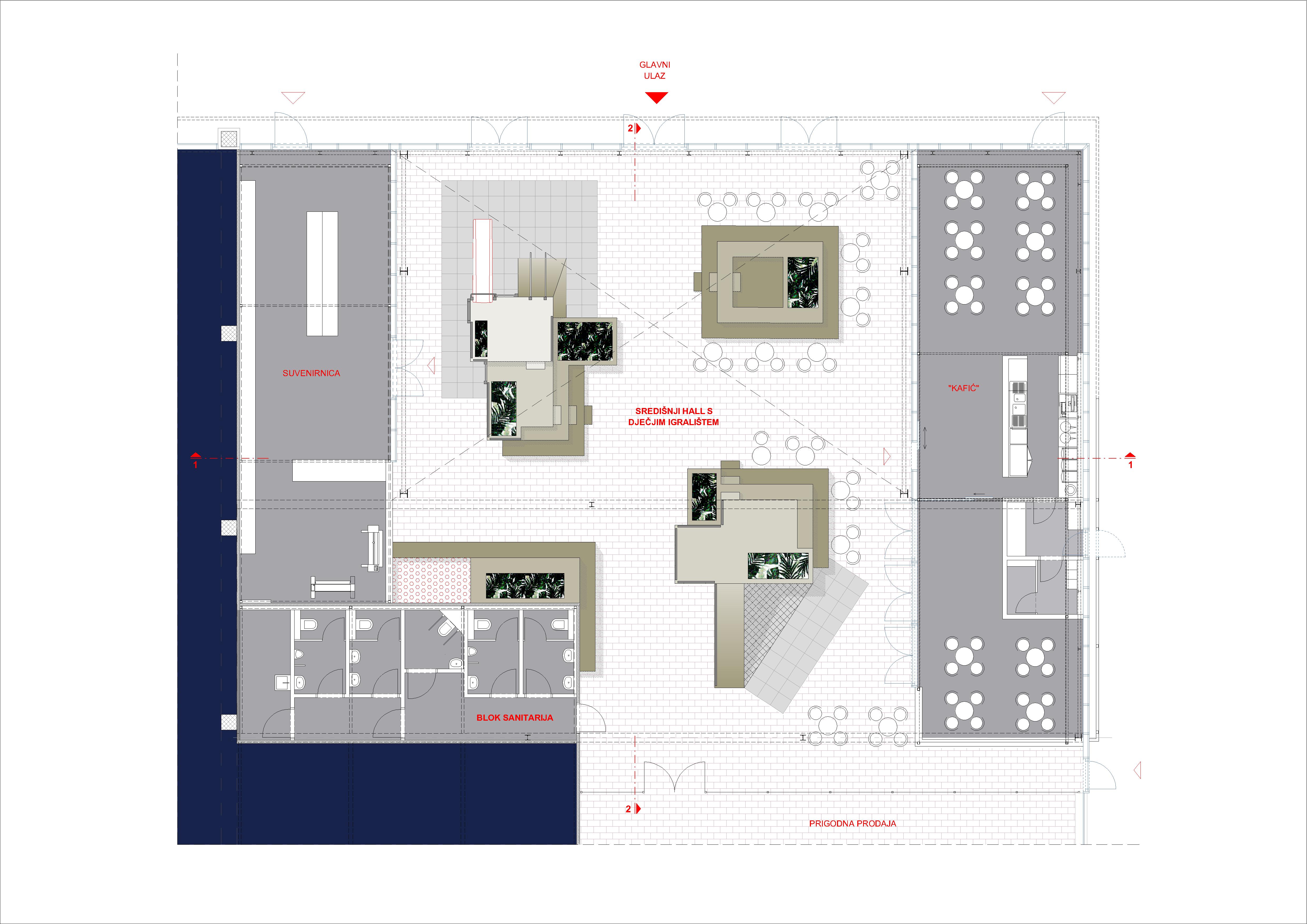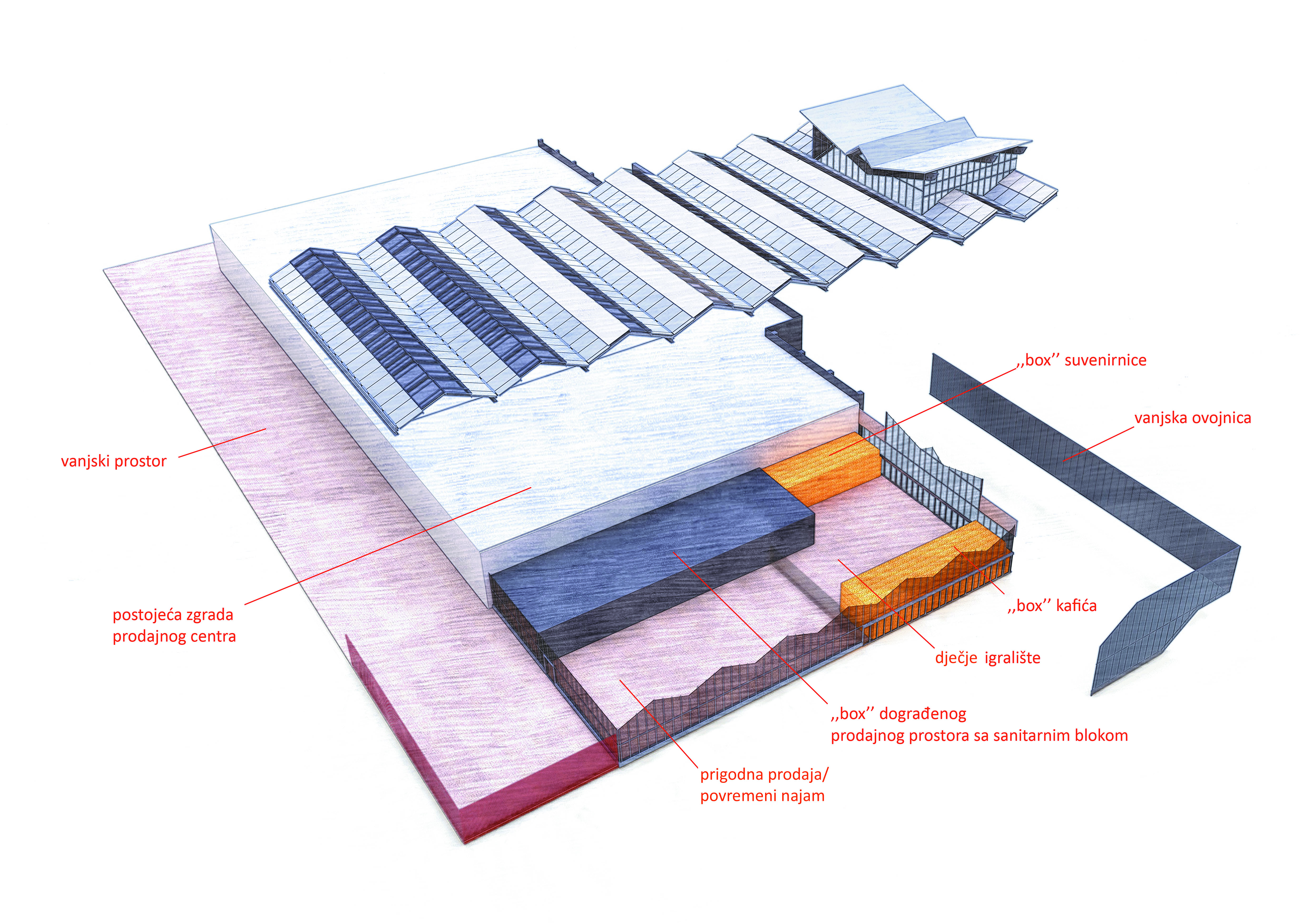 U postojeći volumen su implementirani 'boxovi' unutar kojih su ostvareni mikroklimatski uvjeti za tražene sadržaje – kafić, suvenirnicu i trgovinu odjećom. Prostor između 'boxova' organiziran je u dvije zone. Prednji dio, veće visine osmišljen je kao zajednički ulazni prostor, terasa kafića i dječje igralište koje je investitor namjeravao izvesti na parceli. Oblikovan je multifunkcionalnim elementima – drvenim platformama, koje istovremeno preuzimaju funkciju namještaja u službi kafića, posuda za bilje te dječjih igrala. Za preostali prostor između 'boxova', koji se nastavlja na ulazni dio, nije unaprijed definirana namjena. Predloženo je korištenje u svrhu povremenog najma, prigodne prodaje i sl., s idejom da će veličina i atraktivnost prostora privući nove korisnike i sadržaje u budućnosti.