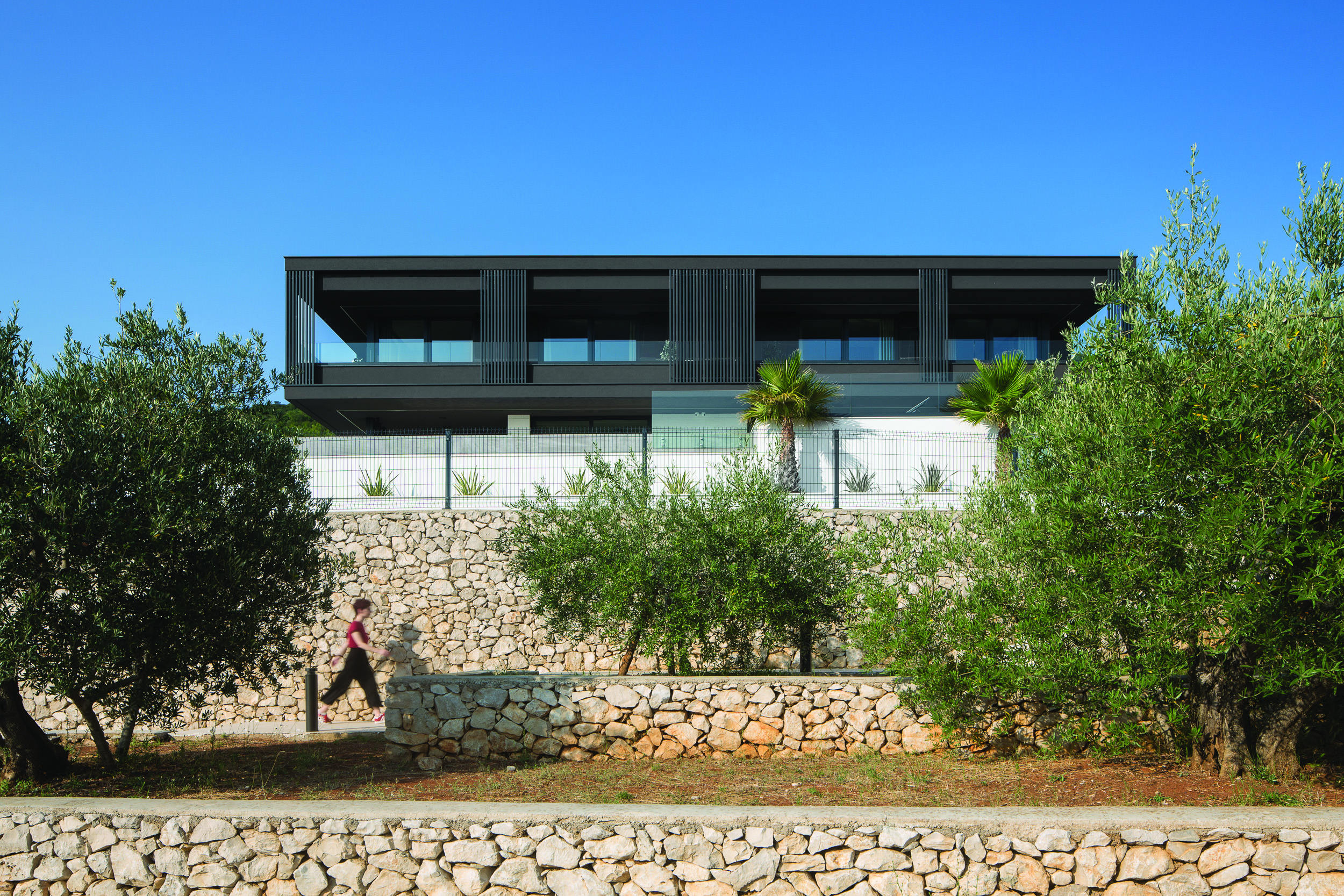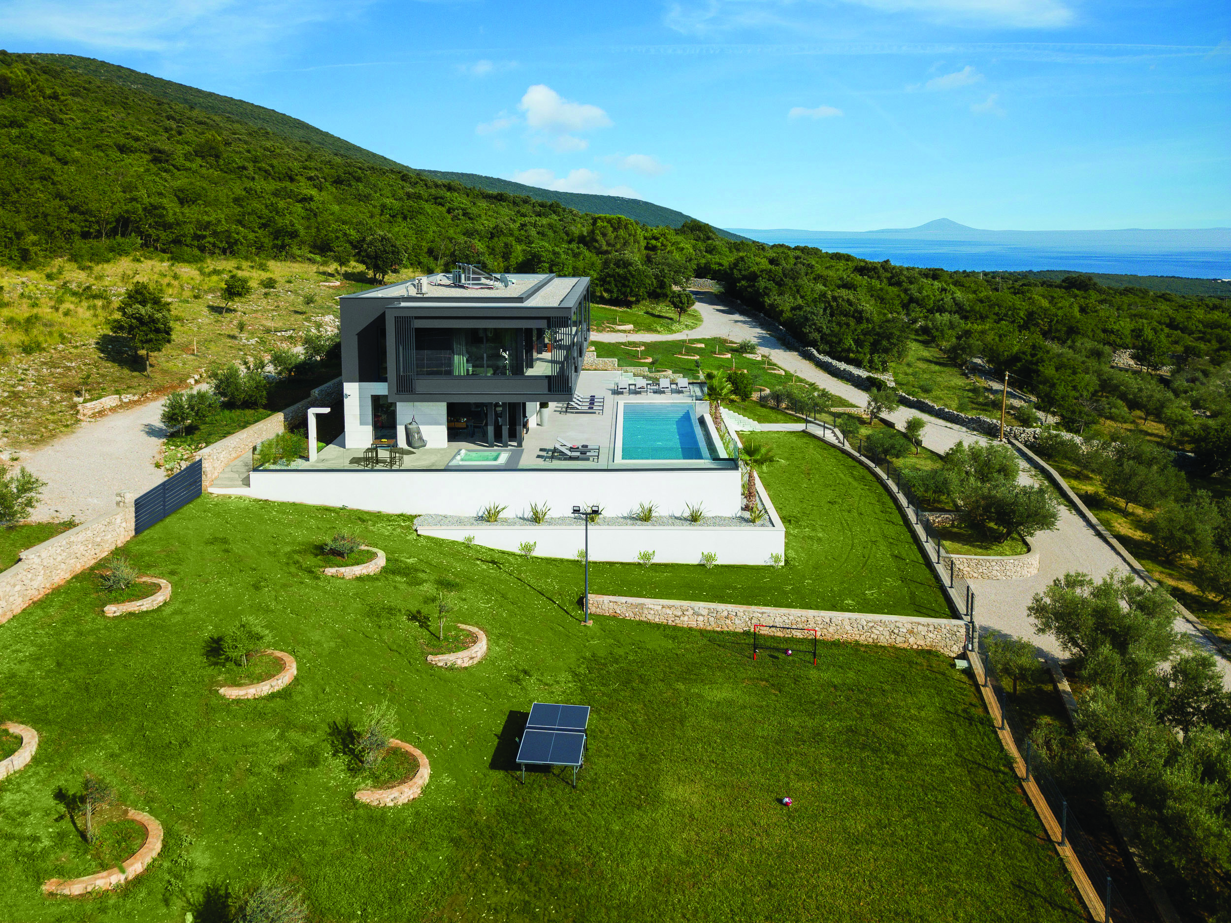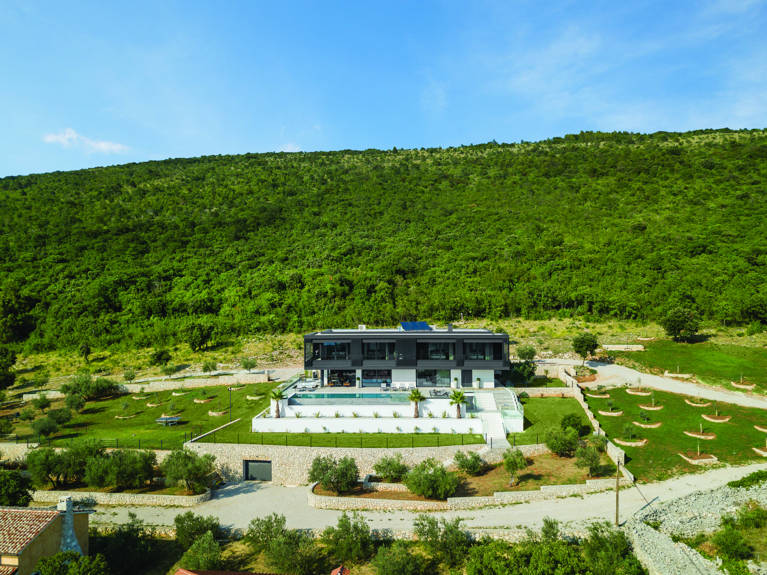 Unutrašnji je prostor organiziran u planski odvojenim zonama dnevnog boravka, odmora, te zabave i opuštanja, koje se isprepliću na vanjskom dijelu, oko bazena kao središnjeg elementa opreme eksterijera. Uz masline, terasasto oblikovani vrtovi zasađeni su ukrasnim i aromatičnim biljem, koje će s vremenom krajobrazno nadopuniti sklad arhitekture i prostora.