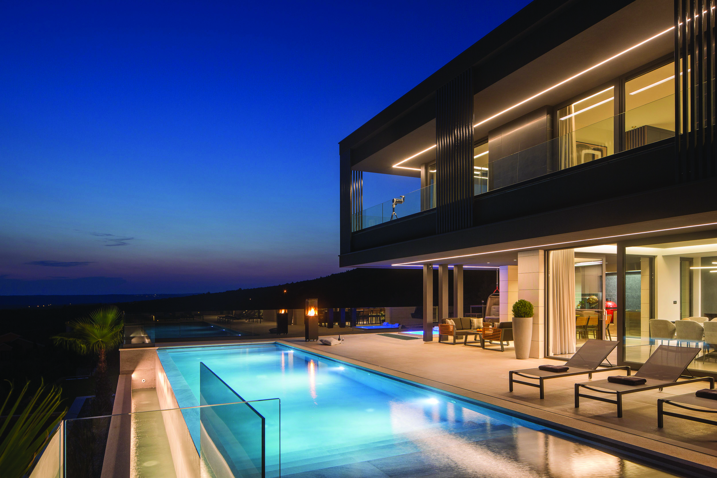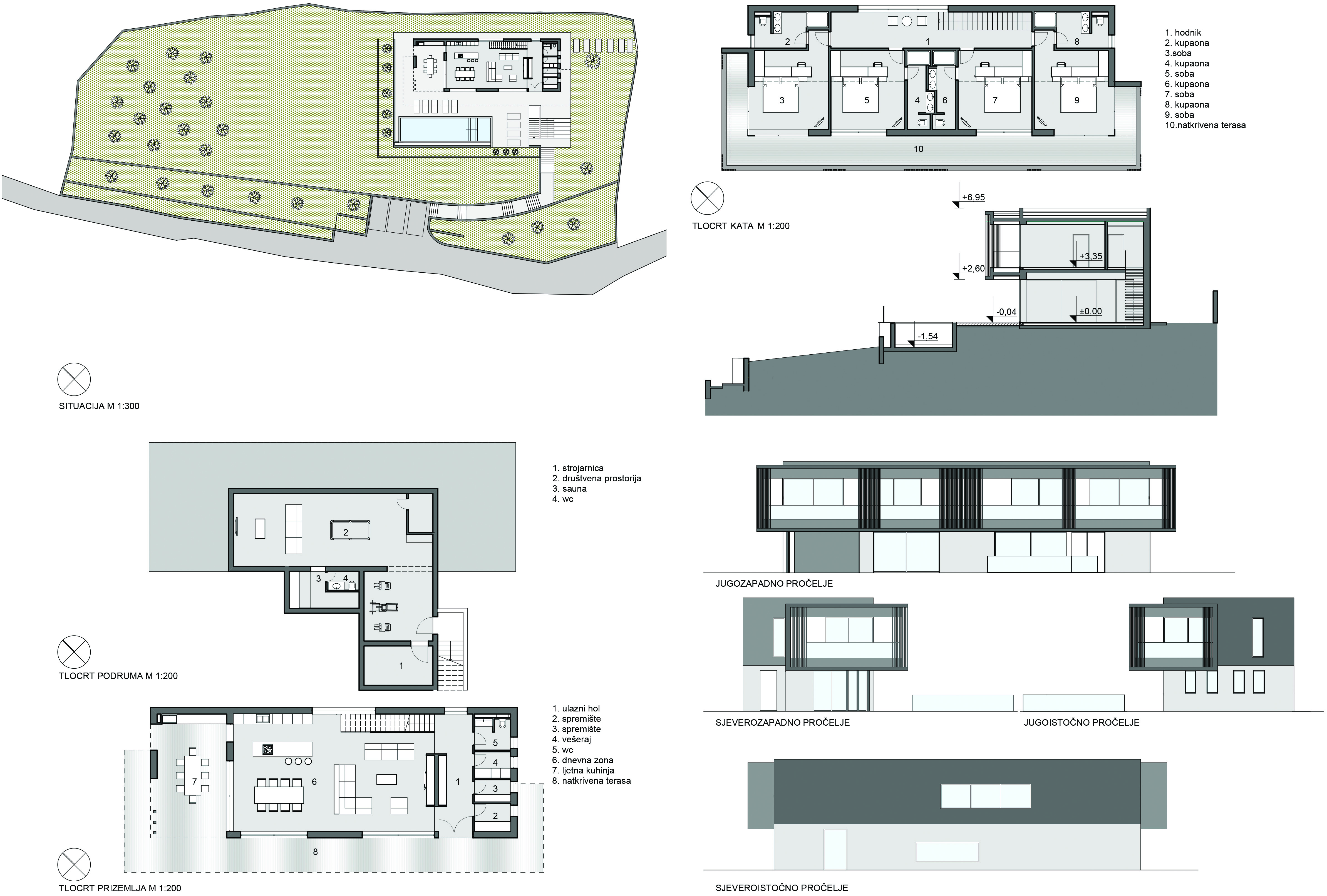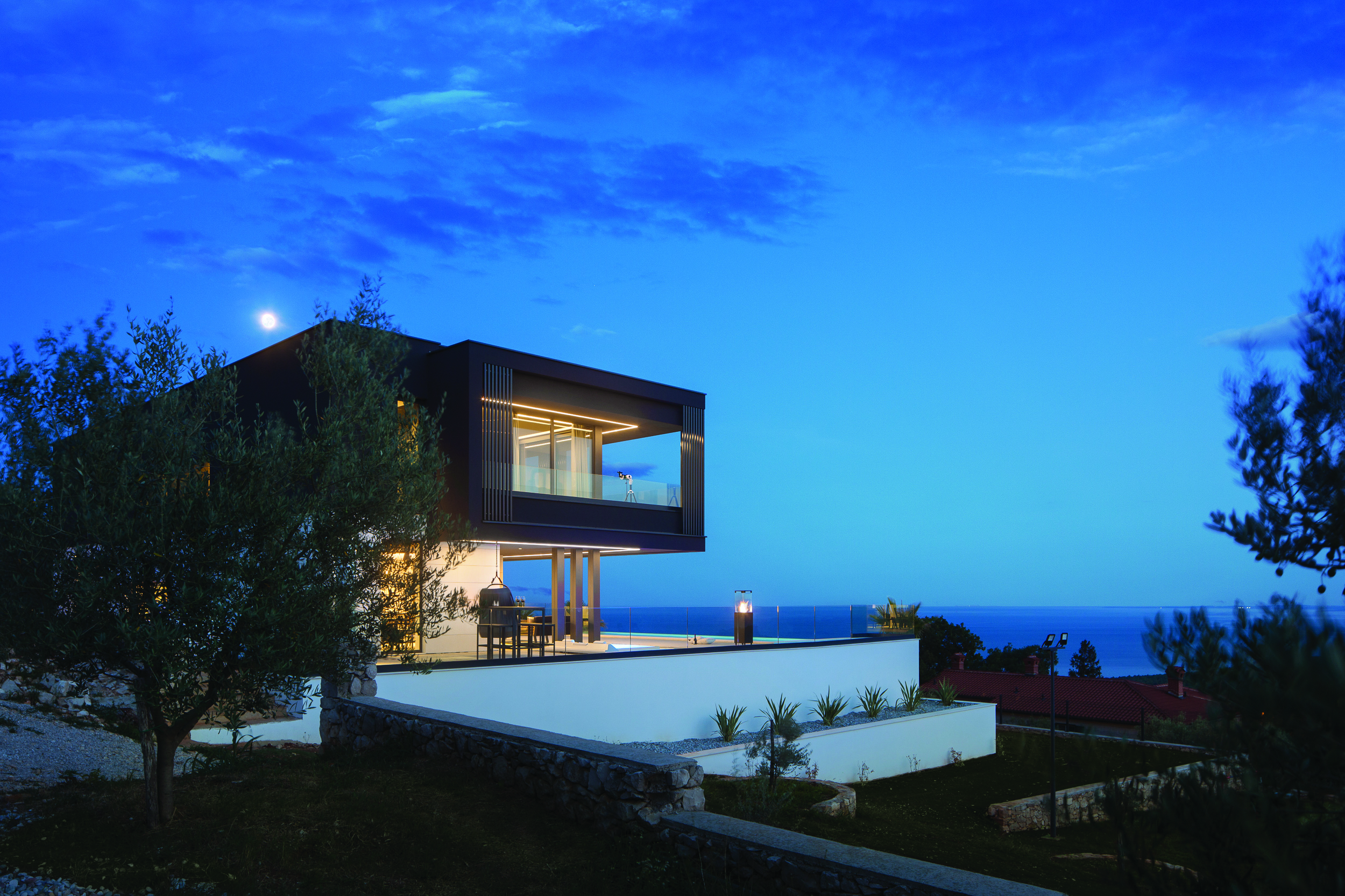 Unutrašnji je prostor organiziran u planski odvojenim zonama dnevnog boravka, odmora, te zabave i opuštanja, koje se isprepliću na vanjskom dijelu, oko bazena kao središnjeg elementa opreme eksterijera. Uz masline, terasasto oblikovani vrtovi zasađeni su ukrasnim i aromatičnim biljem, koje će s vremenom krajobrazno nadopuniti sklad arhitekture i prostora.