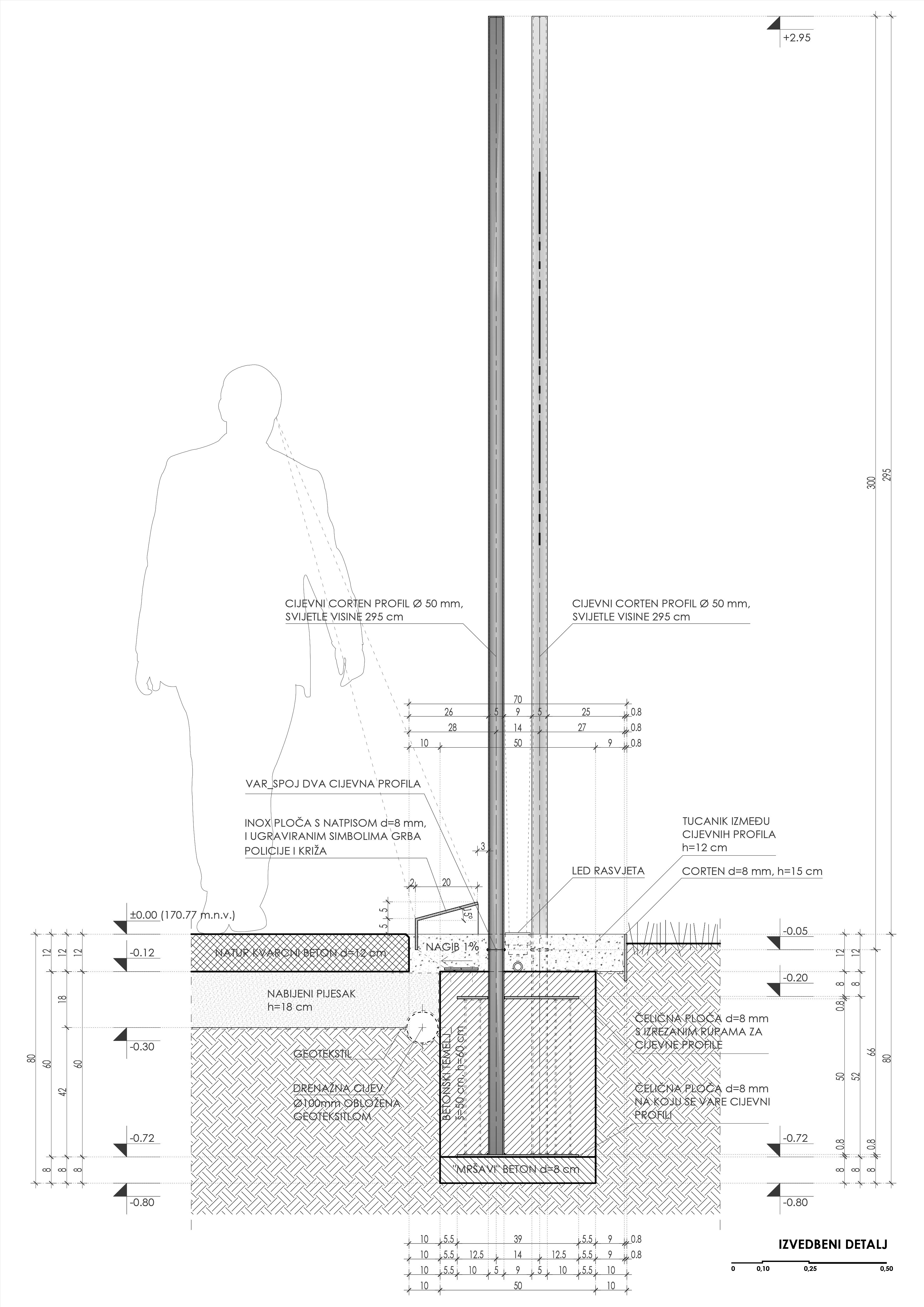 Uz javnu os kretanja Milčetićevom ulicom uvodi se memorijalna os kretanja po rubu novoplanirane ograde. Ograda prerasta u spomen poginulim i nestalim policajcima, a razdvajanjem na dva reda štapnih elemenata zadovoljava zadane kriterije providnosti. U prvom redu štapnih elemenata postavlja se 37 materijalom istaknutih elementa na kojima su u visini očišta urezana imena poginulih i nestalih policajaca, dok drugi red štapnih elemenata nosi simbol šahovnice. Dvije osi kretanja odvojene su površinom na kojoj je zasađeno pet stabala crvenolisnog javora. Imena 37 poginulih i nestalih policajaca urezana su na 37 štapnih elementa od poliranog nehrđajućeg čelika, a ostatak štapnih elemenata je izveden od cortena, koji će starenjem naglasiti kontrast materijala. Kod strujanja vjetra 280 štapnih elemenata titraju zbog svoje vitkosti, te s uvijek promjenjivim sjenama na hodnoj plohi stvaraju mističan memorijalni prostor „gradske sobe“. Spomenik na razmeđi arhitekture i skulpture temeljen na ogradi kao elementu razdvajanja, postaje element spajanja.