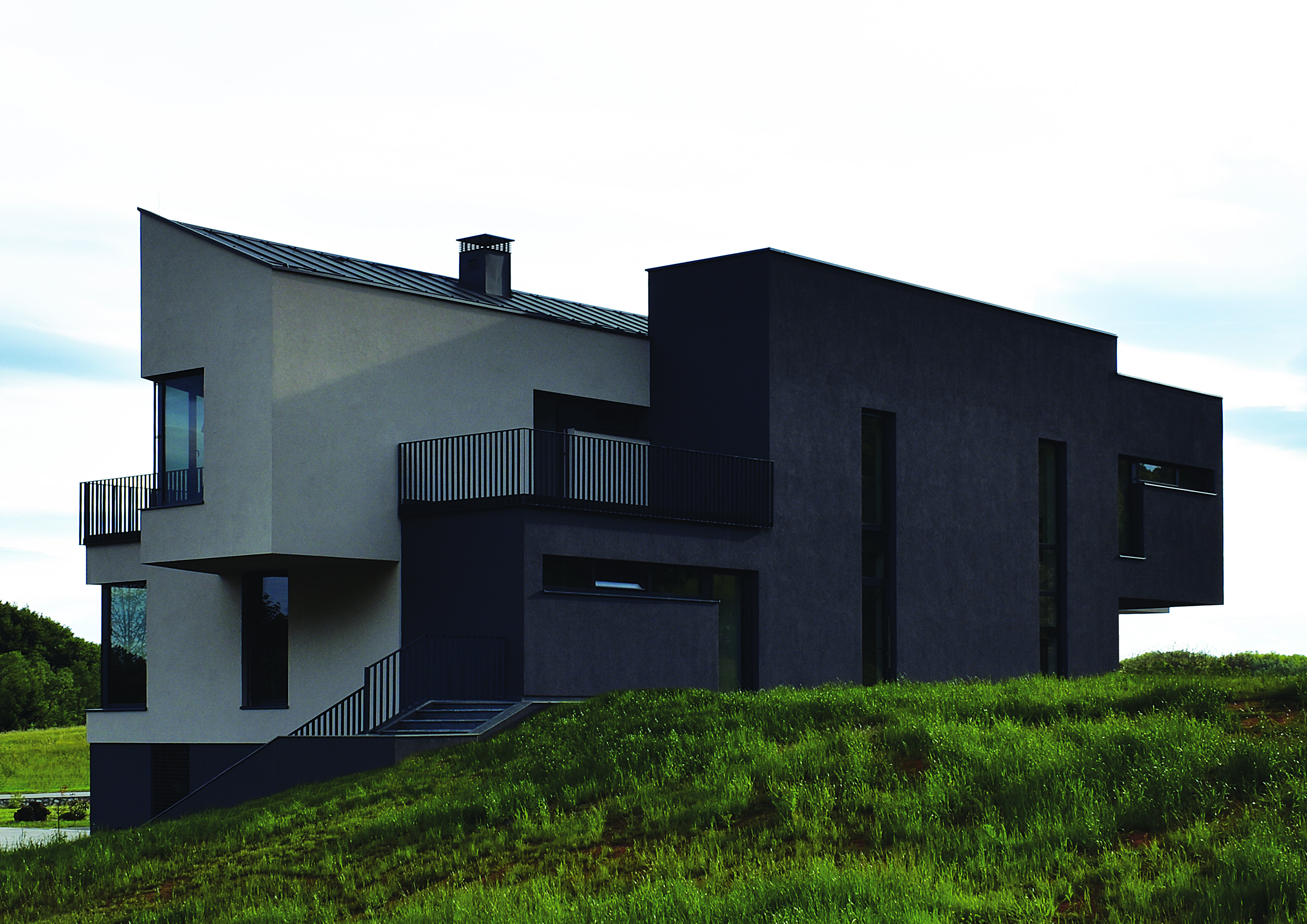 Kuću funkcionalno i oblikovno čine tri segmenta. Prvi je masivna baza, postament koji definira odnos prema terenu - poluukopana etaža u kojoj su smješteni garaža, vinski podrum i stan za najstariju generaciju obitelji. Drugi je sjeverni volumen maksimalno zatvoren prema oštrom sjevernom vjetru i brijegu. U njemu su smješteni sekundarni prostori - stubište i sanitarije. Treći dio kompozicije su primarni stambeni prostori, svijetli volumen okrenut prema suncu, čije gotovo skulptorsko oblikovanje eksterijera proizlazi iz koncepta interijera sa središnjim dvoetažnim galerijskim zajedničkim prostorom i dvama bočnim „krilima“, odnosno dvama zasebnim stanovima kćeri i sina. Skošenja bočnih krila prate putanju sunca od izlaska do zalaska i otvaraju vrijedne vizure i kreiraju specifične trokutaste terase u jugoistočnom i jugozapadnom uglu.