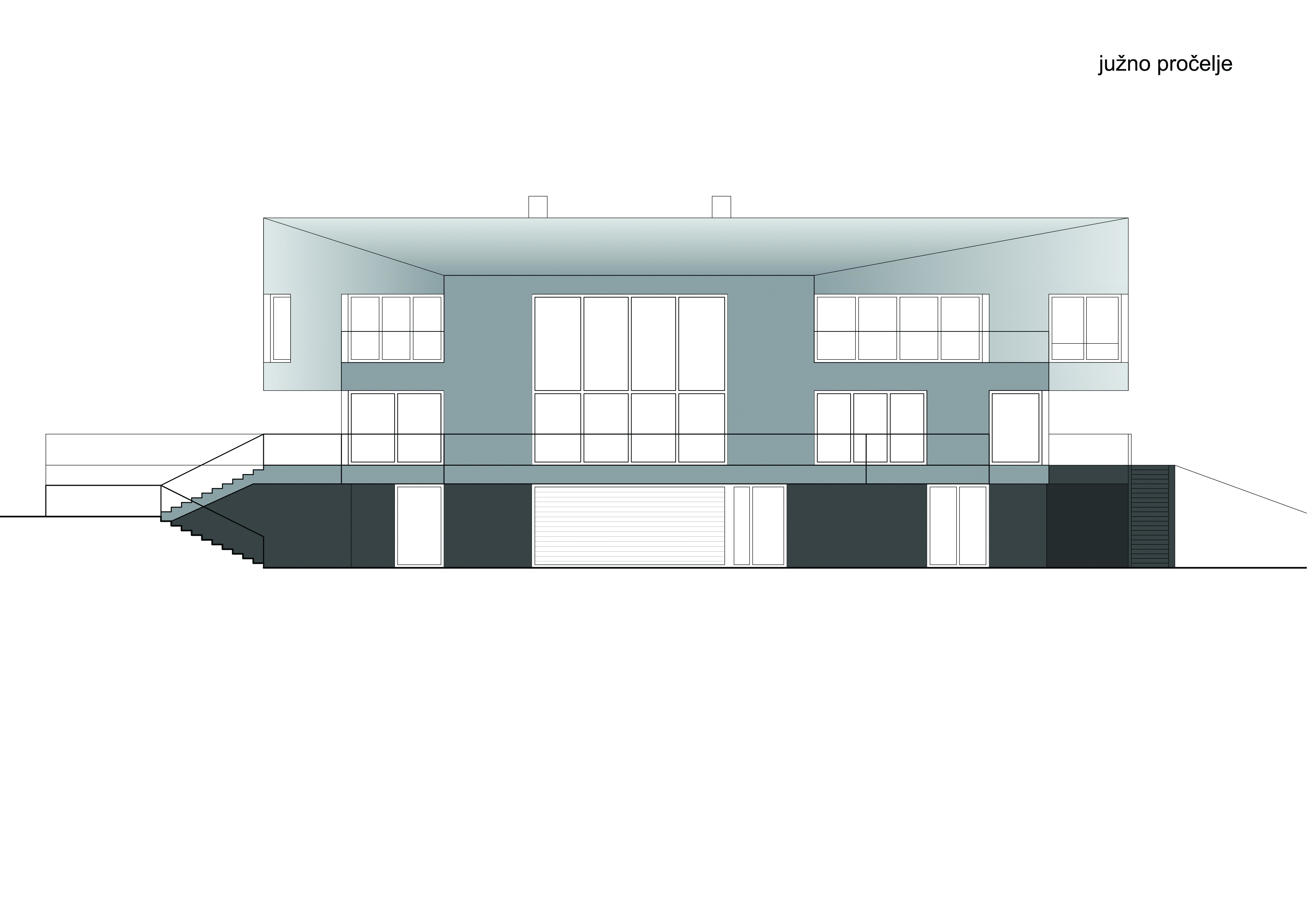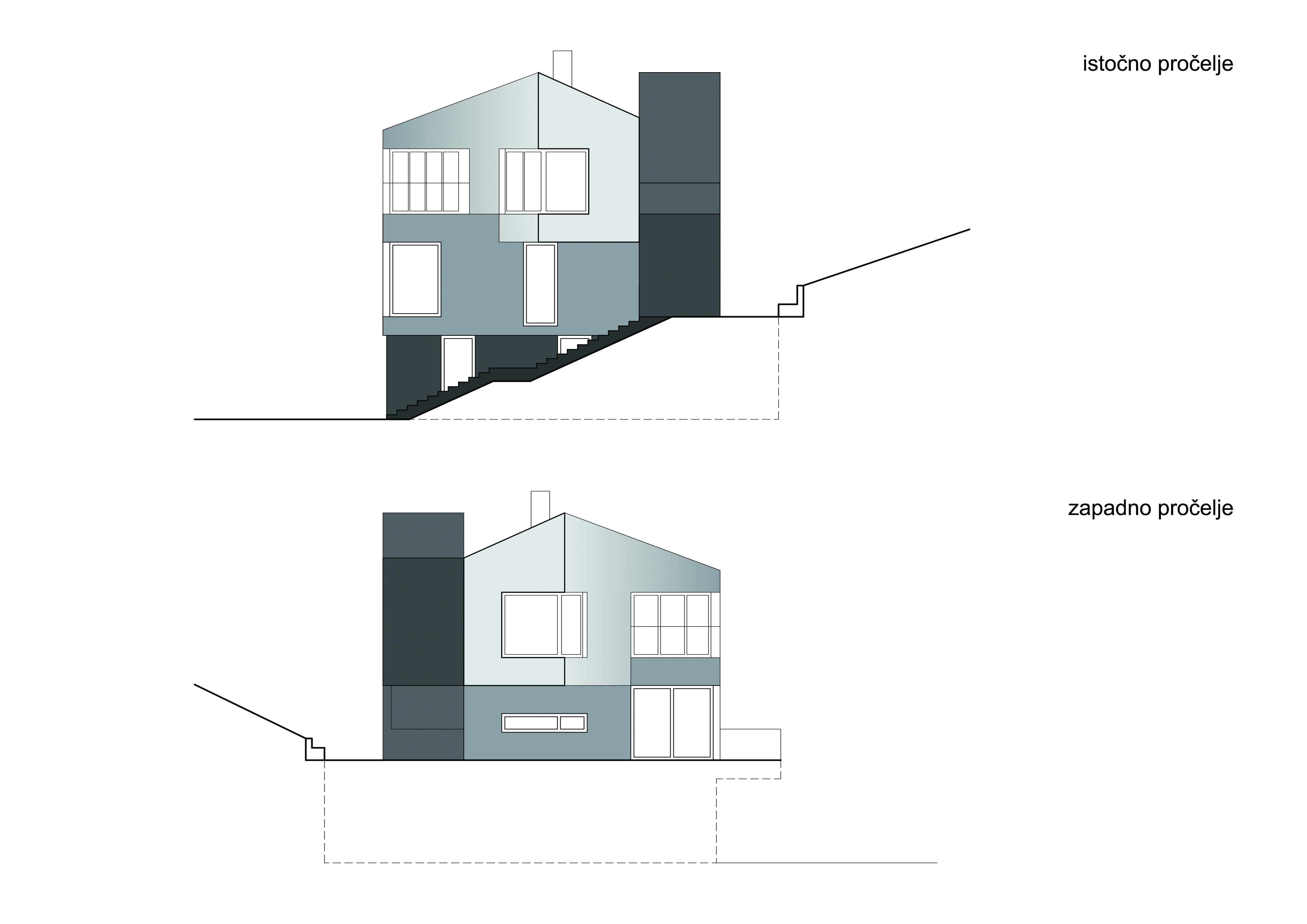 Eklekticističko oblikovanje spaja tradicijske elemente lokacije (podjela na bazu i nadgrađe, kosi krov) i suvremeni izričaj (velike ostakljene površine, ugaoni prozori, konzolna krila). Načelo simetrije, koje proizlazi iz koncepta s dva bočna krila, negira različit odnos pročelja prema terenu. Kuća se prilagođava zatečenoj topografiji, „izrasta iz tla“, iz čega proizlazi različitost i dinamičnost pročelja koja je dodatno naglašena vanjskim stubištima u funkciji povezivanja interijera i eksterijera.