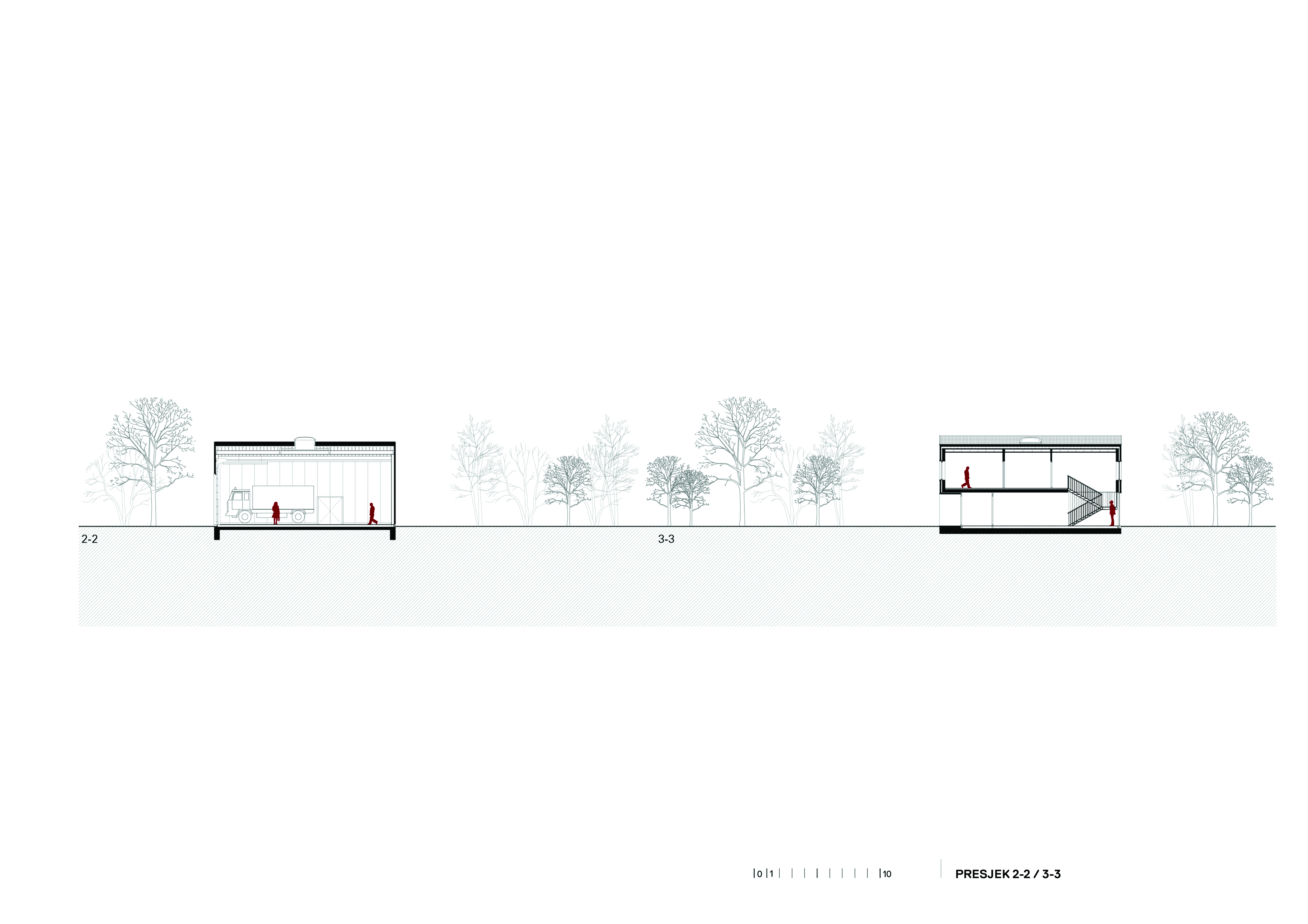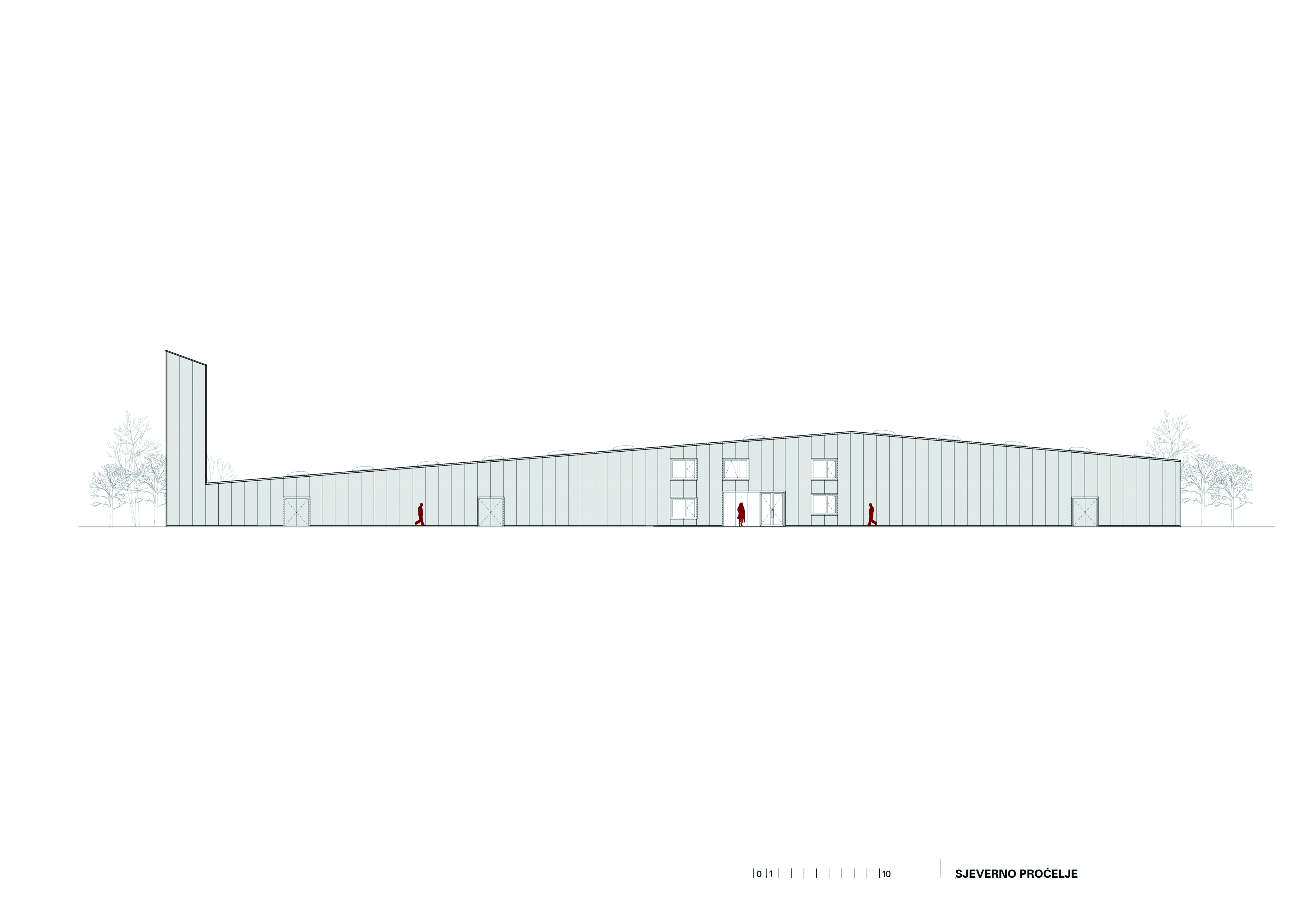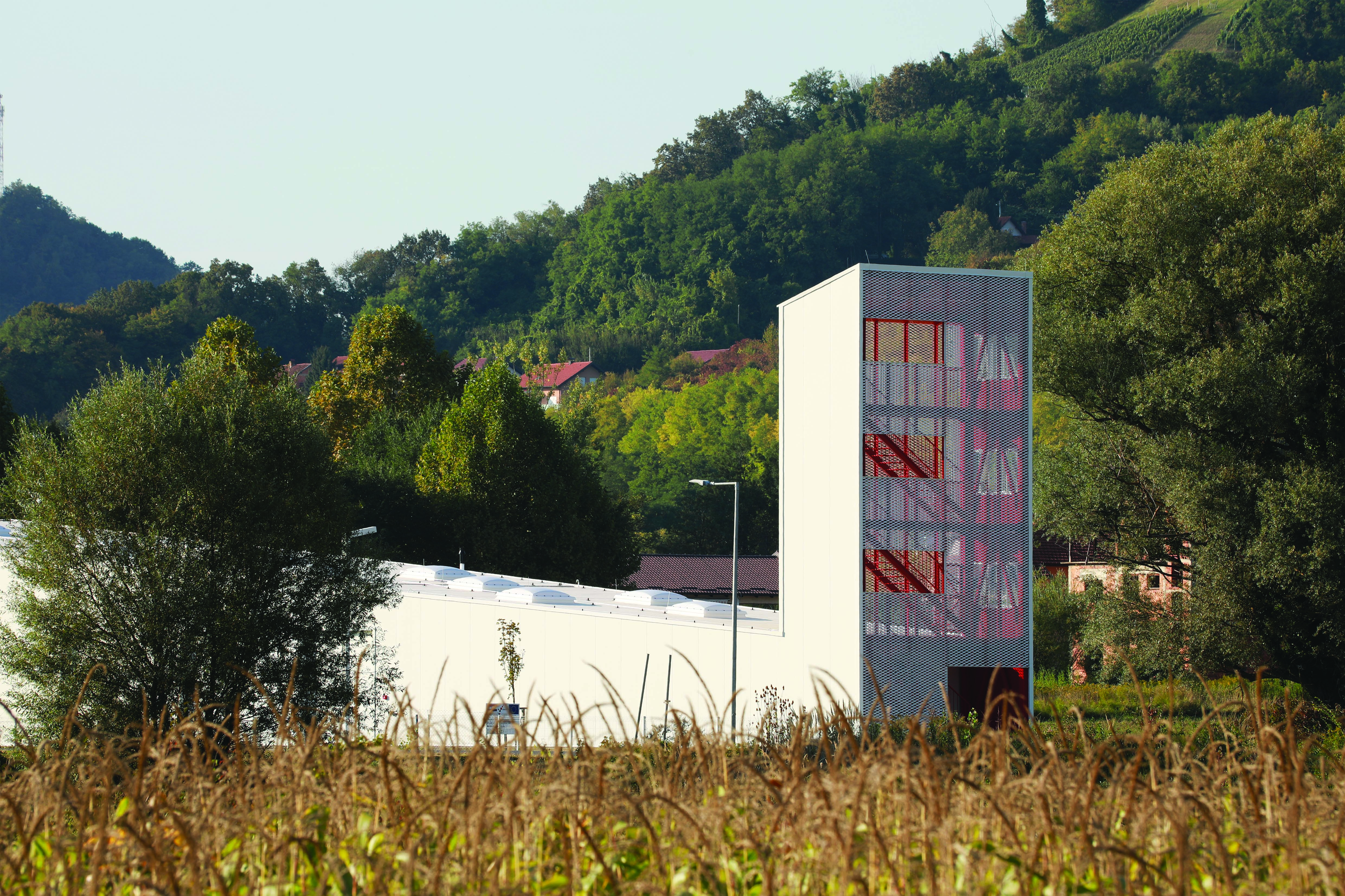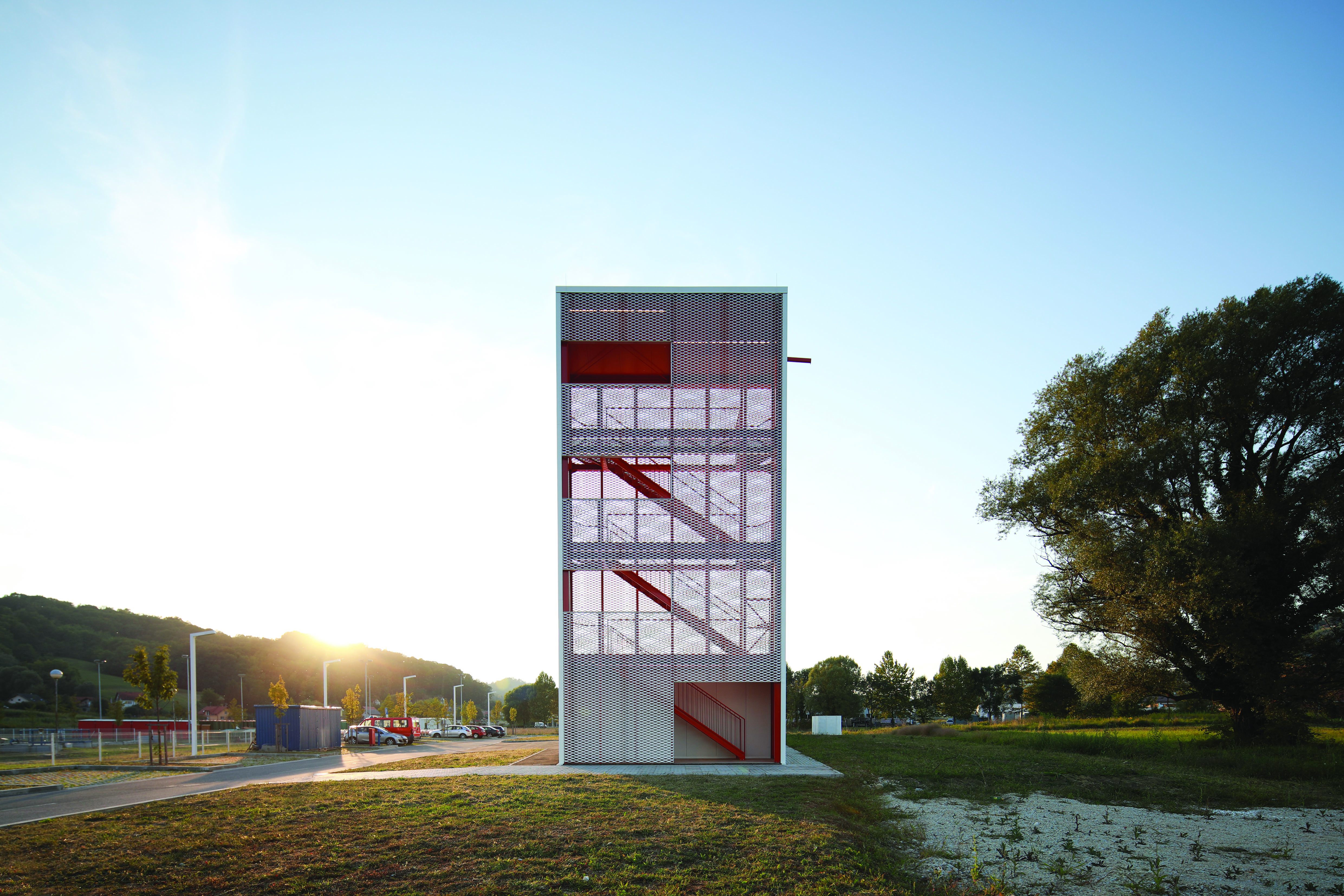 Toranj, čija osnovna namjena su vatrogasne vježbe, postaje prostorni znak, landmark u krajoliku, a svojom vidljivom čeličnom strukturom jasno pokazuje utilitarni karakter ove arhitekture.