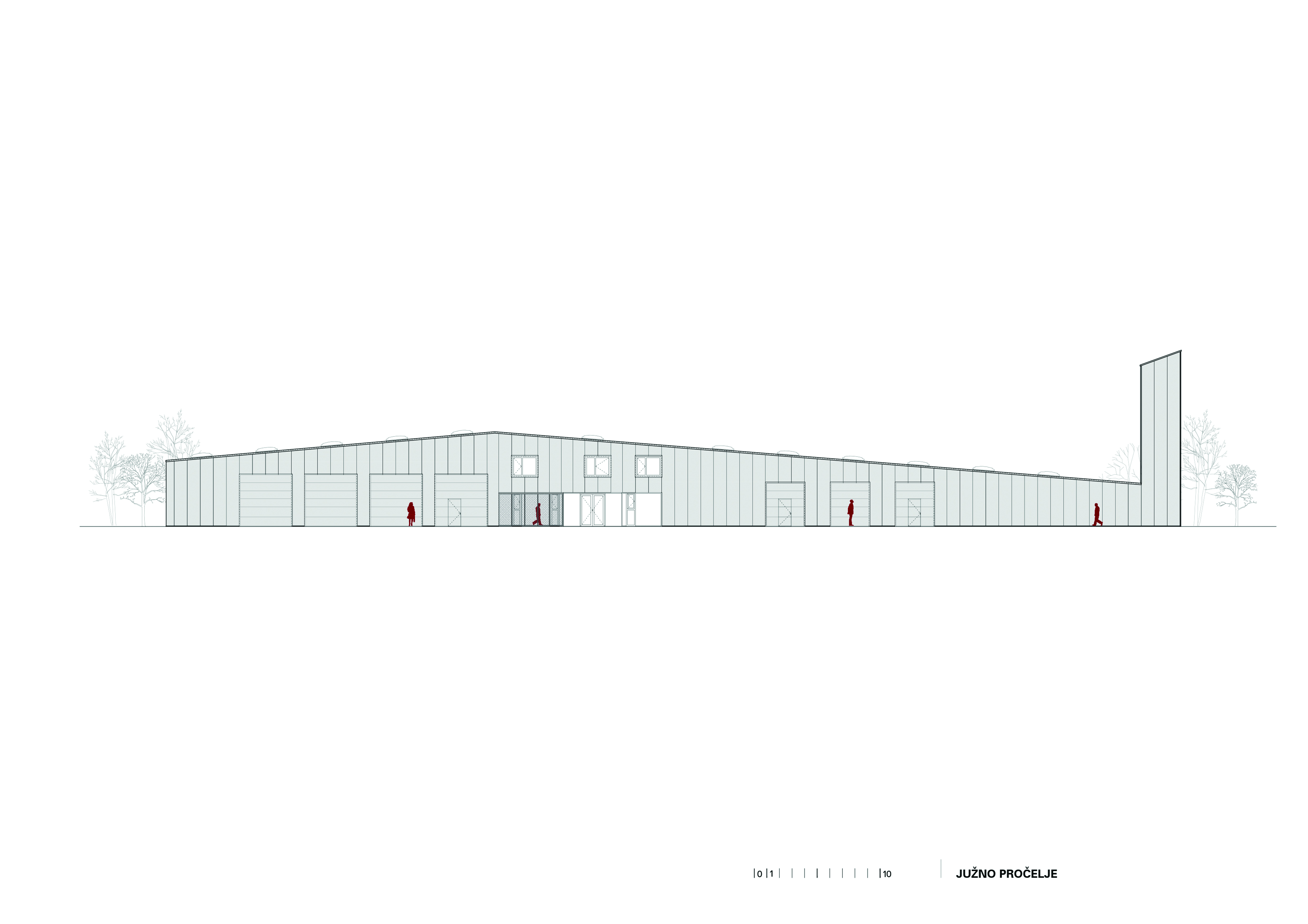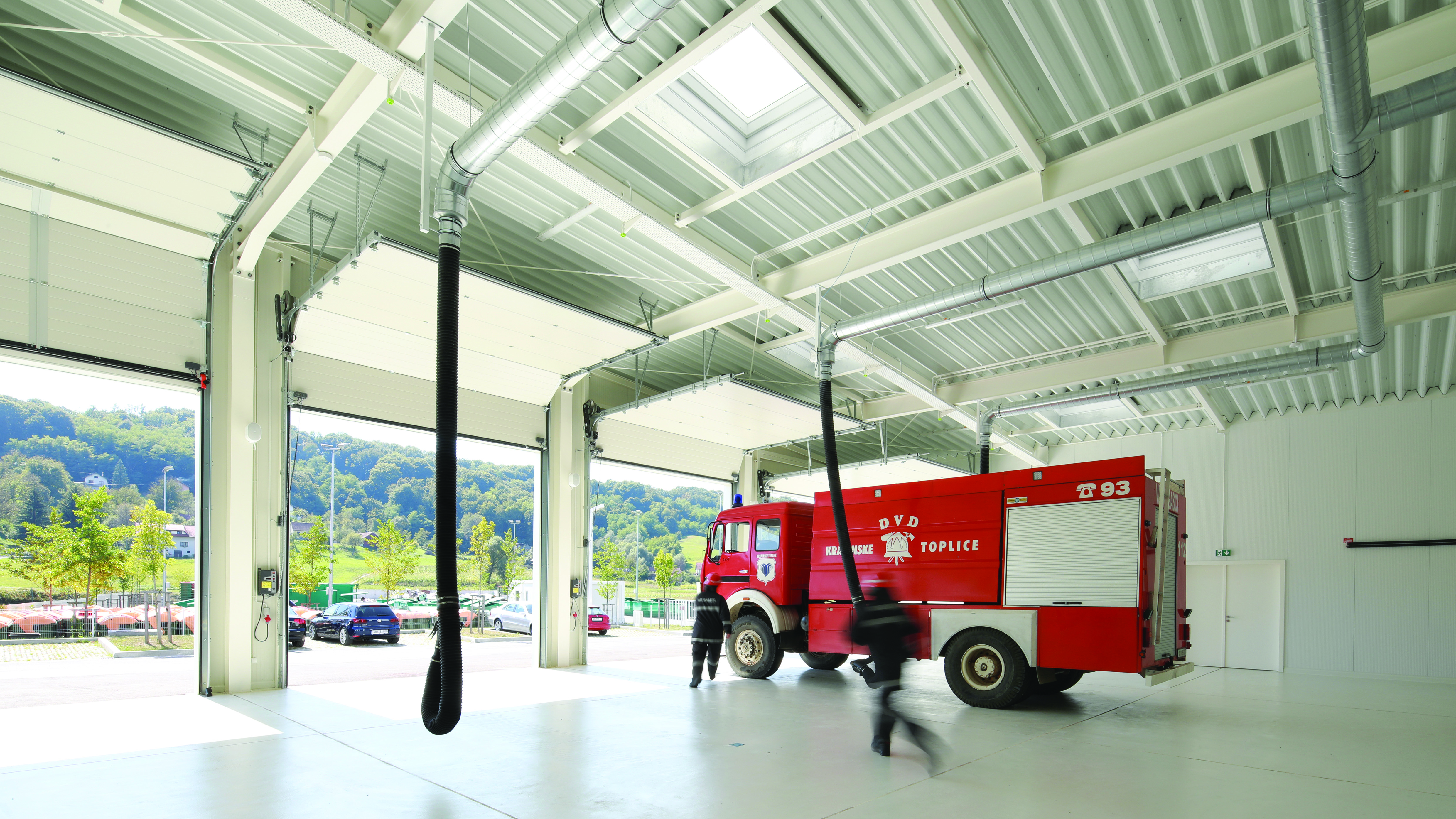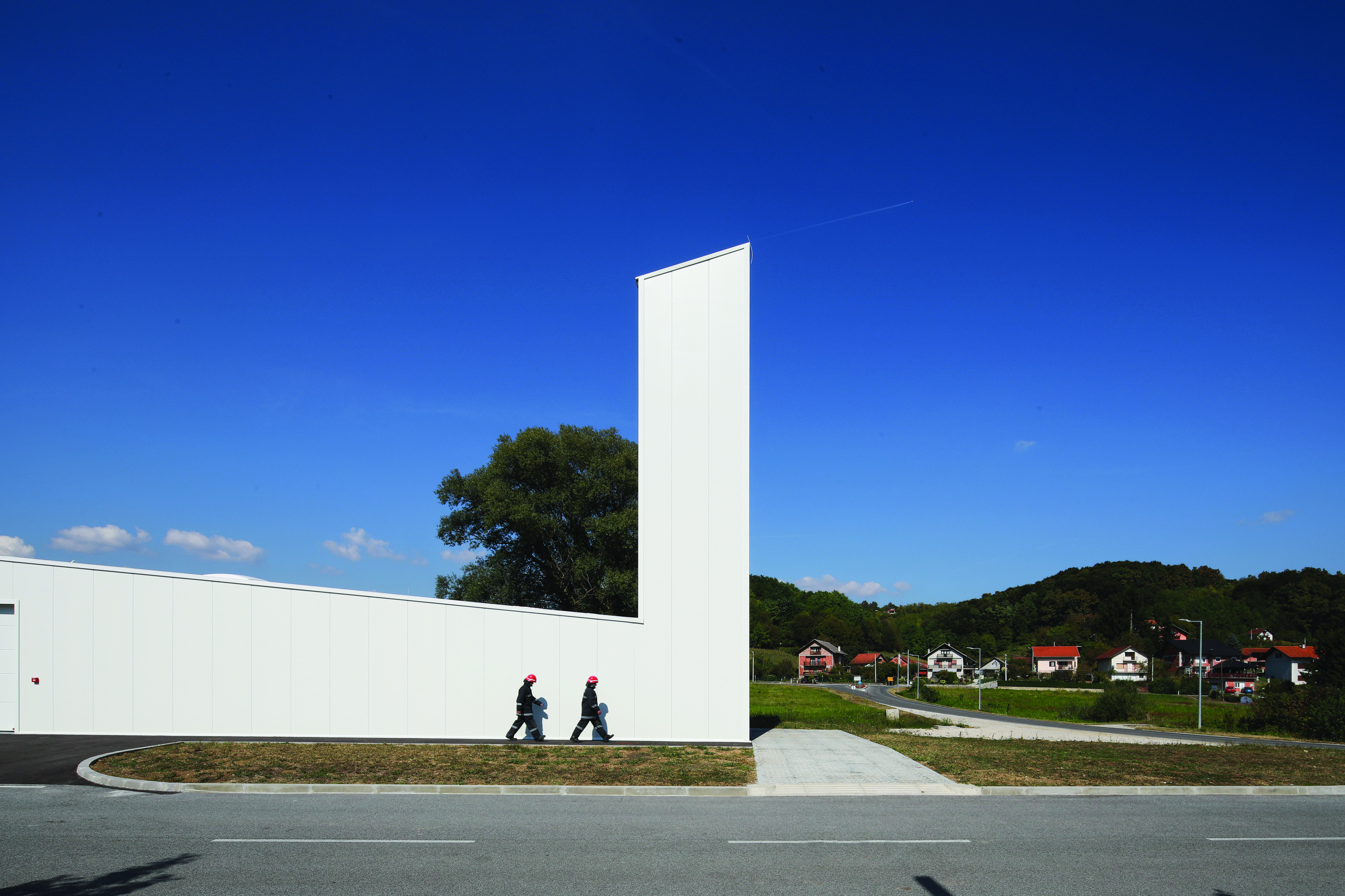 Bijelu limenu ovojnicu nosi kombinacija armirano-betonske jezgre i lagane čelične konstrukcije. Materijali jasno označavaju namjenu pojedinih prostora – bijele metalne ‘sobe’ nastanjuju vozila, prostori u sirovom betonu namijenjeni su za rad i boravak, a intenzivnom crvenom bojom označeni su prostori kretanja vatrogasaca.