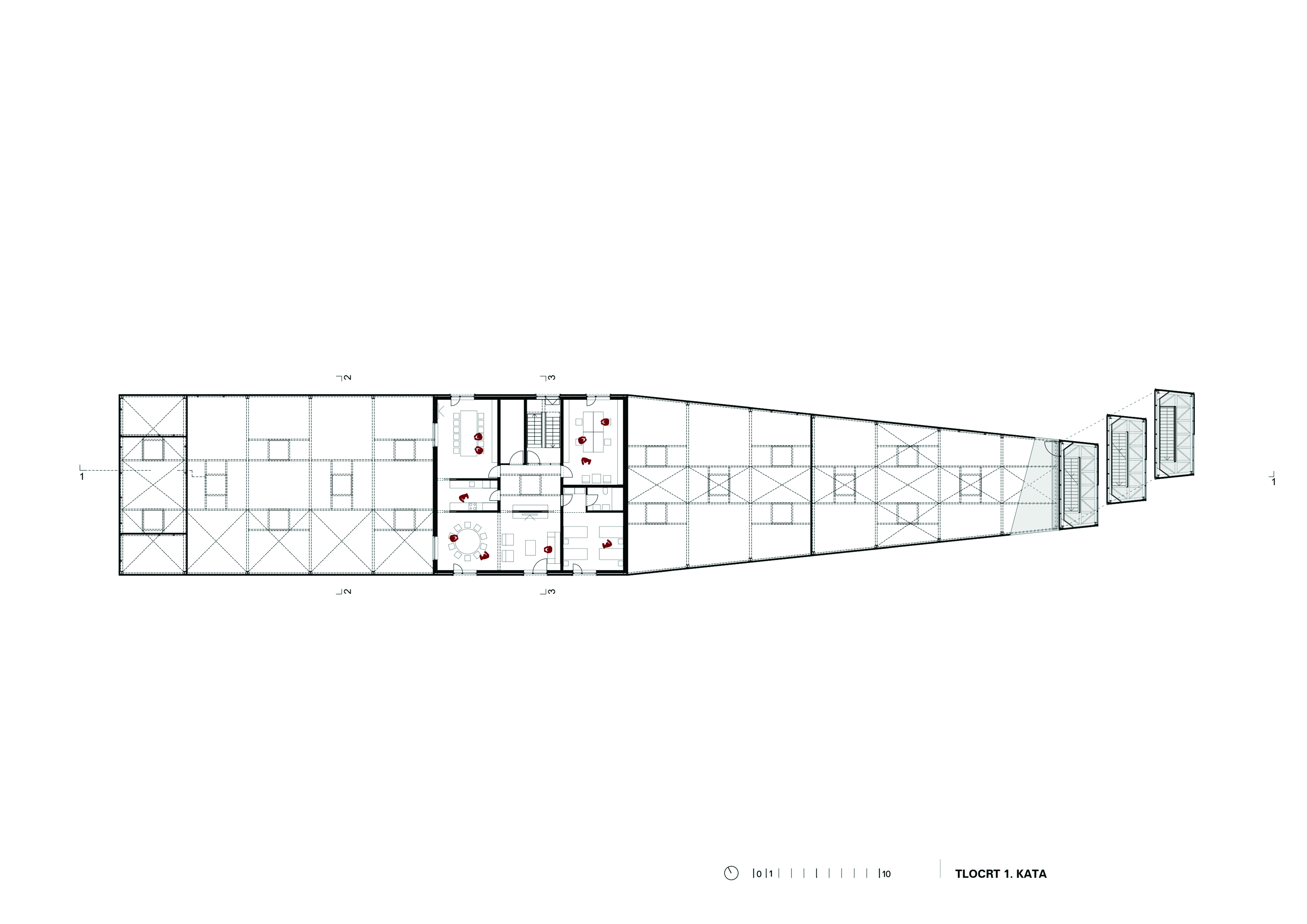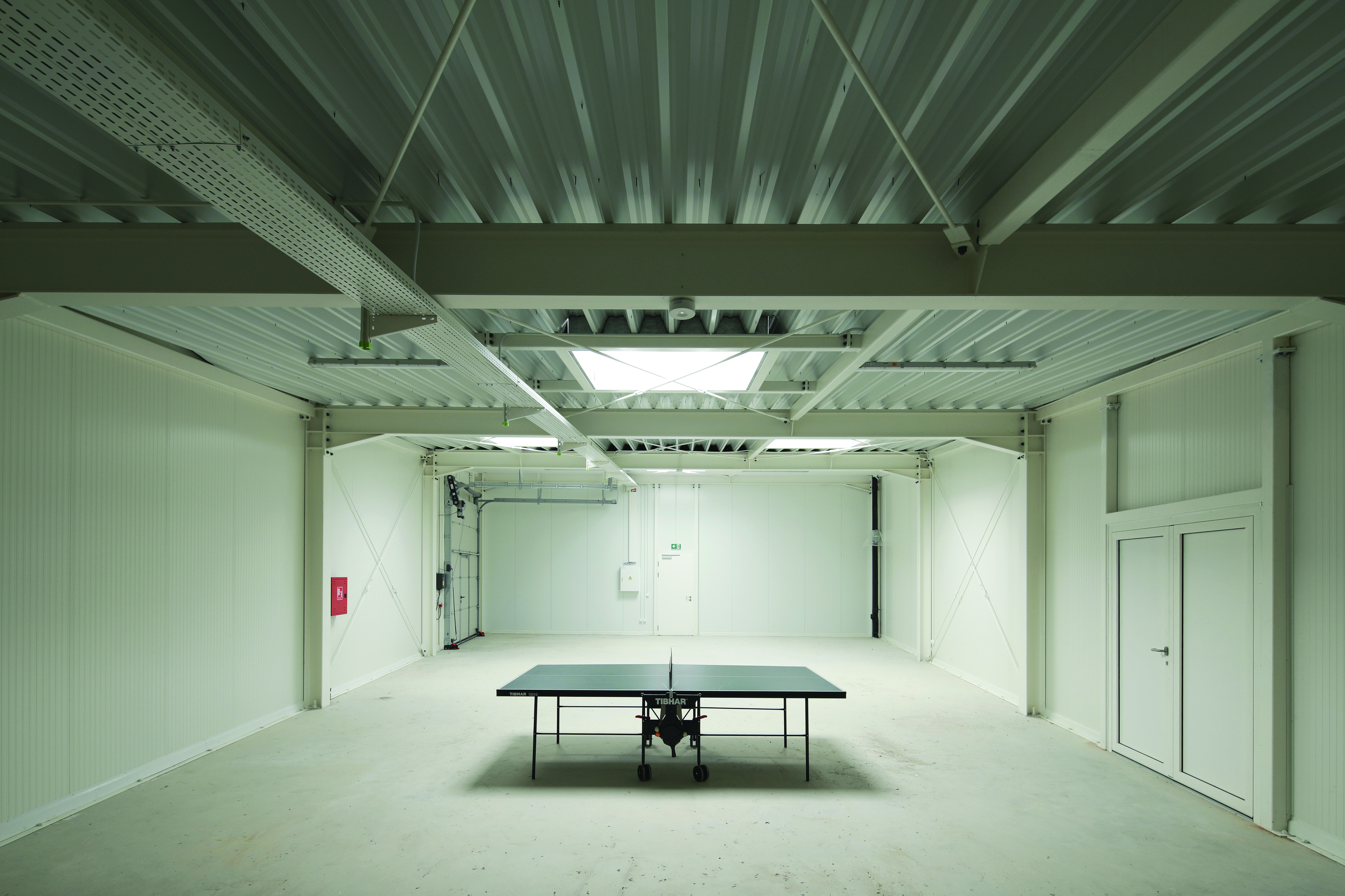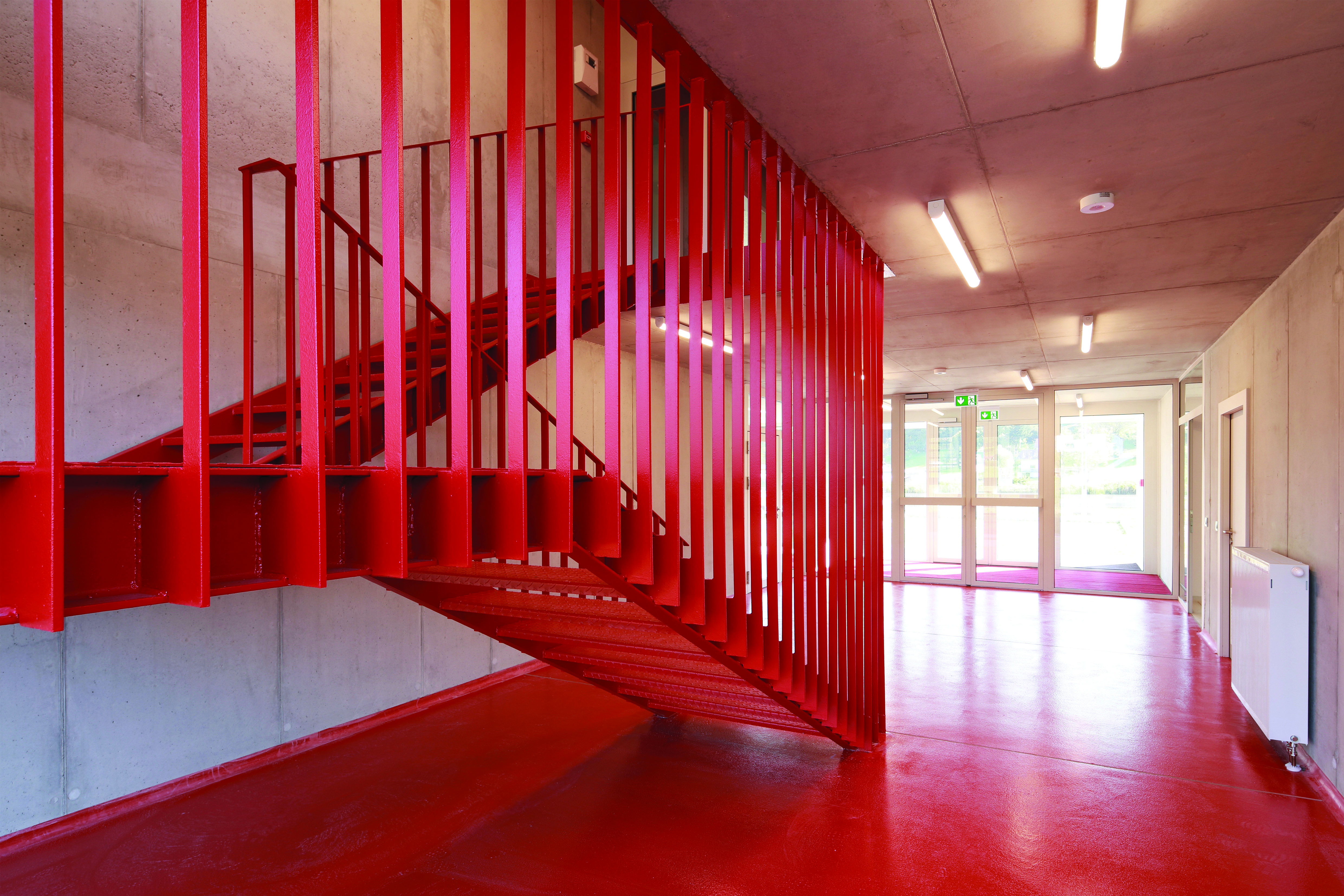 Bijelu limenu ovojnicu nosi kombinacija armirano-betonske jezgre i lagane čelične konstrukcije. Materijali jasno označavaju namjenu pojedinih prostora – bijele metalne ‘sobe’ nastanjuju vozila, prostori u sirovom betonu namijenjeni su za rad i boravak, a intenzivnom crvenom bojom označeni su prostori kretanja vatrogasaca.