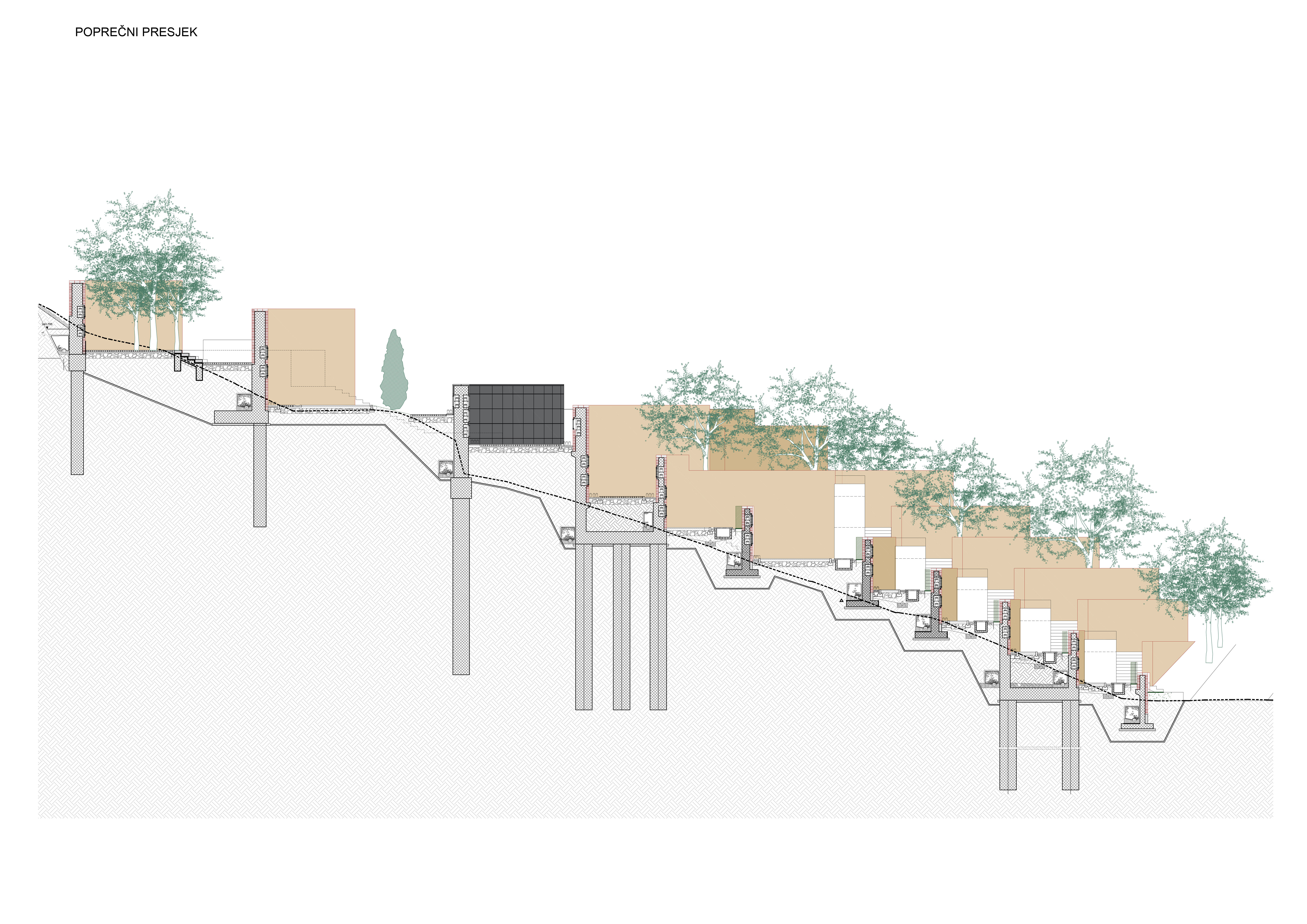 Na predmetnoj lokaciji se predviđa izgradnja kolumbarijskih zidova s nišama za smještaj urni koji prate slojnice i nagib terena. Pružajući se u smjeru jugoistok-sjeverozapad, i prateći kaskadno spuštanje terena, između sebe stvaraju prostore zelenila i odmora. Tako nastaju aleje koje sadrže nizove grobnih kazeta za urne, i koje su kontinuiranim pješačkim putevima povezane s okolnim prostorom. Svi kolumbarijski zidovi su i potporni zidovi u funkciji sanacije klizišta.