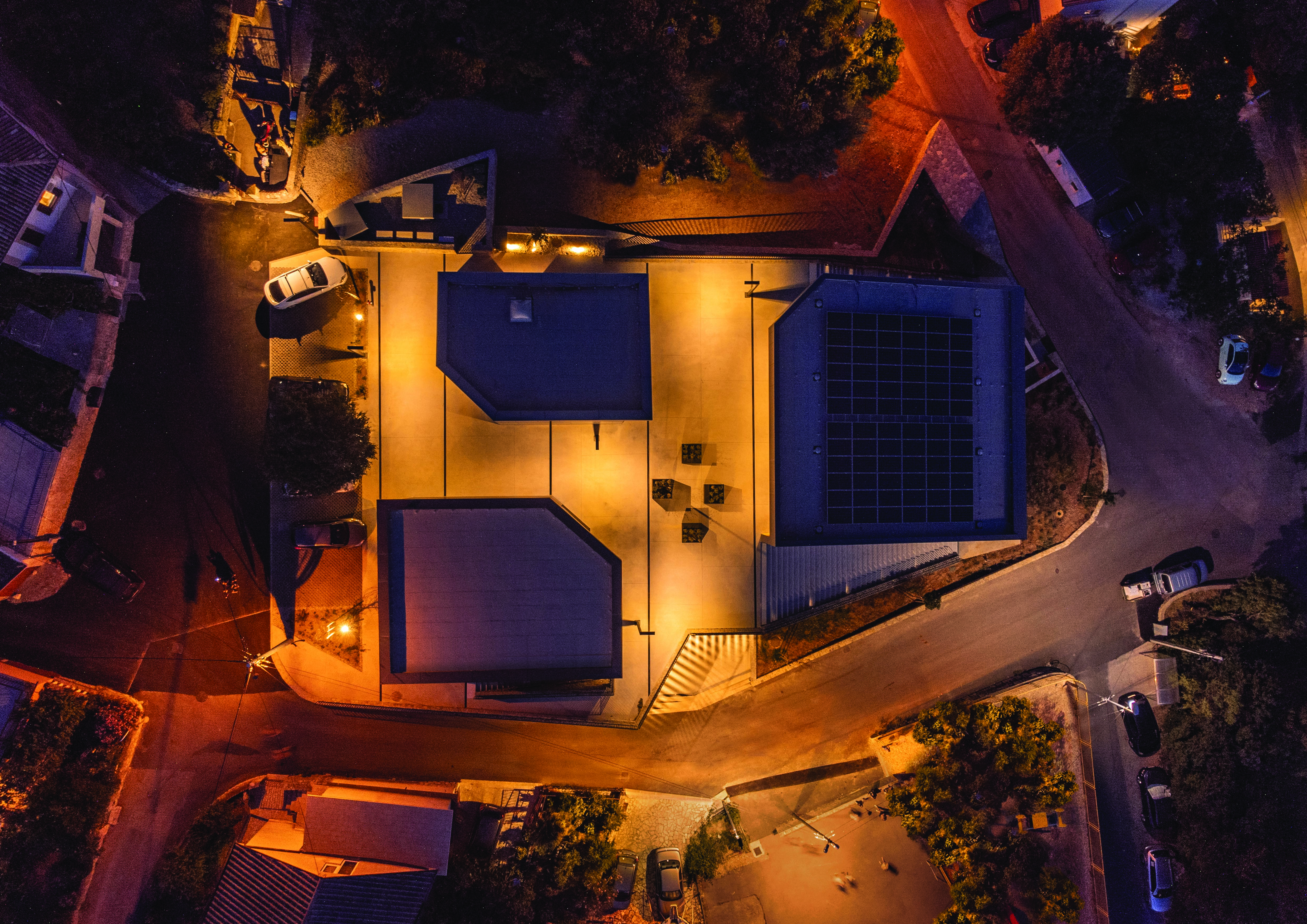 Nedaleko Crikvenice, skoro na vrhu brda, na granici između neba i mora,smjestilo se mjesto Ladvić, mjesto s nevjerojatnim pogledom na Kvarner, Krk i Učku u kojemu se tišina najčešće izmjenjuje s hukom vjetra. To je mjesto s manjim kućama, za sada nezagađeno s pretjeranom turističkom izgradnjom, gdje se domaći ljudi još druže, a normalno je kad se ljudi druže da se popije malo vina i zaigra na boće. Iz tog druženja nastala je respektabilna boćarska momčad koja žari i pali na prvenstvima, a kada se neki rezultati ostvare potrebno je i kroz cijelu godinu biti u formi. Zatvorena dvorana nameće se kao najlogičnije rješenje. Kako je mjesto usitnjeno i razbacano kod razmišljanja o konceptu kao prvo i osnovno uzela se želja da se dvorana usitni u mjerilo samog mjesta, da svojom glomaznošću ne postane dominantna, da selo ne nestane pod dvoranom. Materijali koji su korišteni su dvojaki, dok je „baza“ izrađena od kamena, u skladu sa suhozidima kao tradicionalnog materijala potpornih i ogradnih zidova, volumeni su od vlakno-cementnih ploča. Tri različite nijanse volumena naglašava kako različitost tih volumena u oblikovnosti tako i u namjeni potvrđujući rahlost strukture kao temeljne konceptualne postavke uklapanja u polu urbani okoliš. Osim asfalta i pijeska koji su osnovni materijali za boćalište ostali materijali koji su korišteni u unutrašnjosti naglašavaju suvremenost kuće, u „kontri“ su s tradicionalnim korištenjem materijala izvana, sa staklenim, reflektivnim plohama kao i apstraktnim platnima akustičkih ploča obojenih u žutu boju kao službenu boju Boćarskog kluba Ladvić, ali i Grada Crikvenice i crne boje kao „podloge“ za ostale prostorne atrakcije i pomalo zbunjujućeg natpisa BKGK-L , što znači Boćarski klub Gornji kraj – Ladvić. U međuprostoru te usitnjene strukture formirao se i trg s kojeg se lako pristupi samoj dvorani, ali i trgovini, kafiću, mjesnom odboru i klupskim prostorijama. Sve to zajedno potencira okupljanje i susret što većeg broja ljudi čime ovaj prostor postaje i glavni trg, a Ladvić napokon dobiva šansu da se tišina prekine žamorom ljudi uz lupanje boća u dvorani na koju se pruža pogled s trga.